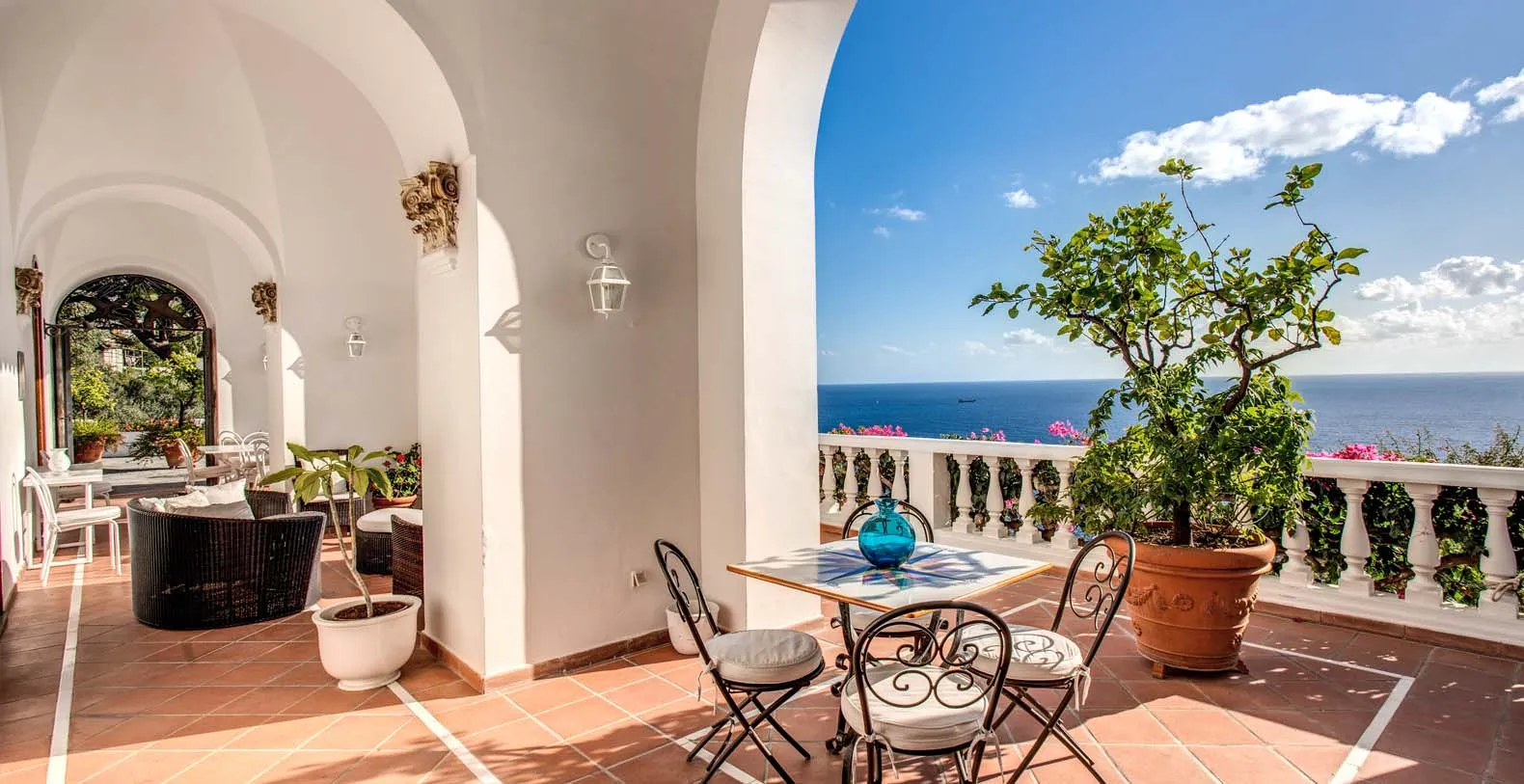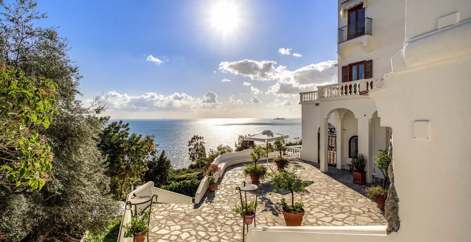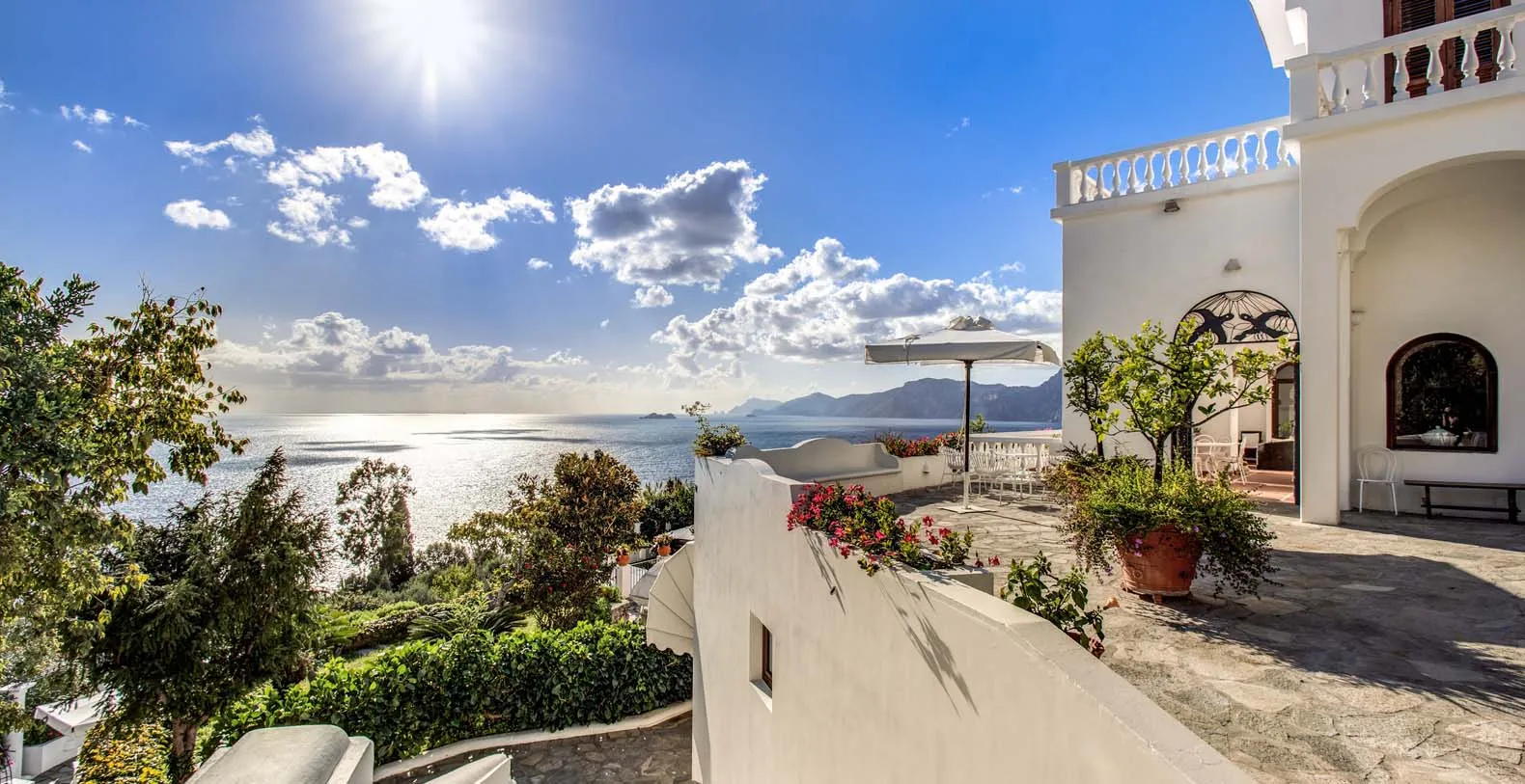 The amazing Villa Bideri is an Italian retreat located in a secluded and private area, perched up on the Amalfi Coast right in the centre of the village of Praiano.The Villa has a perfect location to explore the Amalfi area: 6.5 km to Positano, 8 km to Amalfi, 30 km to Pompei and 70 km to the Naples Airport. Villa Bideri is located just a few steps from the restaurants, bars and main shops. You will find the nearest restaurant 50 mts away, the SITA bus stop for the Amalfi Coast – Sorrento line – is a few meters away and the nearest beach is within easy walking distance. Surrounded by large terraces with Mediterranean plants and flowers, the villa boasts impressive views of the sea from Salerno bay to Capri, and Positano to Amalfi. About 150 meters from the villa begins 2 paths of steps that descend to the 2 main beaches of Praiano, one is near the Saracen Tower and the other is the Gavitella beach. Both the beaches are a 7/8 minutes decent down the steps. Here you can rent beach chairs and umbrellas and there is also a restaurant and a bar.
