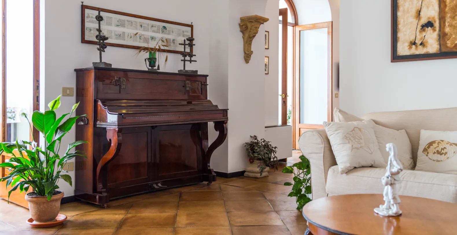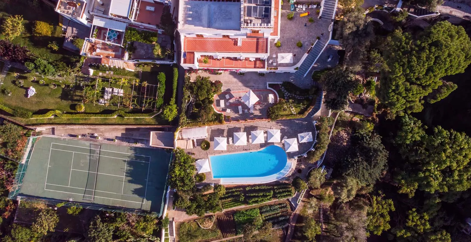 The ground floor consists of: a shady terrace runs all along the floor, a fully equipped kitchen with fridge, freezer with ice maker, large oven, microwave and dishwasher, laundry (washing machine can be used only by the staff); a powder room; a large living room with sofa and a cozy study area facing on the terrace; a dining room opening on the terrace. The dining room has a large table with glass top, seats 12, the room is decorated with original fragments of columns and Roman remains. The main floor is furnished with antique furniture, a marble table, a grand piano, sofas and a fireplace. The villa offers up to 8 bedrooms and accommodation is spread across the main residence and the villa’s Tower, where select bedrooms enjoy a more private setting within the estate.