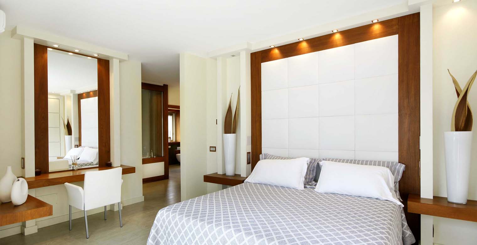 The entrance leads also into the living room from where a sliding glass door opens onto the terrace facing the picturesque olive trees. In this area we find the first three bedrooms with en-suite bathrooms, a gym area with pull-up bed (suitable for teenagers).