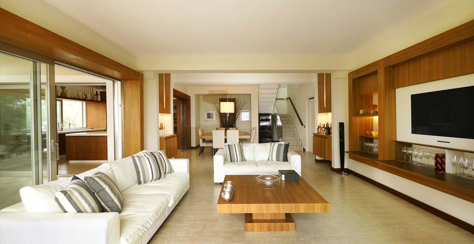 At the entrance of main floor there is a spacious and inviting lounge offering a wonderful space for guests to be together and relax. The space is cosy and welcoming and is furnished with two large leather sofas and a table, a built-in, flat screen SAT-TV and large, sliding glass doors opening onto the terrace surrounding the house.