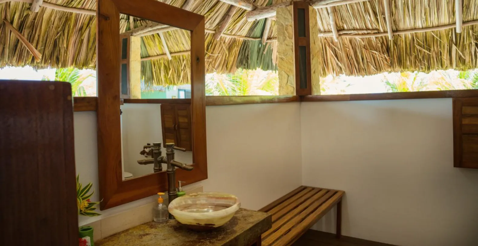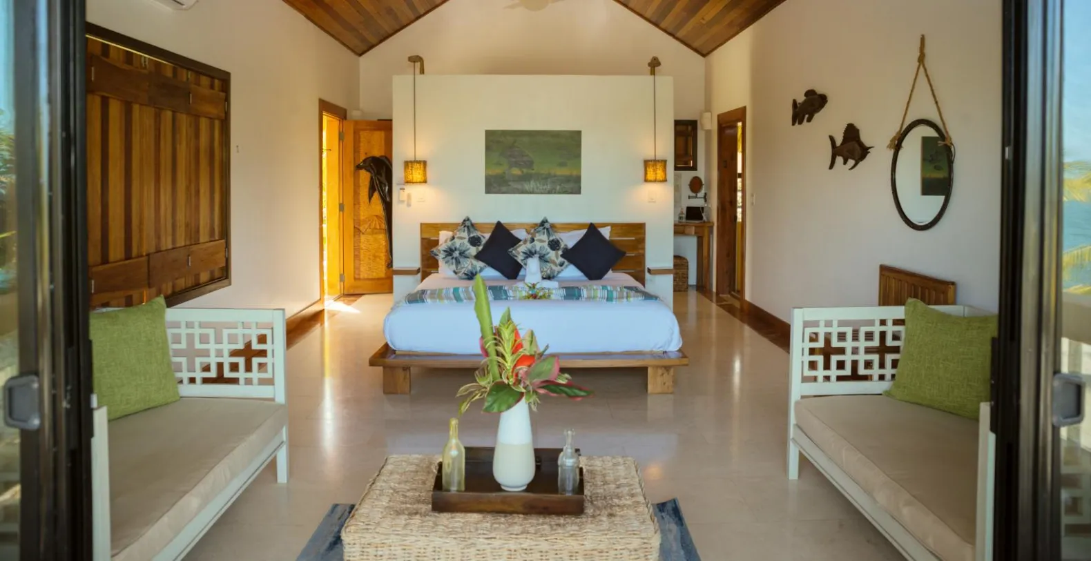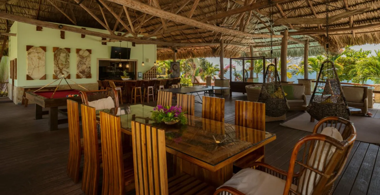 Designed with comfort and sustainability in mind, the island features five beautifully appointed private suites, each with spacious open-air thatch-roof bathrooms that embrace the surrounding natural beauty and capture the cool trade winds. The layout is thoughtfully planned to maximize sea and mountain views while maintaining privacy for every guest. At the heart of the island, a large open-plan living area with a palapa roof creates a welcoming social hub, complete with a bar, billiard and ping-pong tables, lounge areas, and a dining space that opens out to the stunning infinity pool overlooking the Caribbean Sea.