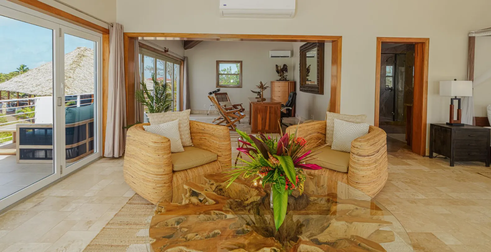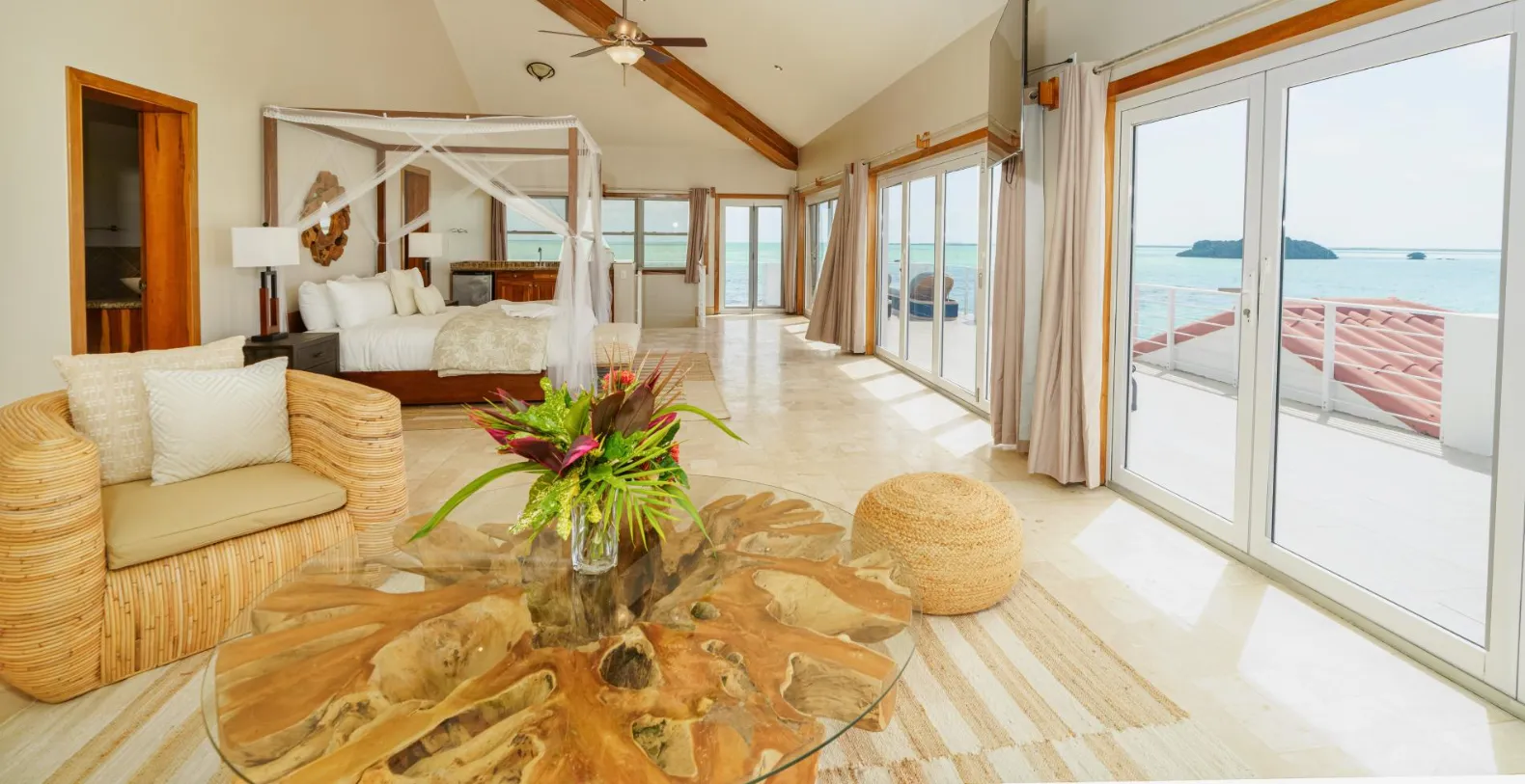 The island is thoughtfully designed to bring people together while allowing ample space for privacy. Modern Caribbean architecture blends with natural textures and soft coastal tones to create an atmosphere of relaxed elegance. A collection of charming beachfront villas lines the water’s edge, each with red-tiled roofs, large windows framing stunning sea views, and direct access to the sandy shoreline. Inside, light-filled interiors offer spacious living areas, well-appointed bedrooms, and contemporary comforts throughout.