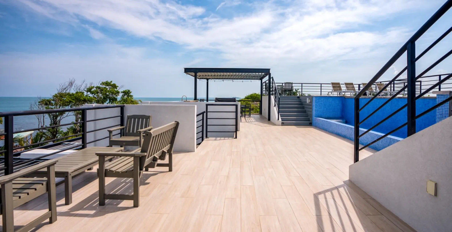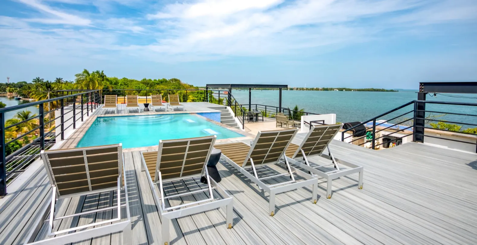 Each of the 4 units has been professionally decorated and furnished inside and out with all the comforts of home. Each unit has a fully stocked kitchen, washer & dryer, large flat screen smart TV's in living room and each bedroom, fully air-conditioned, cable TV & high-speed internet, outdoor gas grill and covered outdoor balconies on both the sea and street sides of the units. There is a rooftop living area which is a great place for gathering. The place is amazing with infinity edge pool, custom made metal shade structures and is fully furnished with high end pool furniture, lounge areas and dining tables. It also includes an outdoor kitchen and bar overlooking the ocean. The panoramic ocean and mountain views from the roof top deck are incredible.