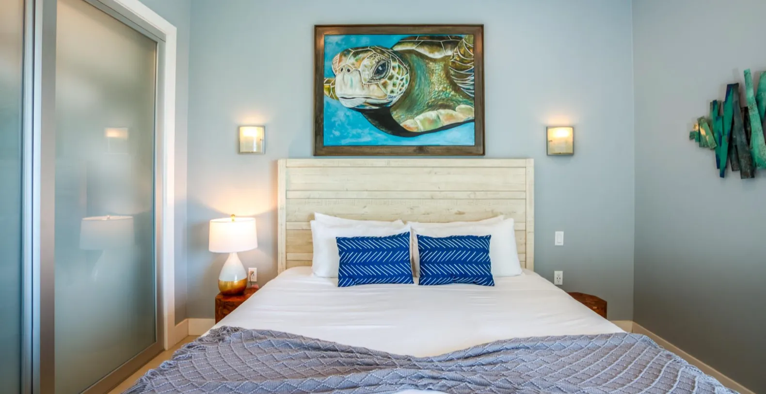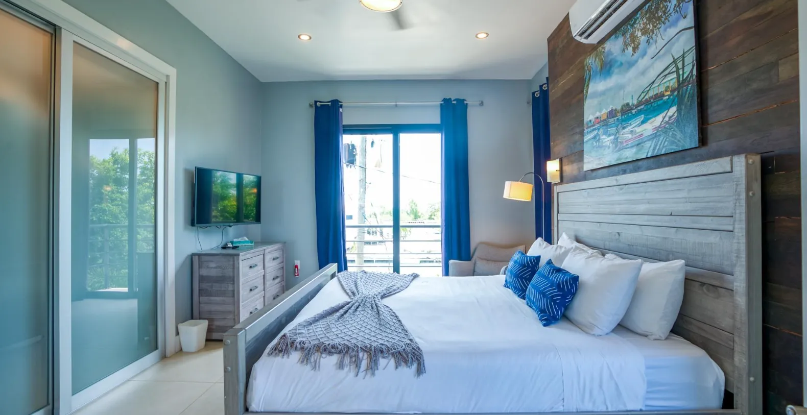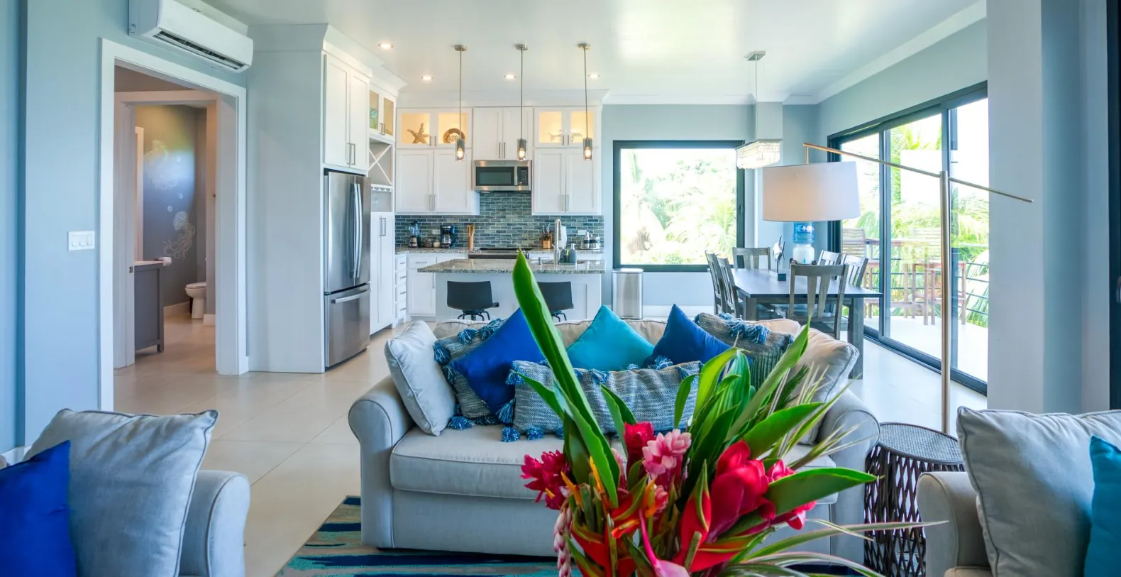 Each of the 8 spacious bedrooms has a king bed, ensuite bath, private patio, its own ac unit and large flat screen smart TV. There are two chairs in each of the 4 living rooms that each pull out into single beds that are designated for kids use only. The condos are perfectly located in Placencia Village, close enough to walk to all the shops and restaurants in the Village, yet on a private and quiet street without the traffic and noise, typical of most other properties in the Village.