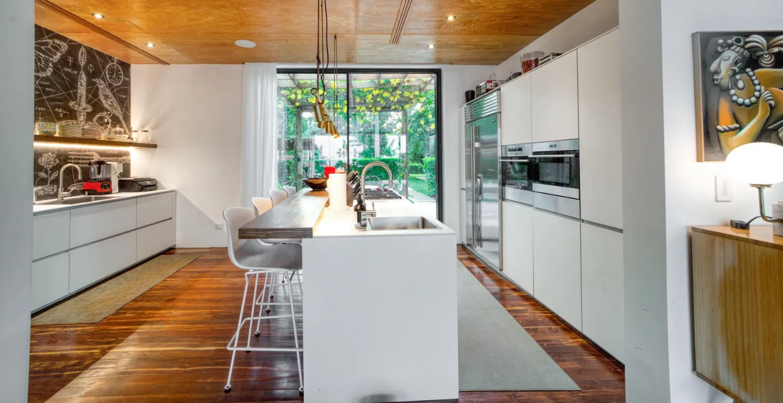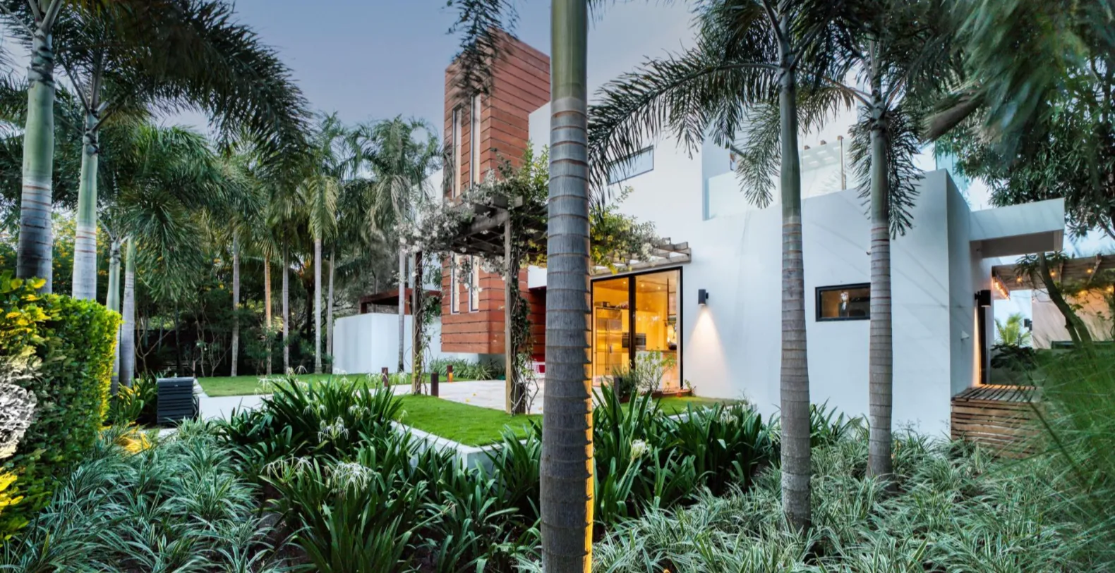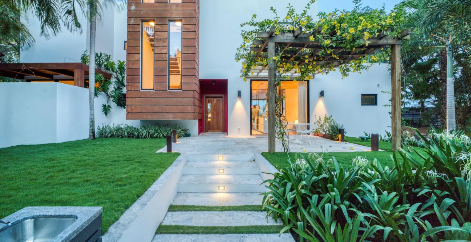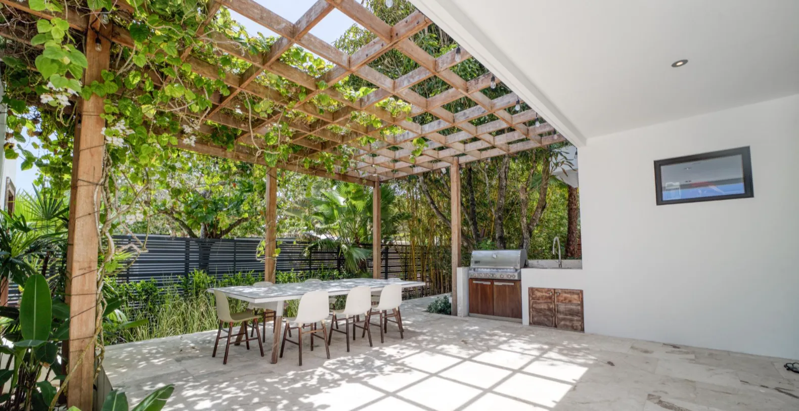 The Beach House offers a great vacation base in this magical village. Spanning 4,500 square feet in the main house, plus a 550-square-foot poolside accommodation, the villa offers five bedrooms and 4.5 bathrooms, comfortably hosting families and groups of friends. Each bedroom has been thoughtfully designed as a private sanctuary, furnished with plush beds and elegant wooden pieces. The ground-floor master suite boasts a spa-inspired en-suite bathroom with dual sinks, a walk-in glass shower, and a private open-air rainfall shower surrounded by lush foliage. Three additional bedrooms are located upstairs and a private guest retreat in the pool house features a king-size bed and bathroom with dual vanities and modern finishes.