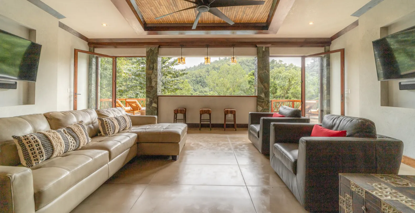 The expansive open-plan living area blends indoor and outdoor living seamlessly. A cozy lounge with leather and woven seating centers around a rustic wooden coffee table, perfect for relaxing after a day of exploration. The adjacent dining area features a hand-carved wooden table overlooking the treetops, ideal for unforgettable shared meals. The fully equipped chef’s kitchen is both beautiful and functional, with polished dark stone countertops, custom cabinetry, high-end stainless-steel appliances, and a large island with bar seating. Whether guests choose to prepare meals themselves or enlist staff assistance, this kitchen is built for entertaining.