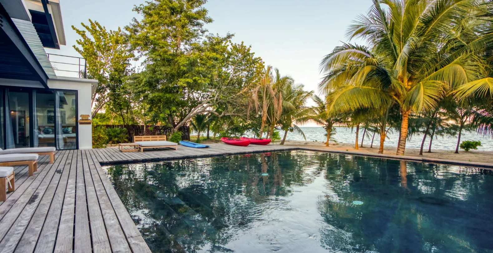 Step outside to a sprawling pool deck that overlooks the beach and ocean. Comfortable loungers line the deck, inviting lazy afternoons beneath swaying palms, while the beachfront setting offers direct access to the warm Caribbean waters. Guests are provided with beach equipment and multiple water activities are available for ocean lovers. For panoramic views of the surrounding ocean, lagoon, and Maya Mountains, the villa’s expansive rooftop deck offers the ultimate elevated escape. With stylish lounge seating, it’s the perfect place to soak up the sun, stargaze under the Belizean night sky, or simply unwind in total privacy.