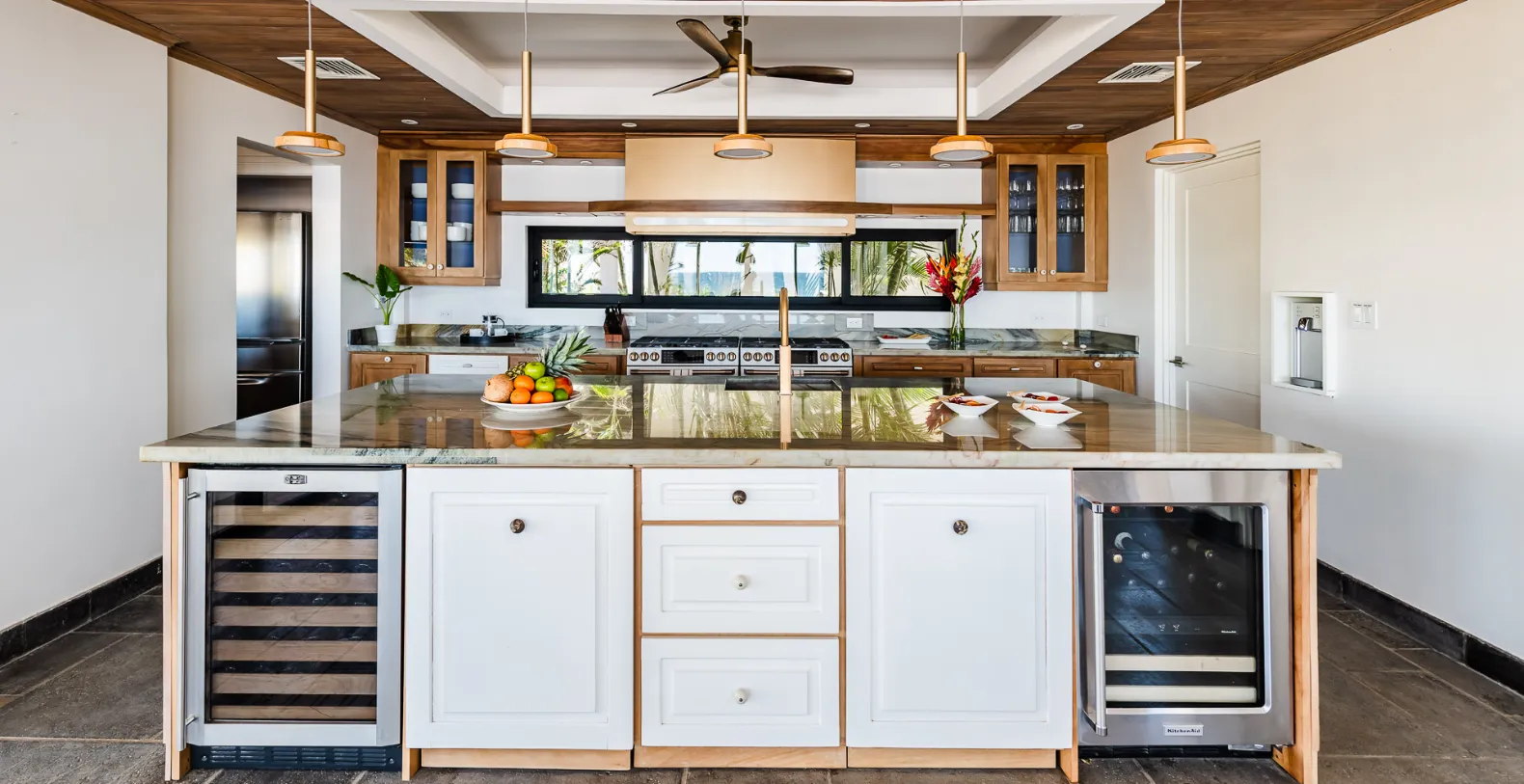 Step through an open-air hallway lined with water gardens and palms, and enter expansive living and dining areas that open to breathtaking ocean views. The villa’s state-of-the-art kitchen, infinity-edge pool, and ocean-view gym create an idyllic setting for both relaxation and entertaining. The villa feature seven bedrooms and each of the suites offers ultimate privacy, featuring floor-to-ceiling glass doors, private patios, and luxurious bathrooms. Five suites include indoor-outdoor showers that invite guests to connect with the surrounding tropical landscape and the Master suite is true private sanctuary. Positioned on the second-floor the studio offers a private bedroom with king size bed and bunk bed, private living room and kitchenette opening to a terrace with stunning views. The villa accommodates up to 17 guests (base rate includes 12 and for any additional guest extra fee applies).