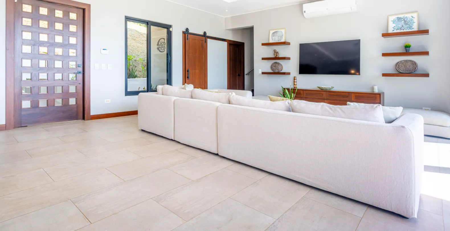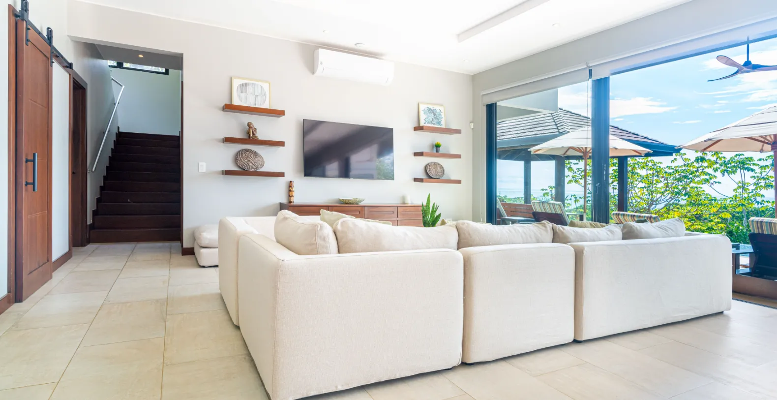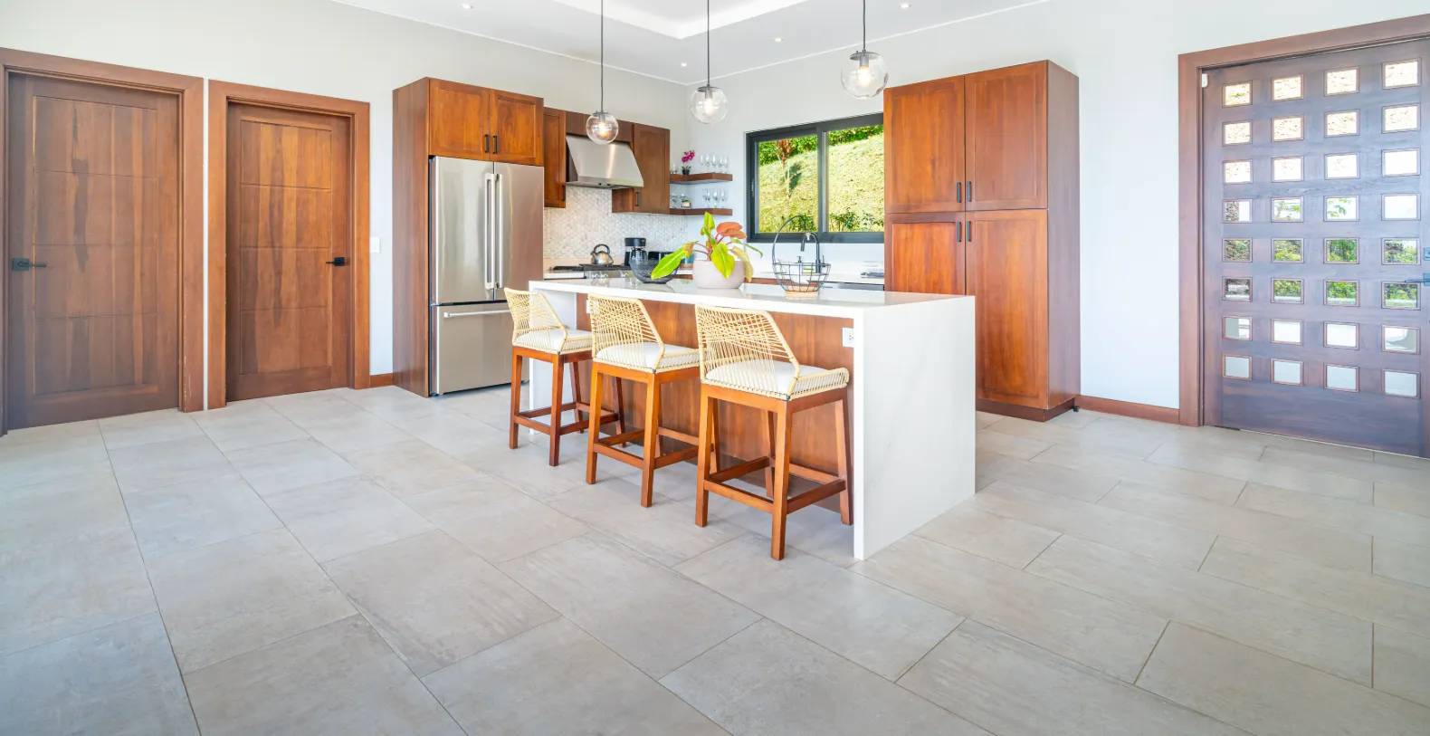 Inside, the open-concept living area seamlessly connects the fully equipped kitchen, dining area, and lounge, creating an inviting space for gatherings. The kitchen is designed for both casual and gourmet dining, with high-end appliances, ample counter space, and a large island with seating. Casa Solaz spans an impressive 3,000 square feet, offering ample space for relaxation, entertainment, and privacy. The interior design balances luxury with earthy tones, bringing the warmth of Costa Rica indoors. Thoughtfully placed decor elements and comfortable furnishings make this villa a true home away from home.