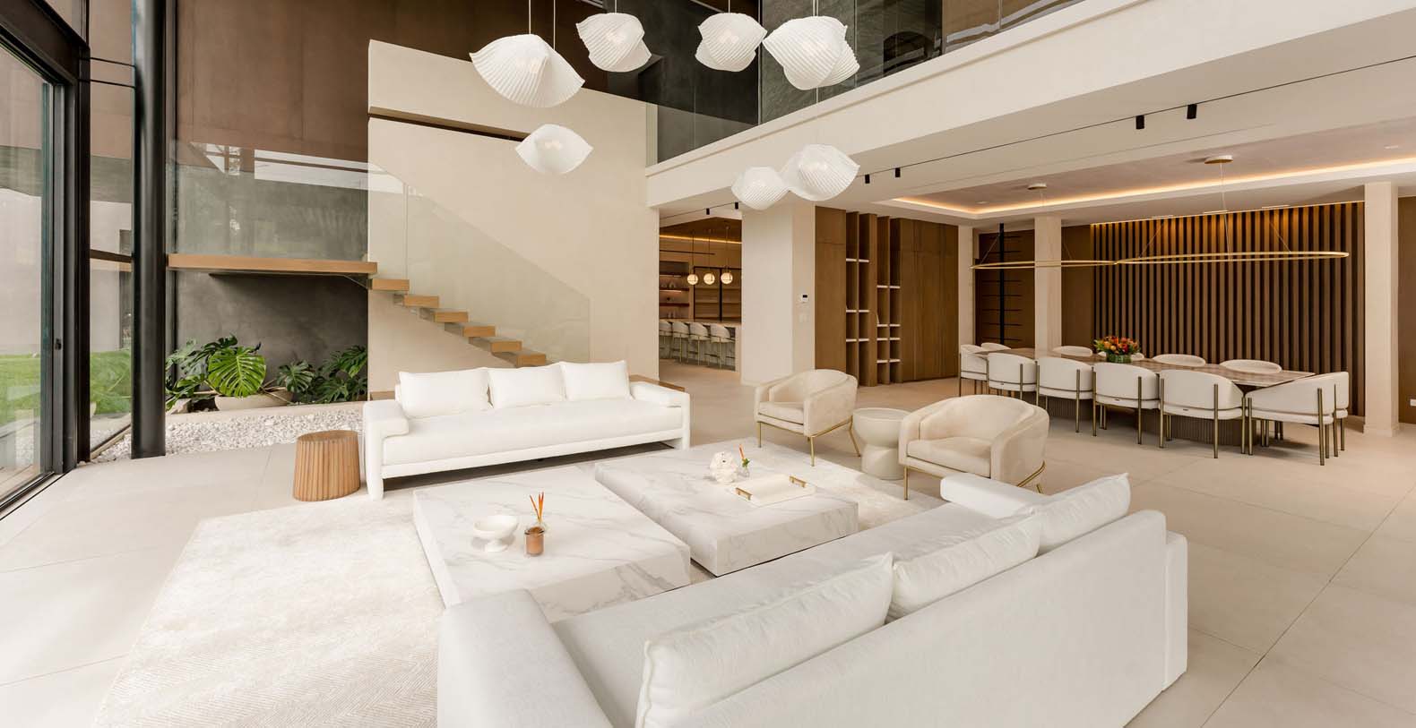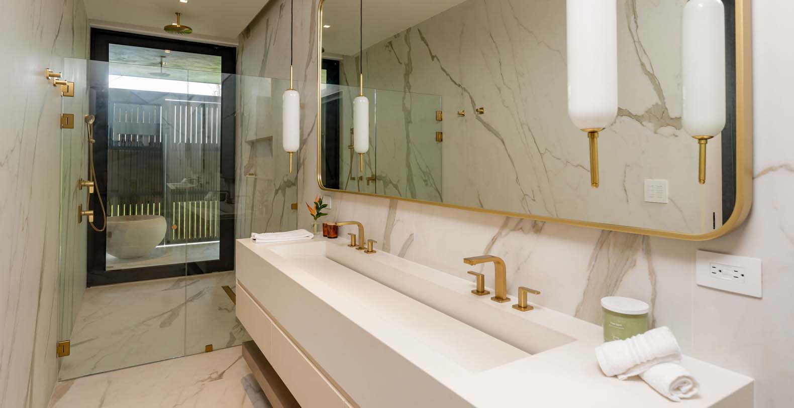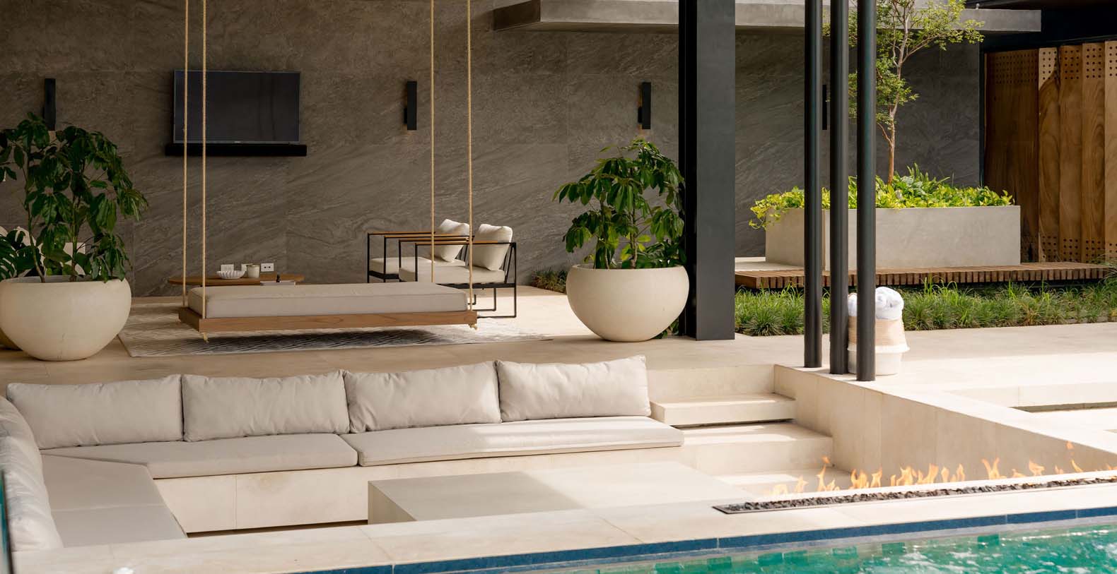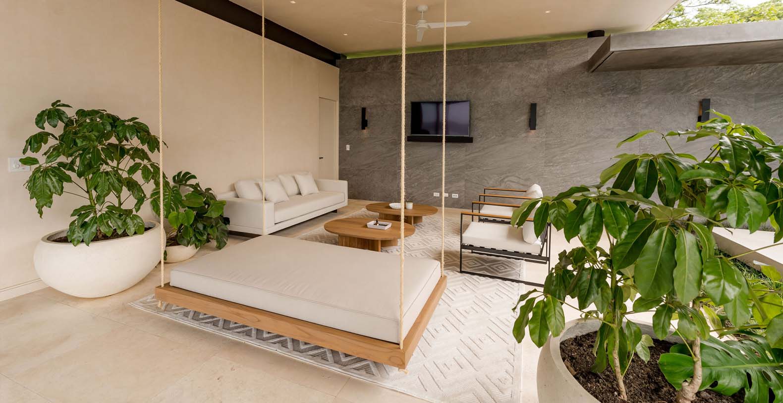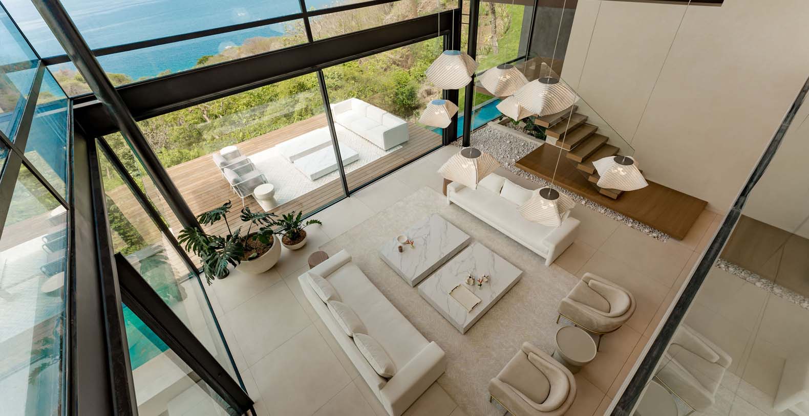 Perched on the cliffs, Villa Enoki commands panoramic vistas of the Pacific Ocean, captured through expansive, floor-to-ceiling windows that frame each breathtaking view. Its minimalist aesthetic, characterized by sleek lines, merges seamlessly with the vibrant tropical flora, instilling a sense of tranquility and serenity throughout. Upon entering, guests are enveloped in an aura of sophistication and elegance. The villa's grand living spaces, adorned with designer furnishings and select artworks, beckon guests to relax in the utmost style. The expansive, open-plan areas, enhanced by high ceilings and natural materials like wood and stone, evoke warmth and richness in every corner.