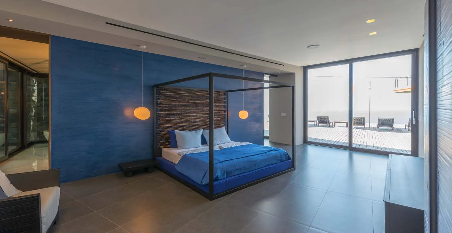 The master bedroom suite is entered from the main terrace, the loggia, or through one of the master studies via a private reading room. A unique feature of the master suite is a completely private, sunken Zen garden with an outdoor shower, which opens off the master bathroom. This creates an exotic retreat in which to bathe and relax.