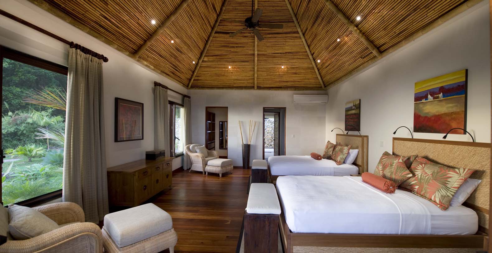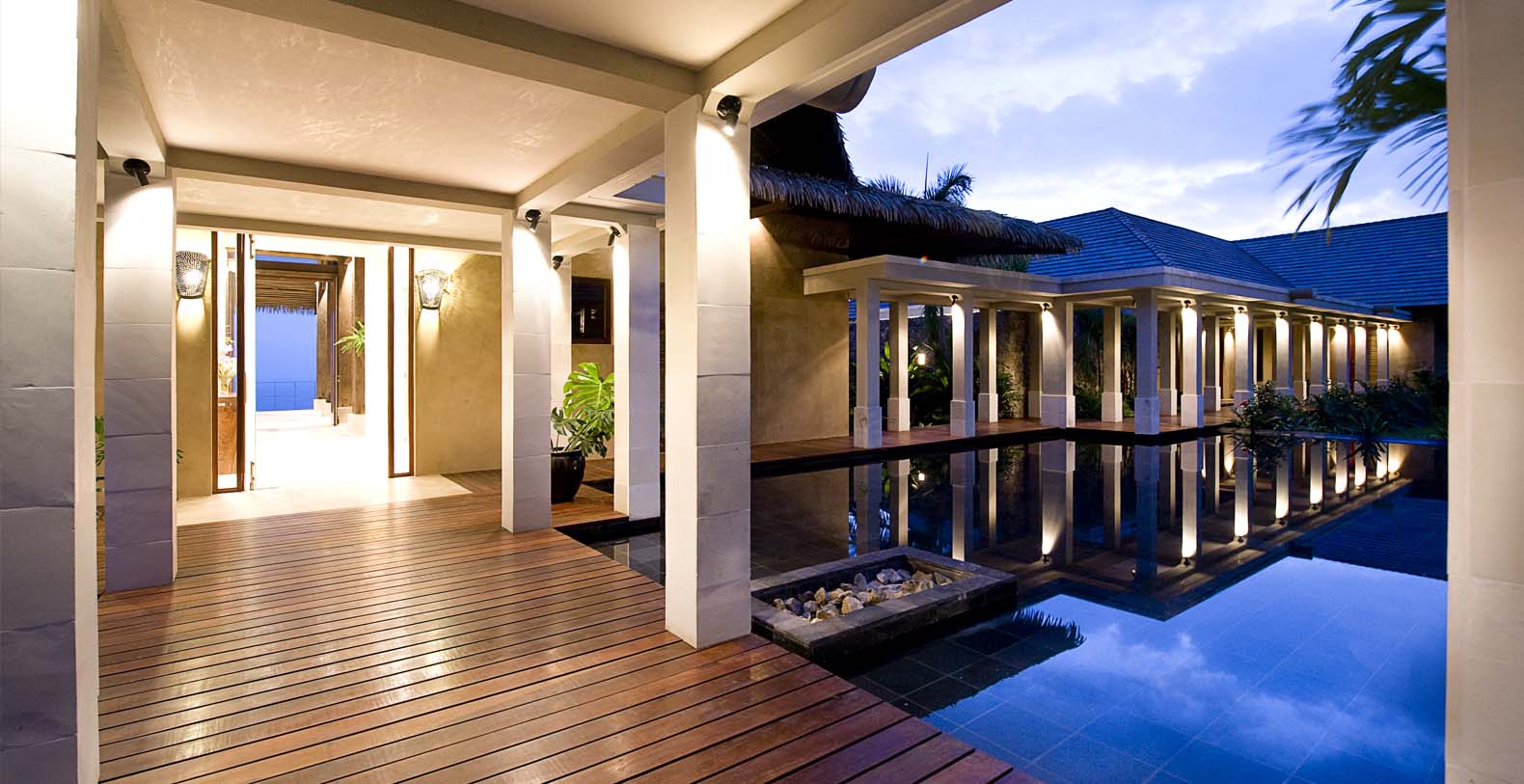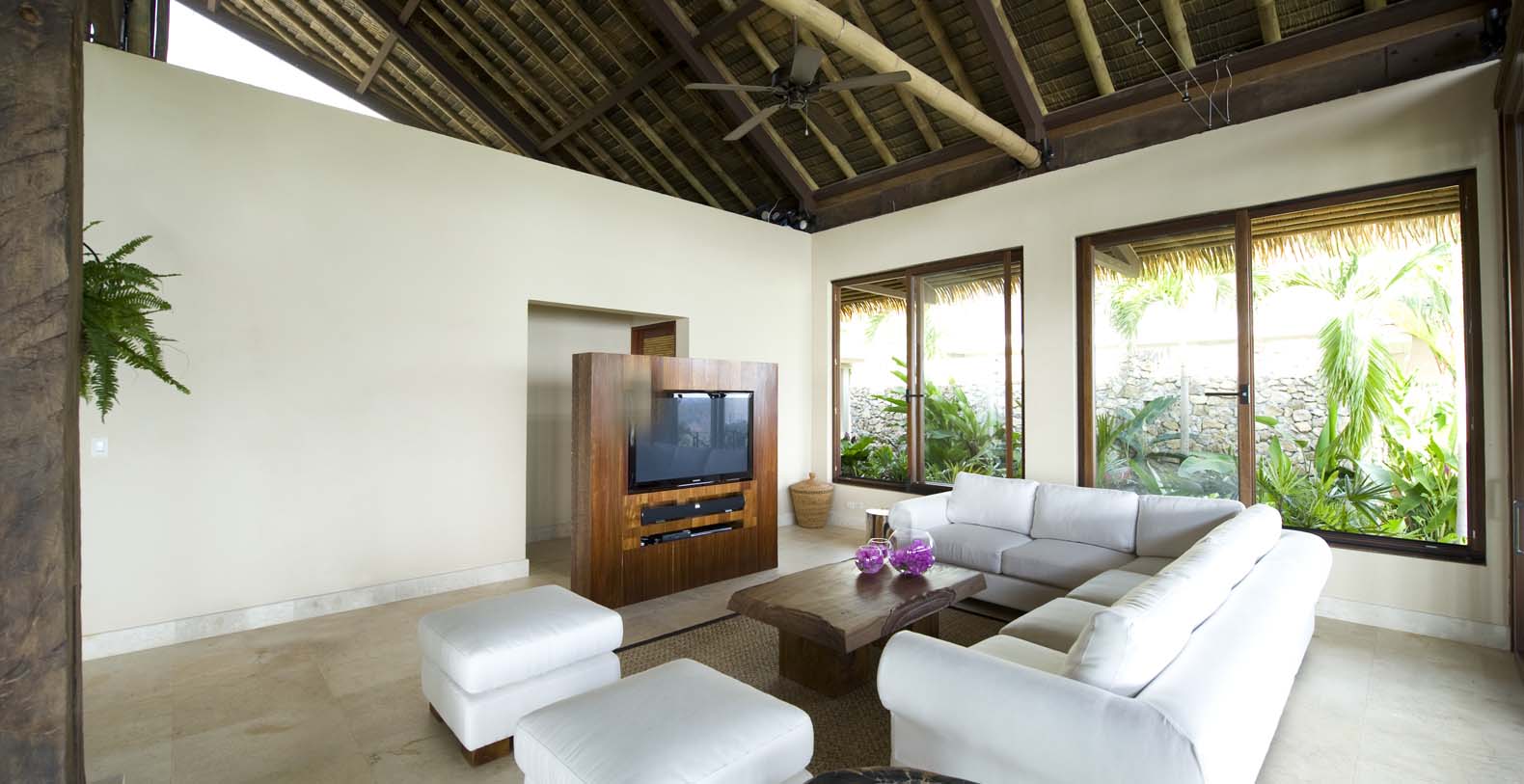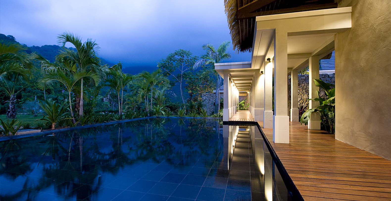 Villa amenities include open-air dining and living pavilions and a 3,000 square foot free form, infinity-edge swimming pool with natural hand-cut Javanese stone tiles, bordered by broad terraces leading to secluded lounging areas A natural fire pit is sited below the pool and hidden from the main residence specifically for enjoyment of spectacular tropical sunsets and conversations continuing through evenings spent under mesmerizing skies, far removed from obscuring city lights.