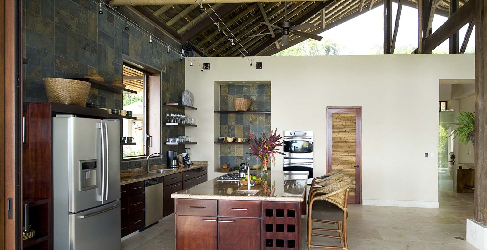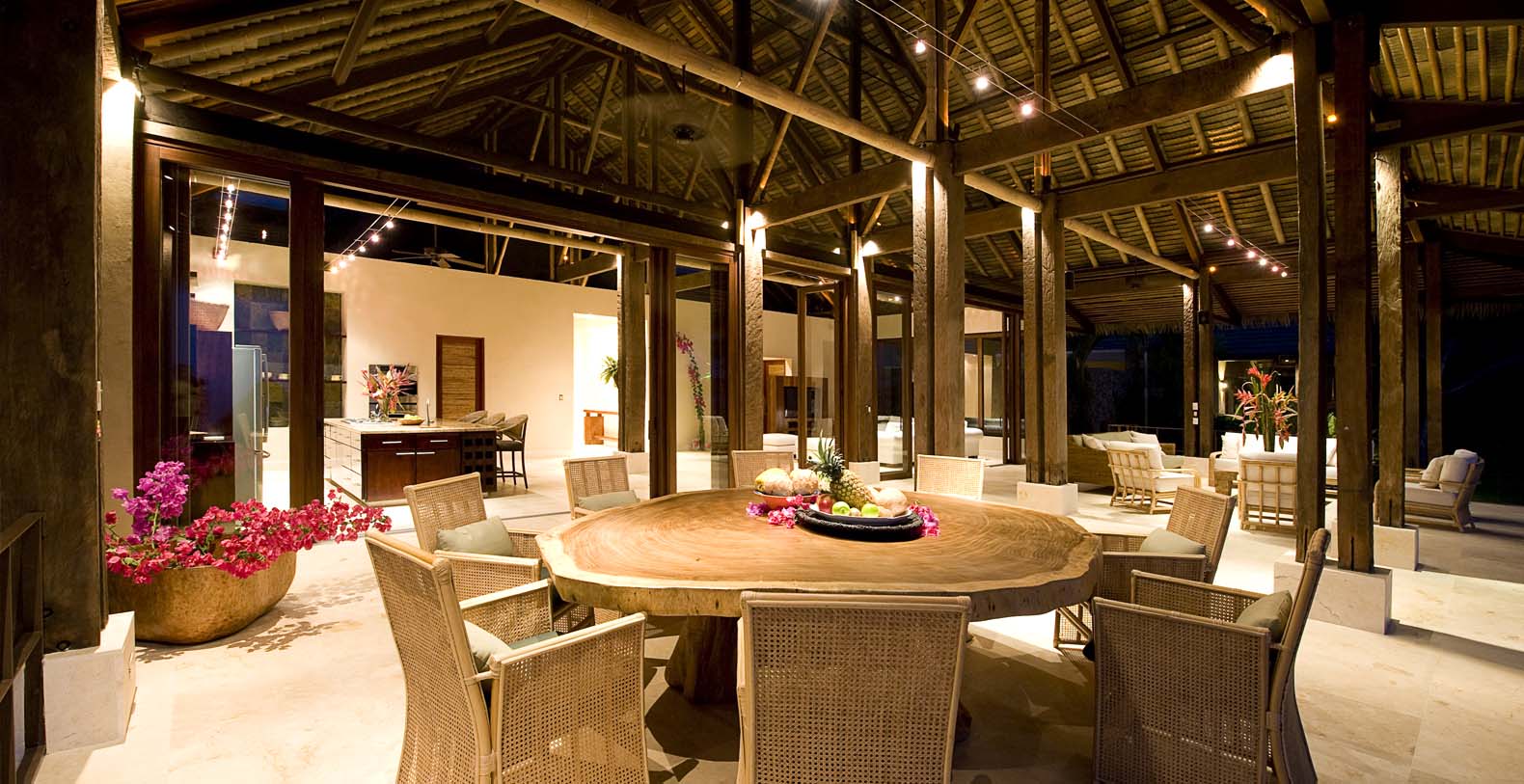 The upper terrace features an open kitchen and adjoining family room with a large-screen TV, both of which can be enclosed by sliding glass window-walls. From the open-air dining room and adjoining living pavilion enjoy uninterrupted vistas of the ocean, sunset and forested hills. Mayana's kitchen is fully equipped and stocked in advance as requested by guests. Guests can request complete privacy or opt for a full complement of services. If desired, meals featuring local and international cuisine can be prepared and staffed to meet your specific requirements