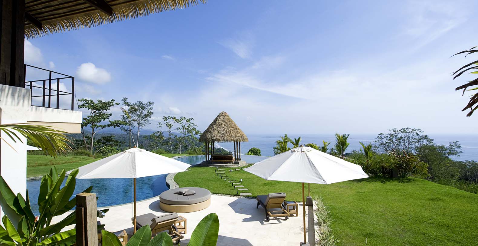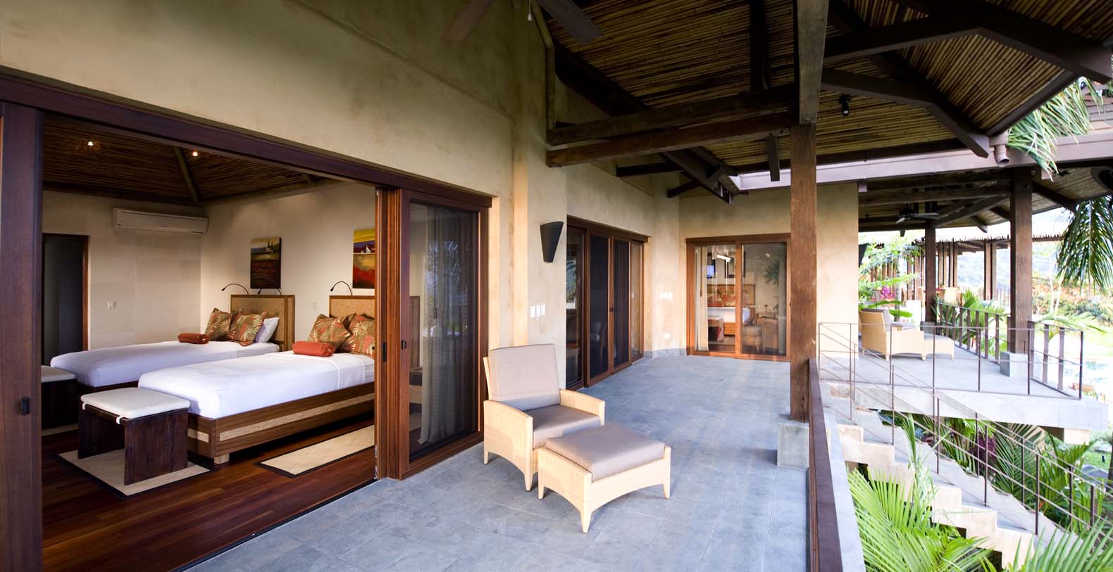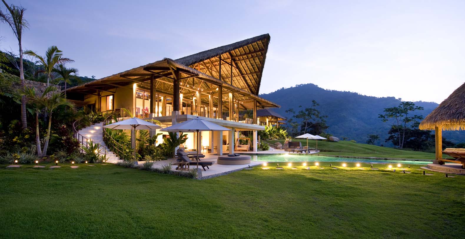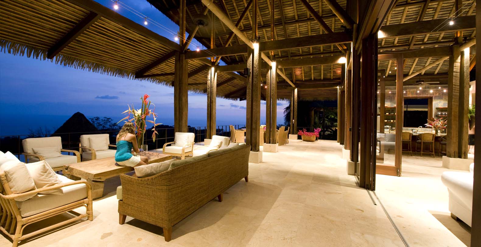 The 30-foot high thatched cathedral ceiling of the central living area allows unimpeded views of the expansive surroundings and horizon. Mayana's construction fits perfectly into its majestic setting as a mountain/beach retreat of incomparable beauty and scale. The liberating 270-degree vista provides fantastic views of the sunset, stars and exotic local flora and fauna, including toucans, hawks, coatis and howler monkeys. A short drive along the coast to Domenical, Uvita and Ojachal provides easy access to restaurants, shops and local entertainment. Mayana in Costa Rica is beautifully furnished, fully equipped and offers concierge services on site. Each of the four master suites features large private terraces with stunning views of the ocean and jungle, indoor and outdoor garden showers, air conditioning and large walk in closets. Mayana offers casual, comfortable living areas, both fully air-conditioned and open to the natural surroundings. Incorporating the connecting salas, one located in each wing between bedrooms, can be utilized to accommodate 16 guests in 6 bedrooms.
