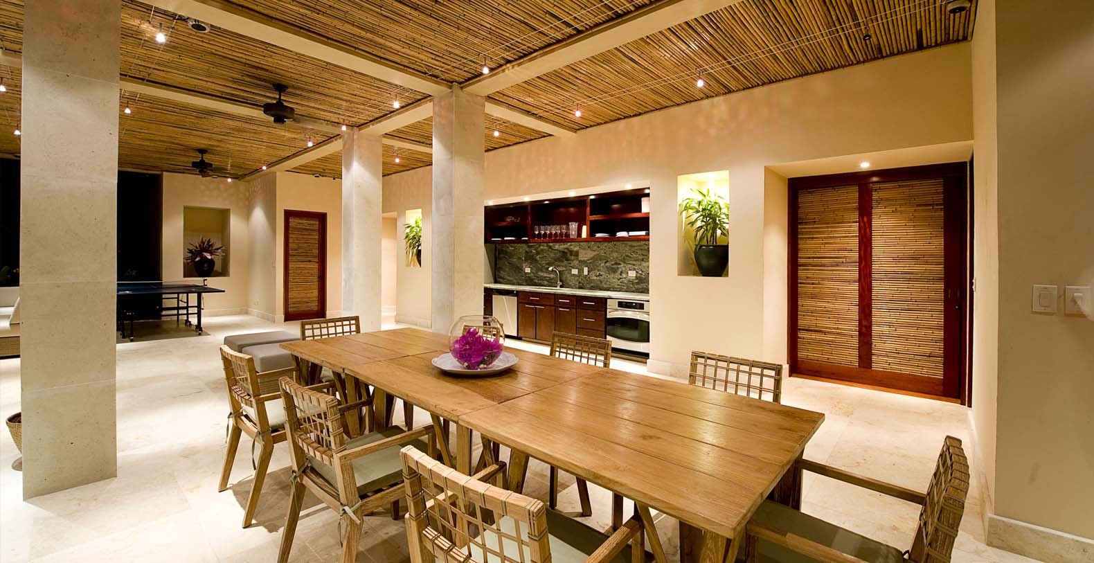 Framed by twin, gently curving marble staircases, the central lower level features a second kitchen and both open and covered lounging areas perfectly suited for games, barbeques, ping pong, massages, and informal meals. Mayana's private setting, its extraordinary resources and breathtaking panorama make it a perfect venue for vacations with family and friends, intimate weddings or special gatherings and events. Special arrangements to suit your exclusive needs may be provided upon request.
