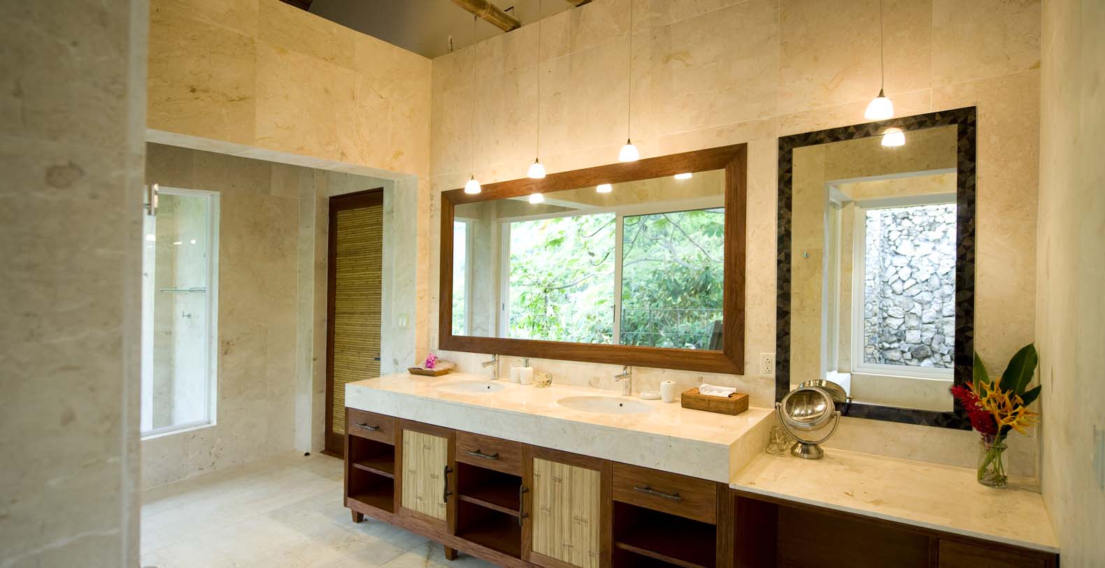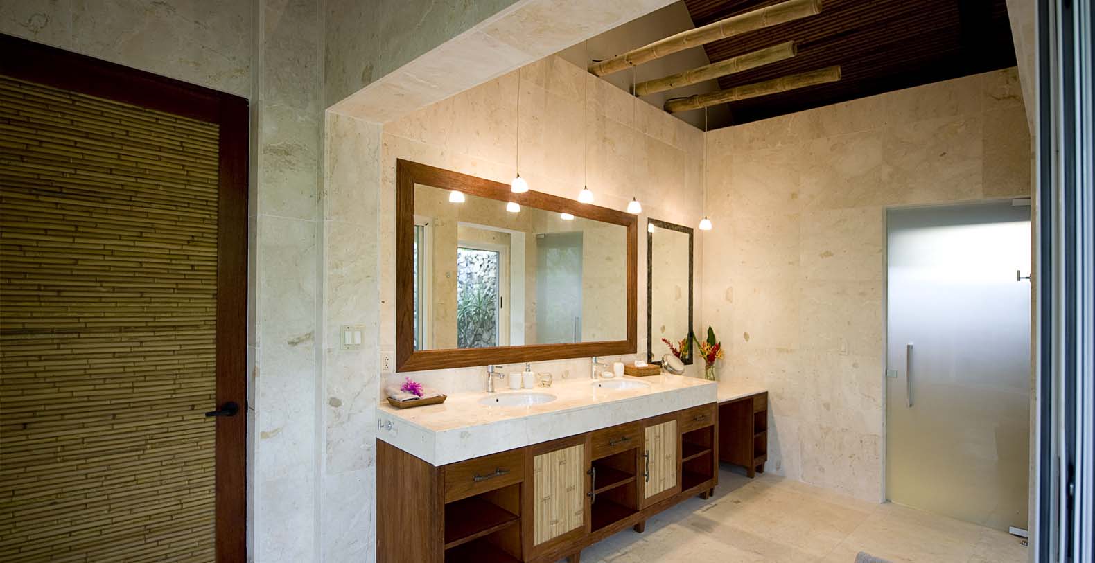The main entrance features a covered walkway floating over a 2,000 square foot reflecting pool of black volcanic candistone. Lined with columns of white palimanan sandstone, the walkways lead you to the East and West bedroom suites which flank the great room, the villa's central focal point The name Mayana was derived from the ancient Mesoamerican civilization and the Sanskrit word "maya", meaning "reflection". Utilizing gray water, solar panels to heat water, and natural sustainable materials such as bamboo, Mayana's creators made every effort to fashion a home that reflects harmoniously with its environment. Construction followed a deliberate theme of rustic simplicity through the thoughtful selection of natural materials such as sandstone, almendro timber columns, bamboo and Cristobal wooden doors and flooring. The result is a blend of casual elegance and comfortable luxury.