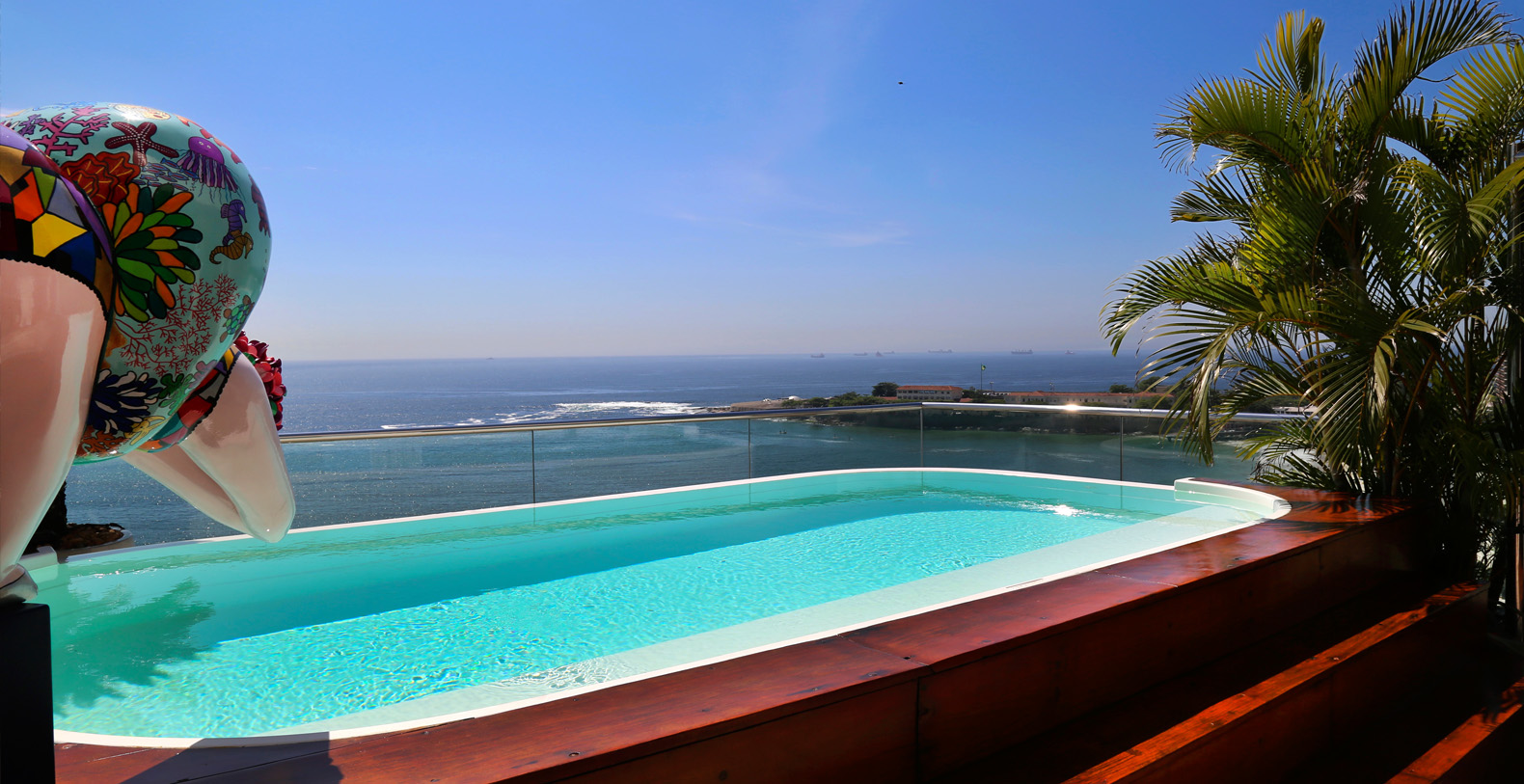 The terrace is the crown jewel of the property and what sets it in a class of its own. Stepping out on to the hardwood deck you’ll be able to see an unmatched view of all of Copacabana beach and the Guanabara Bay. A sweeping glance will give you a panoramic view reaching from the old Copacabana fort to the mountains of Niteroi across the bay and finally resting by the stunning beauty of Leme Beach. Far from only offering a view, the terrace gives you an unmatched space for resting, relaxing and hosting large social events. Ample seating ensures space for everyone. Whether you are stargazing at night or taking in the Rio sun during the day, you’ll be able to relax in style and in company. A large pool makes the perfect site for a mid-day or evening swim. Whether enjoying the view by yourself or hosting a party of your friends and colleagues you’ll be hard pressed to find a more fantastic and inspiring site than the one provided by this luxury penthouse.