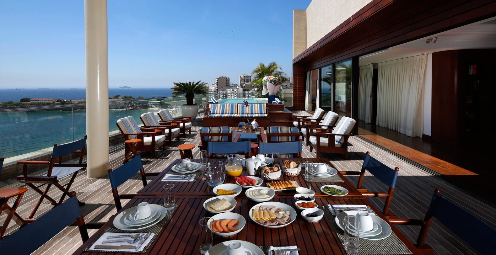 The ultimate in luxury living awaits you at this 5 bedroom beachfront vacation rental in Copacabana. Astonishing views, an enormous terrace with its own pool, ample space for leisure and luxurious personal accommodations make this property one of the most elite and exclusive vacation options in Rio de Janeiro. Entering the property your eyes will immediately be drawn to the spacious and well-furnished living room. Two couches, three seats and four tables await you in a tastefully decorated room with a naval theme. An excellent grand piano is there for you to play or have played. A wall length set of glass doors separate the inside living room from the terrace creating the possibility of opening up the space to the outside and creating a huge indoor-outdoor leisure space.