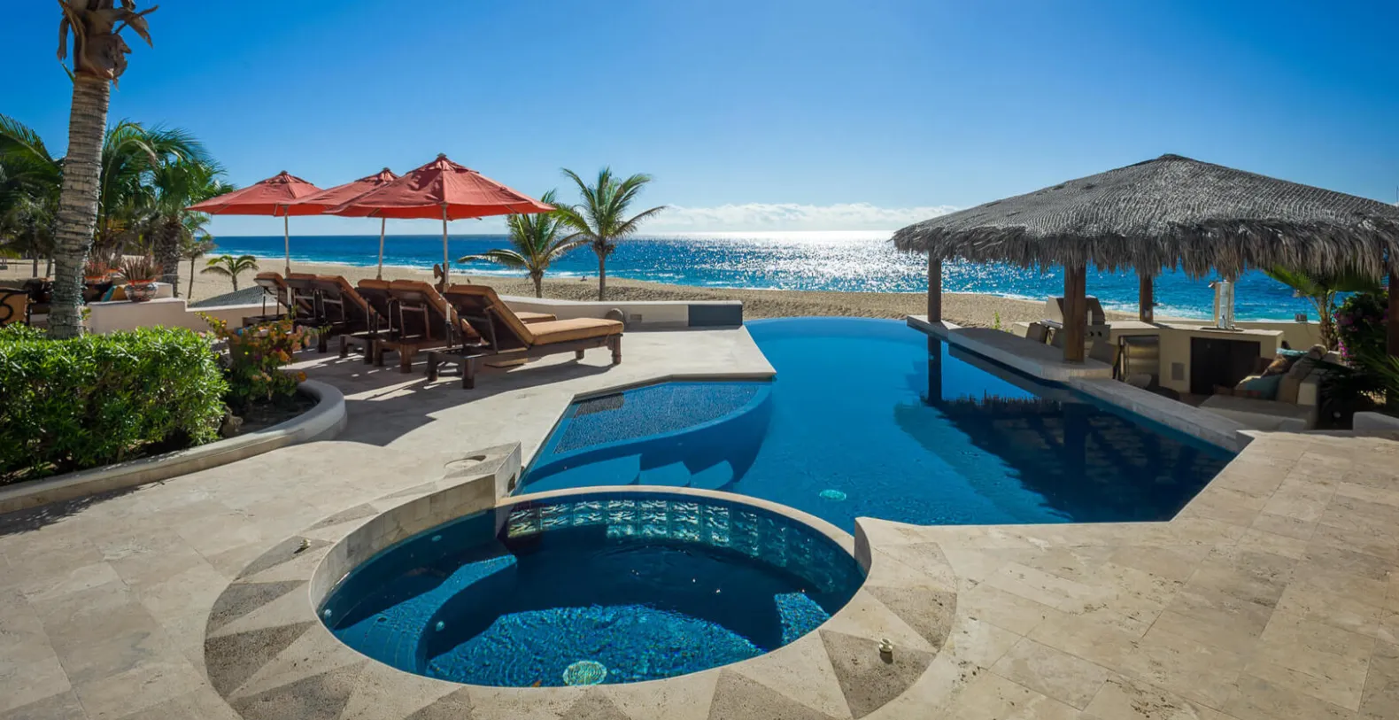 Casa Alcini our newest gem in Cabo is a breath-taking luxury vacation rental with all of the bells and whistles, within Pedregal with ocean views. Located in the private community of Pedregal, this spectacular beachfront property is popular with celebrities. With nearly 7,000 square feet of stunning design and decor, 8 bedrooms, 7.5 bathrooms, there is more than enough room for you and your guests at Casa Alcini. Wake up each morning and be steps away from the shoreline where the waves of the Sea of Cortez meet the sandy beach. Six of the bedrooms found at Casa Alcini feature a picturesque ocean view and their own ensuite bathrooms, while the seventh and eighth bedrooms can be found in the separate guest casita with a shared bathroom. For your comfort, all eight bedrooms of Casa Alcini have been outfitted with lavish linens and plush cushions to provide you with the best night's sleep.