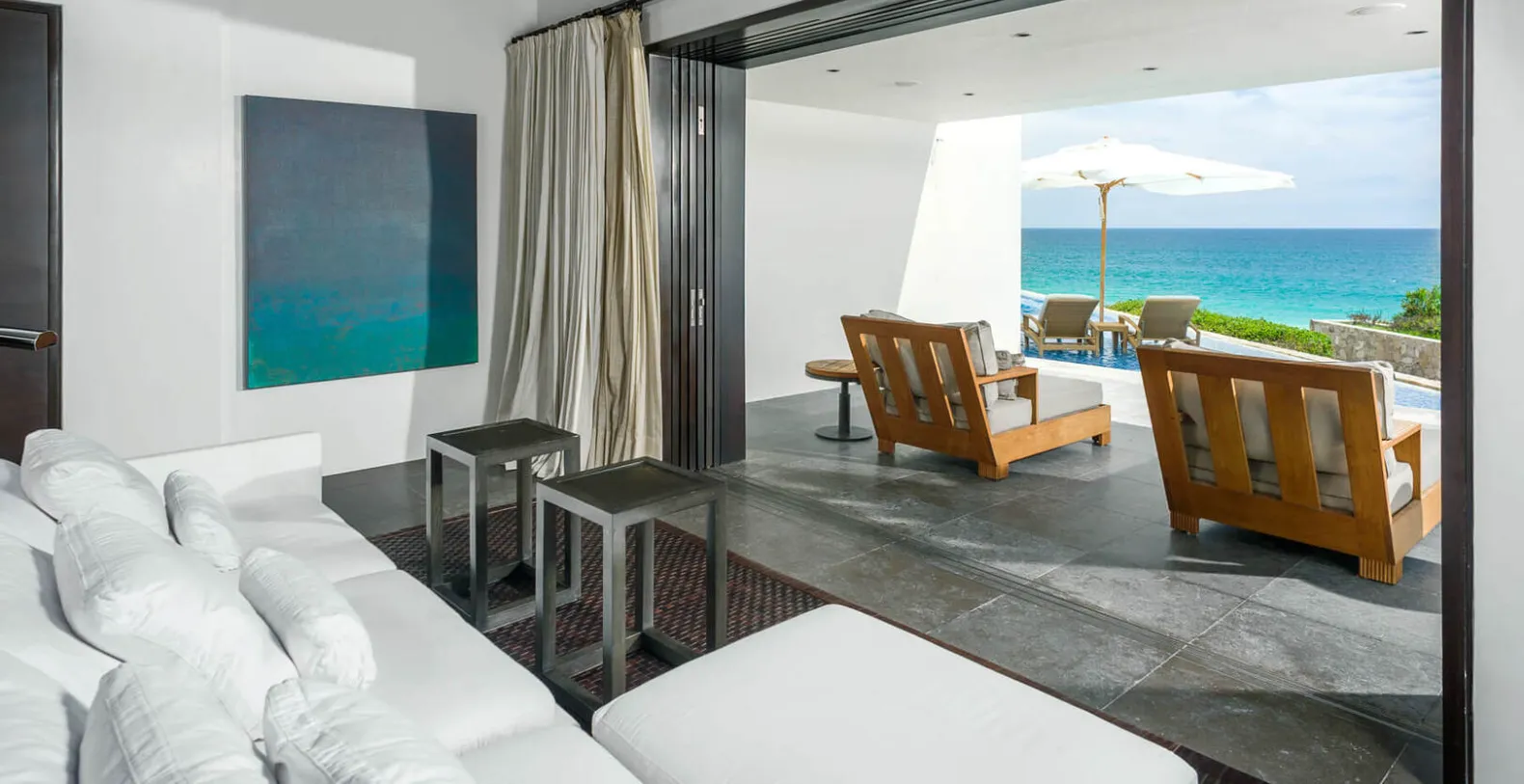 Oliver's six-bedroom suites and private guest apartment rival one another in luxury and stylish comfort. Two rooms have King beds with the other rooms having queen beds - all with spa-like ensuite baths. Discover perfection on Casa Oliver's multi-level terraces where 5-star resort luxury meets endless ocean vistas. Outdoor living at Oliver includes a deluxe gas grill and fire pit, rattan lounge beds, and teak sun chairs that seemingly float in the shallow waters of the glistening infinity-edge pool.