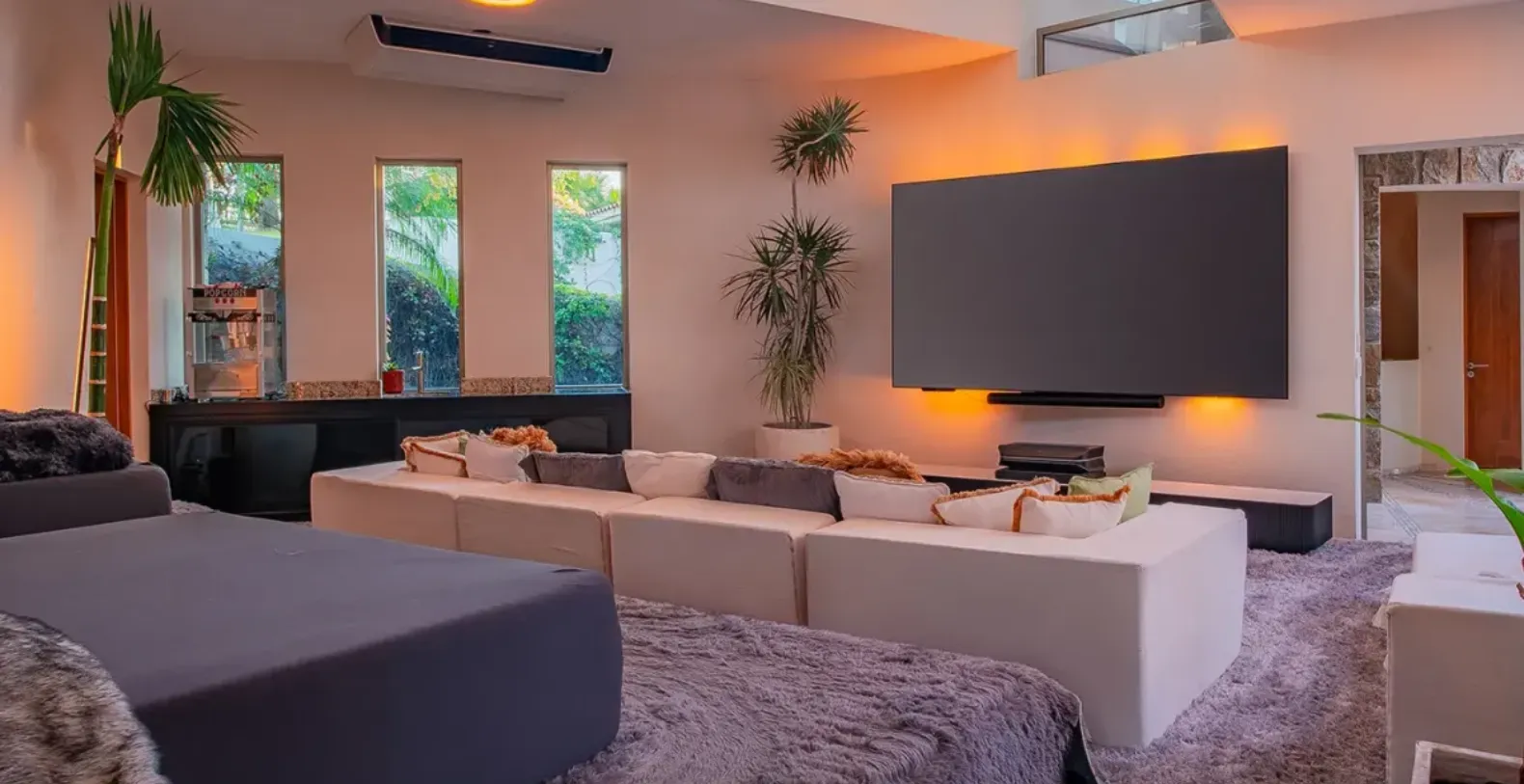 Inside, the villa balances natural textures with sophisticated comfort. Floor-to-ceiling windows bathe the living areas in sunlight, opening seamlessly to the pool terrace. The chef-style kitchen features granite countertops, high-end appliances, and a welcoming breakfast bar, while the entertainment lounge offers a plush cinema setup for movie nights. Guests can also enjoy a fully equipped gym, high-speed mesh Wi-Fi, Sonos sound system, and U.S. television access throughout the home. A whole-house water-filtration system adds an extra touch of care.