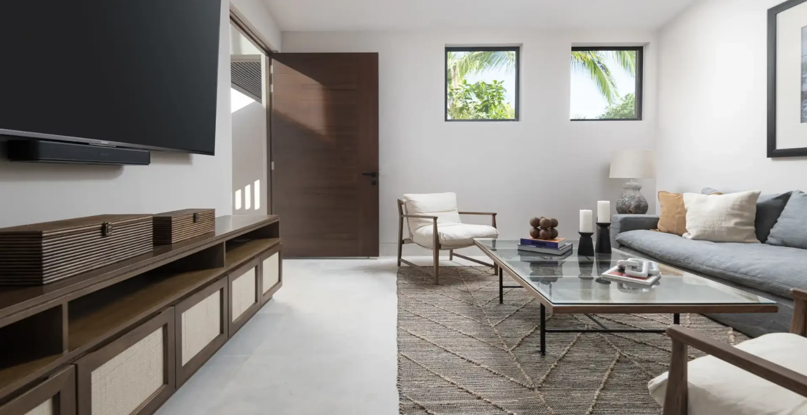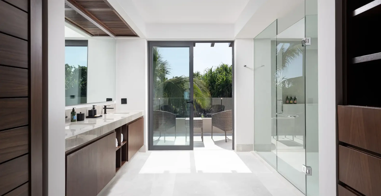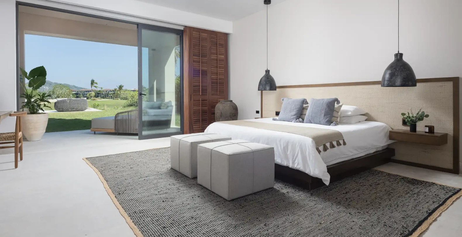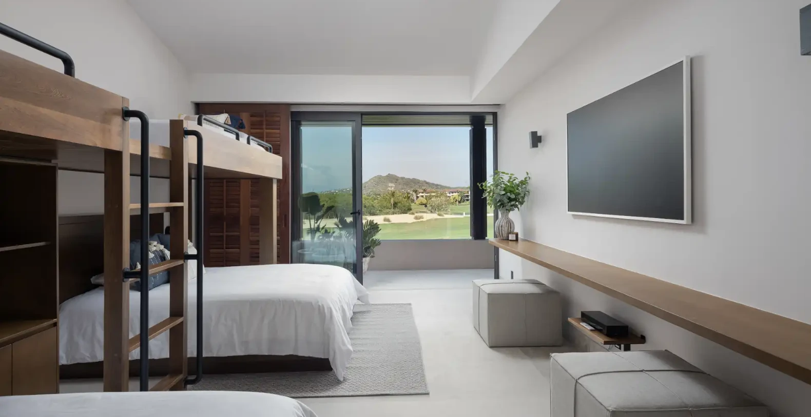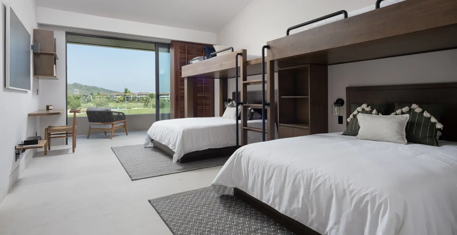 This four-bedroom, five-full-and-one-half-bathl luxury vacation villa hosts up to 14 guests and is defined by its seamless indoor-outdoor flow. Two master suites offer king-size beds, private terraces, and sweeping golf-course vistas. The remaining bedrooms feature versatile bunk bed combinations - bottom queens & top twins beds. Ideal for families with children or groups traveling together. Each suite is paired with an elegant en-suite bathroom and refined finishes throughout. All designed with comfort, privacy, and style in mind