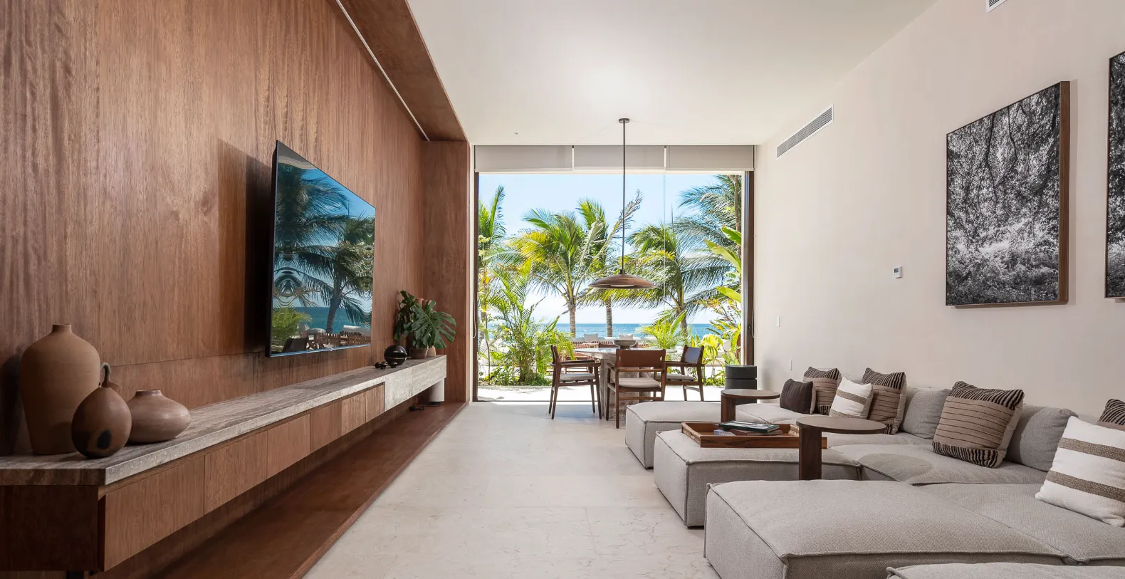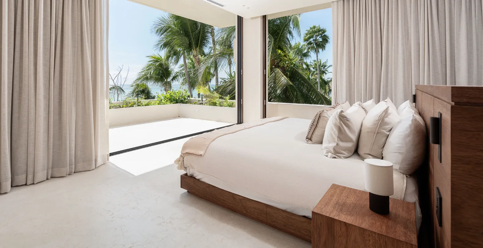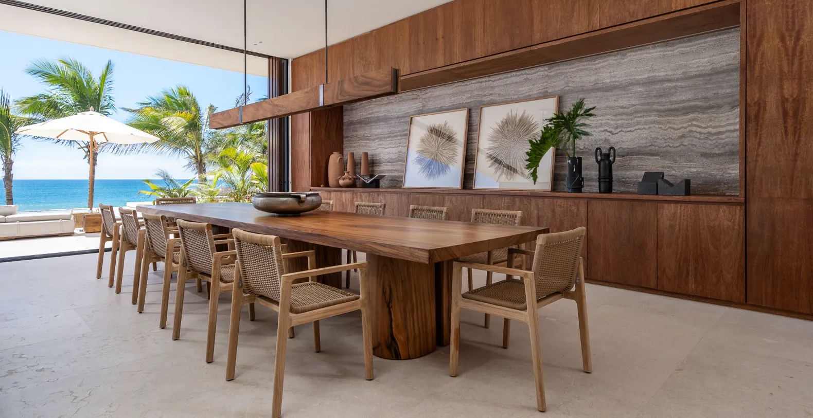 Step outside onto the villa’s expansive oceanfront terrace where open-air living and dining spaces flow seamlessly into a spectacular infinity pool. Plush lounges, shaded umbrellas, and a large alfresco dining area invite you to spend the day under swaying palms, watching the sun melt into the horizon. A grill, stone pizza oven, and paella stove make outdoor entertaining easy and memorable. Guests will also enjoy direct beach access so the property is top choice for sun and beach lovers.