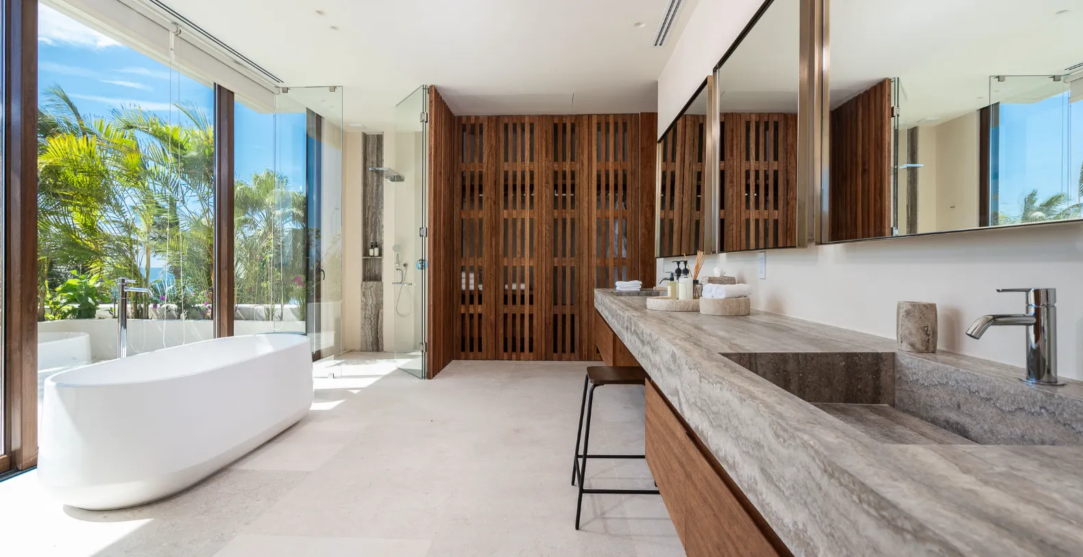 Inside, Casa Veneros continues to impress with a vast, fully equipped kitchen featuring a long island with bar seating for more than six people—perfect for casual breakfasts or chef demonstrations. The main dining room comfortably seats 12 guests in a warm, wood-accented space overlooking the ocean, while the cozy TV lounge provides a relaxed setting for movie nights or a break from the sun. Natural regional wood details, soaring ceilings, and floor-to-ceiling windows bring warmth and light into every corner of the home. The six spacious bedrooms are thoughtfully distributed for maximum privacy. Four of the bedrooms are located on the second floor while the Master and a family room featuring two double beds and one single bed occupy the third floor. Bedrooms and bathrooms are extremely luxurious and spacious, it almost feels like you are in your private spa zone.