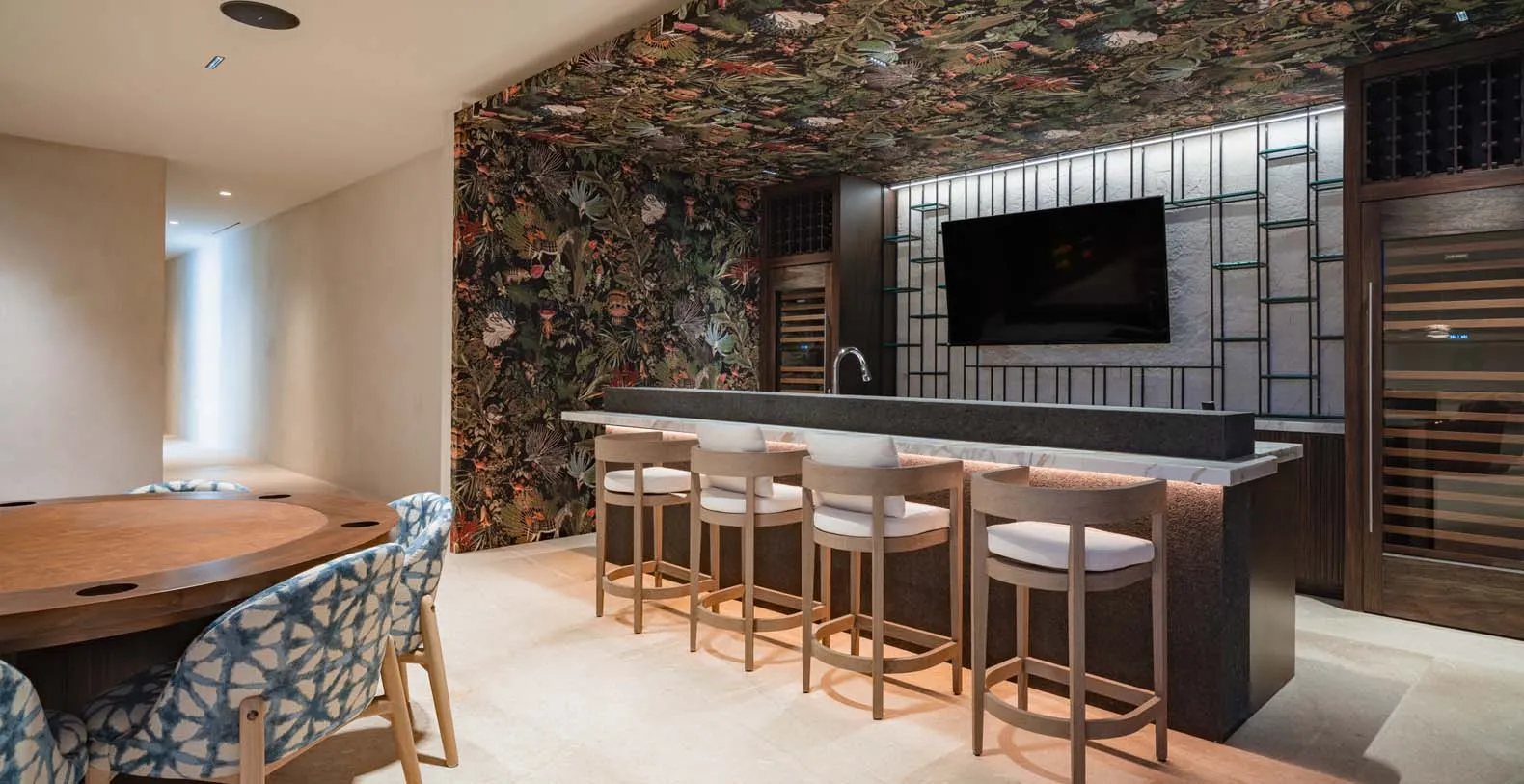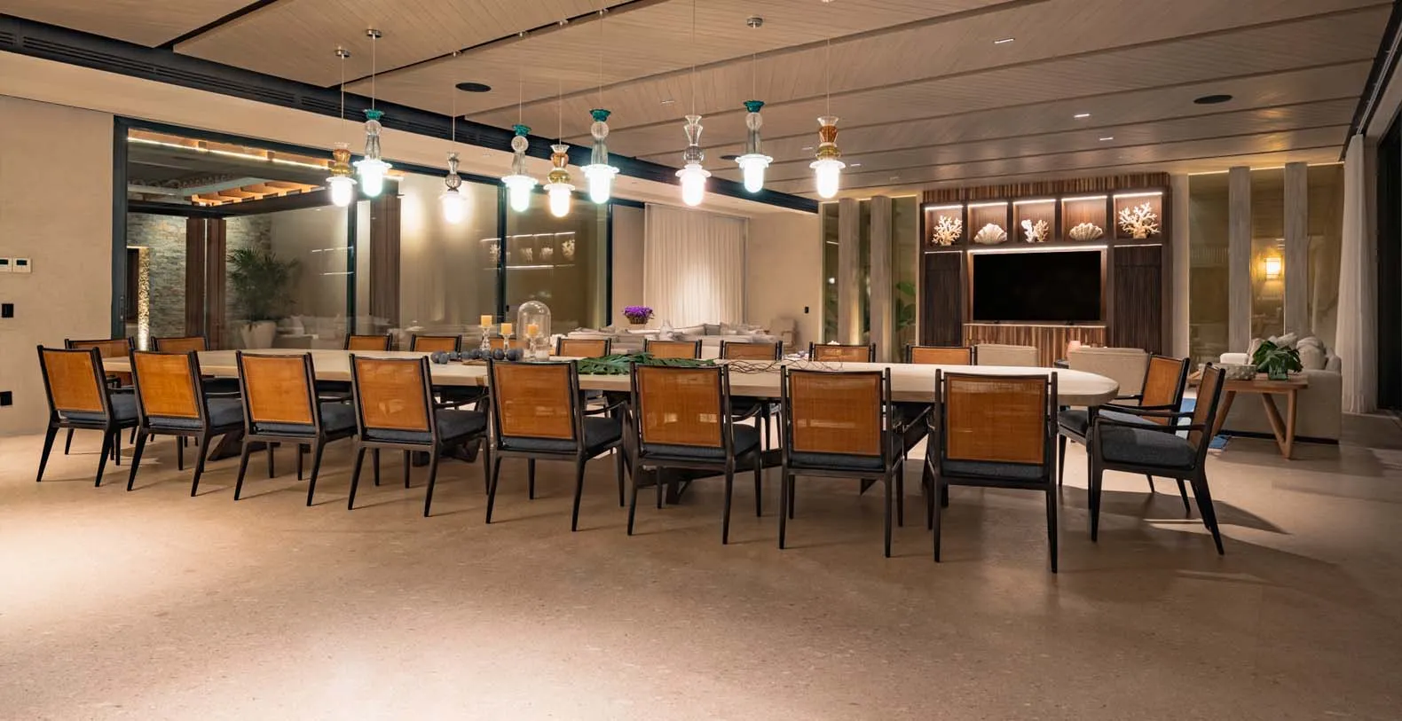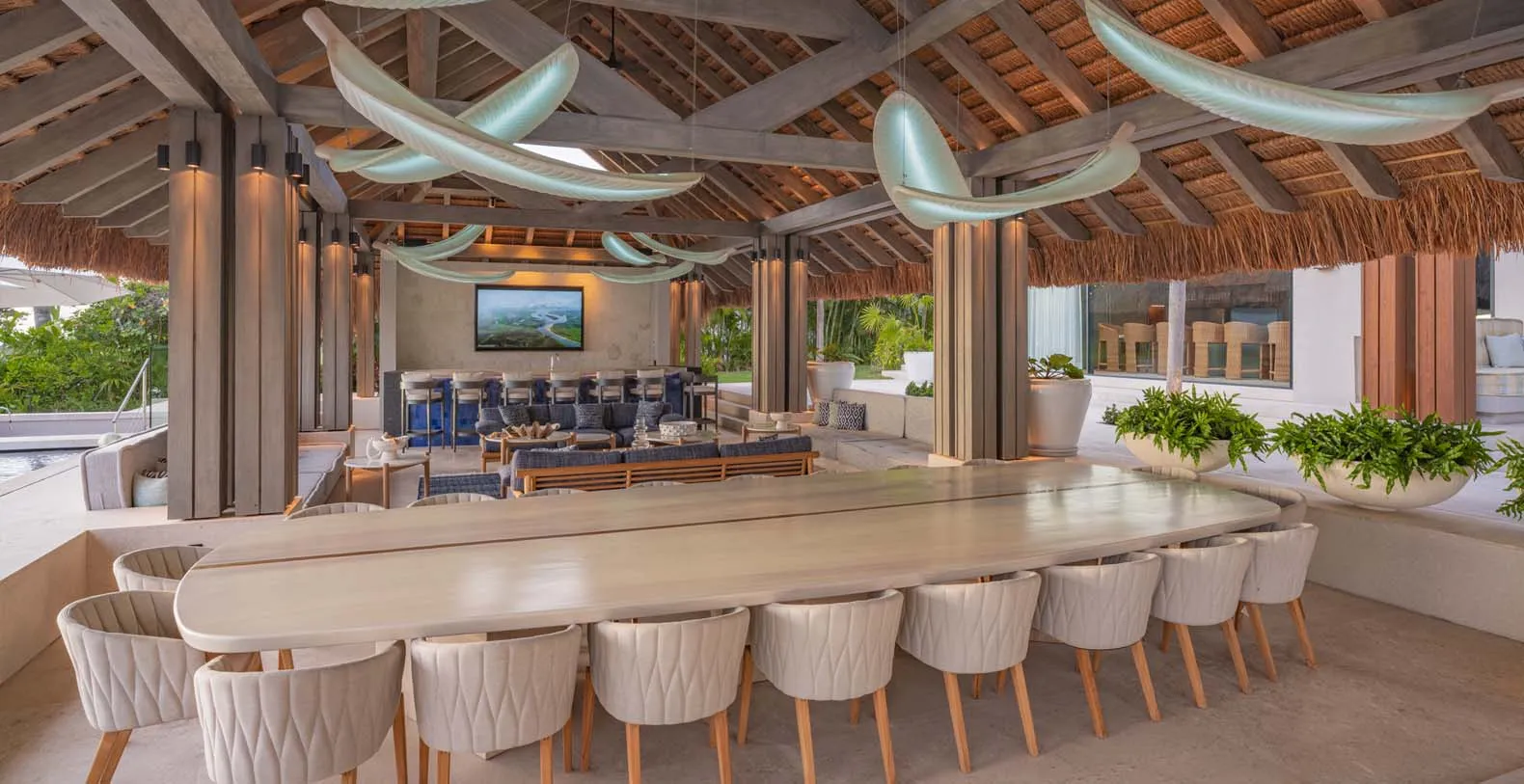 At this beautiful villa, dining is more than just a meal, it’s an experience. The expansive indoor dining area, featuring a grand table for 20 guests, seamlessly connects the kitchen and living room, creating the perfect setting for gatherings. Step outside to the palapa, where another spacious table for 20 awaits, nestled between the main living area and the inviting pool. For a more casual ambiance, the bar area offers comfortable seating for an additional 20 guests. Enjoy intimate breakfasts on the terraces, where small tables provide the perfect spot to start the day with a stunning view.