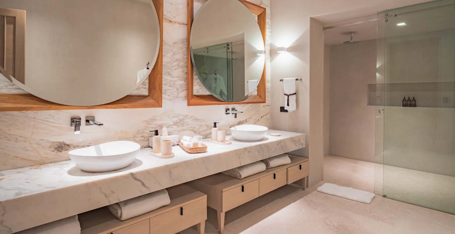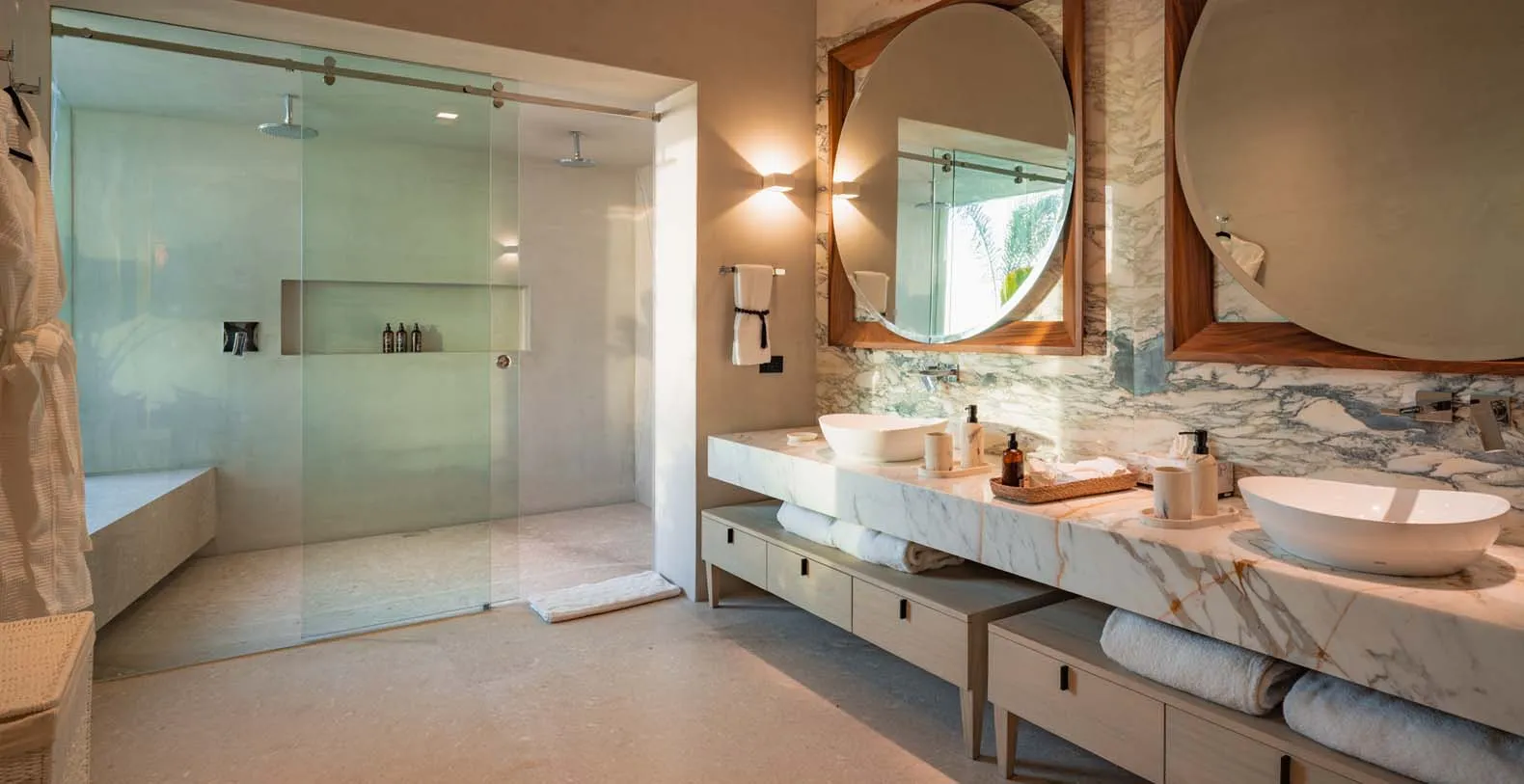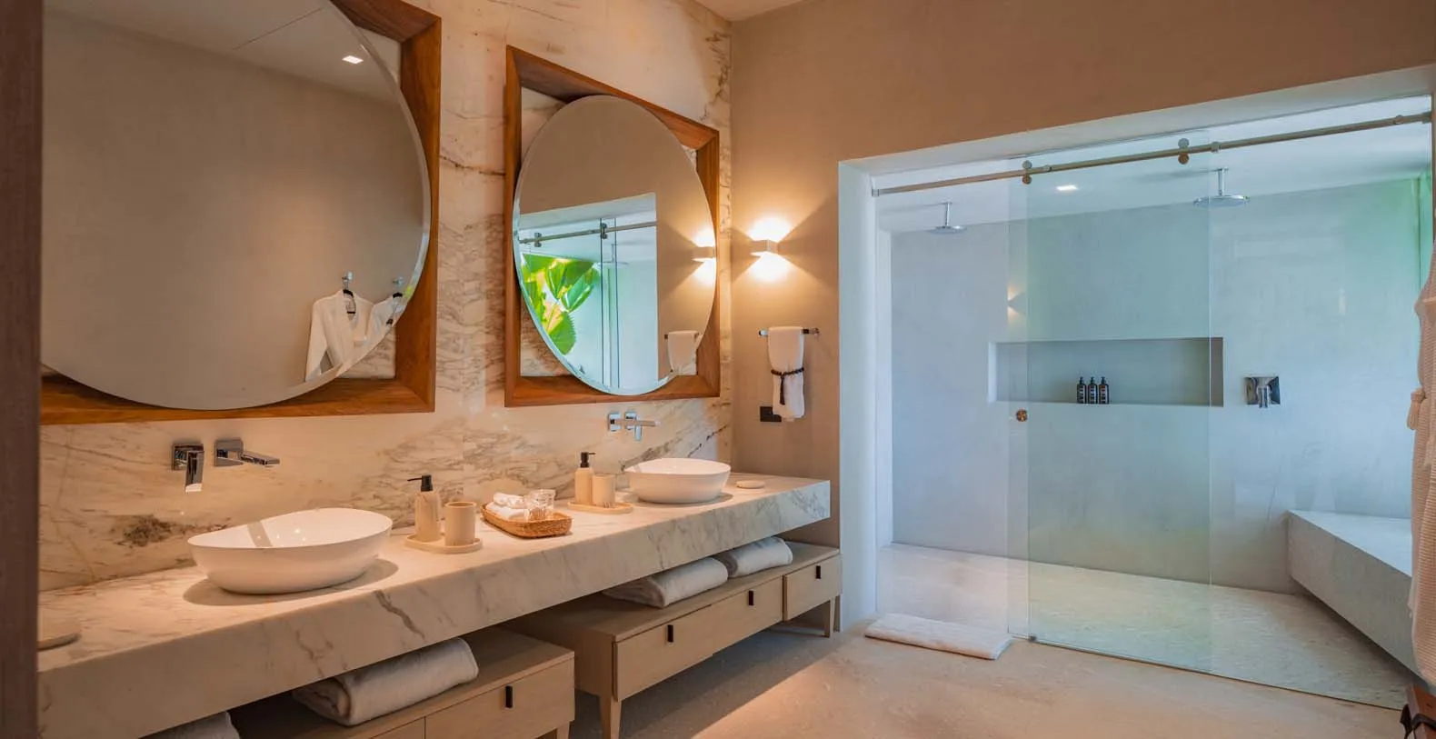 At this beautiful villa, dining is more than just a meal, it’s an experience. The expansive indoor dining area, featuring a grand table for 20 guests, seamlessly connects the kitchen and living room, creating the perfect setting for gatherings. Step outside to the palapa, where another spacious table for 20 awaits, nestled between the main living area and the inviting pool. For a more casual ambiance, the bar area offers comfortable seating for an additional 20 guests. Enjoy intimate breakfasts on the terraces, where small tables provide the perfect spot to start the day with a stunning view.