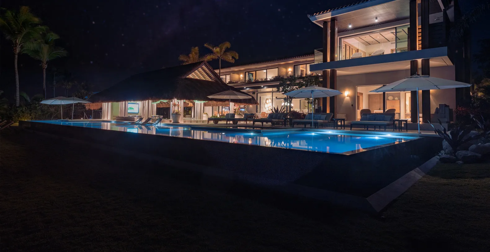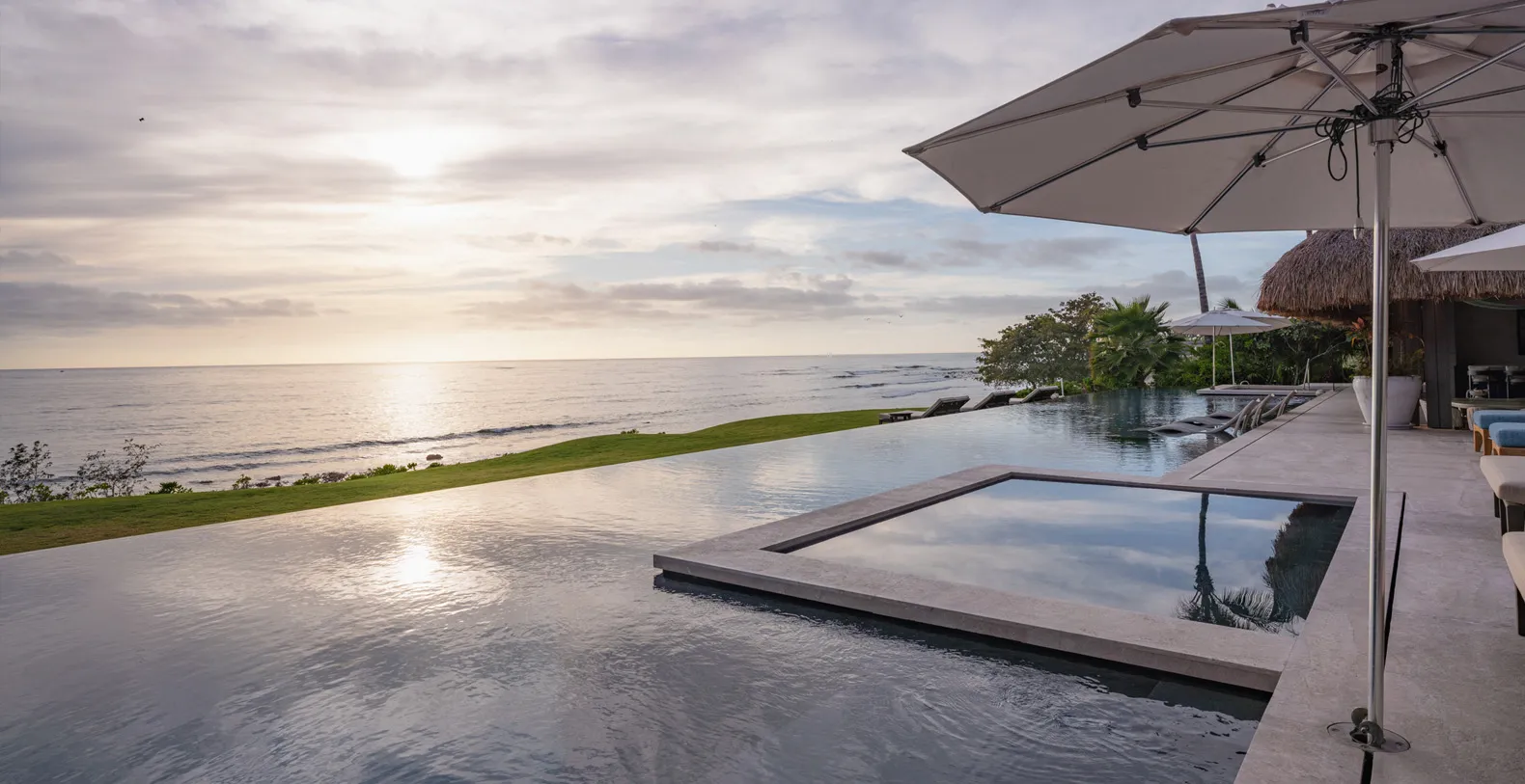 This stunning infinity pool spans the entire width of the house, offering a seamless connection between modern luxury and nature. Positioned perfectly between the palapa and a lush green lawn, it leads directly to the sand and the sparkling sea beyond. With its built-in bar and Jacuzzi, the pool provides the ultimate relaxation experience, whether you’re sipping cocktails or soaking in the serene surroundings. The design of this remarkable pool enhances the beauty of its environment, creating a peaceful oasis for both leisure and entertainment.