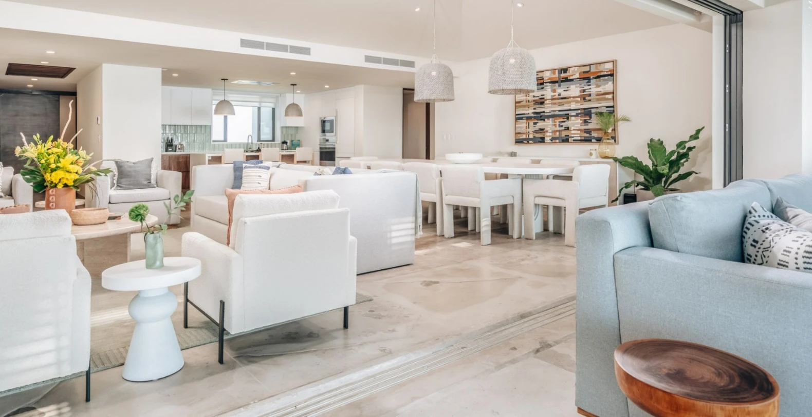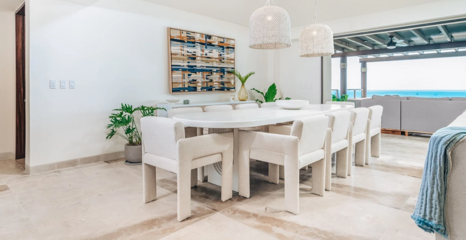 This expansive residence offers four spacious bedrooms and four-and-a-half bathrooms, comfortably accommodating up to 12 guests. Each suite is thoughtfully designed with its own en-suite bath and terrace, capturing views of Banderas Bay, lush tropical gardens, or the rolling fairways of the Jack Nicklaus Signature Golf Course. Two master bedrooms with king-size beds open directly to ocean vistas, while guest rooms with queen and double configurations provide versatile options for families or groups of friends. Every detail from premium linens to curated décor invites serenity and sophistication. This luxury design embraces Punta Mita’s indoor and outdoor lifestyle. Sliding glass walls dissolve the boundaries between interior and exterior, filling the open-plan living and dining areas with sunlight and sea breezes. The gourmet kitchen, fully equipped with top-of-the-line appliances, offers the perfect stage for casual breakfast & lunch prepared by your private chef.