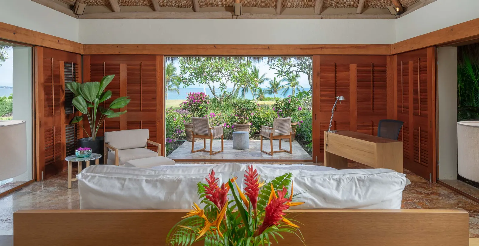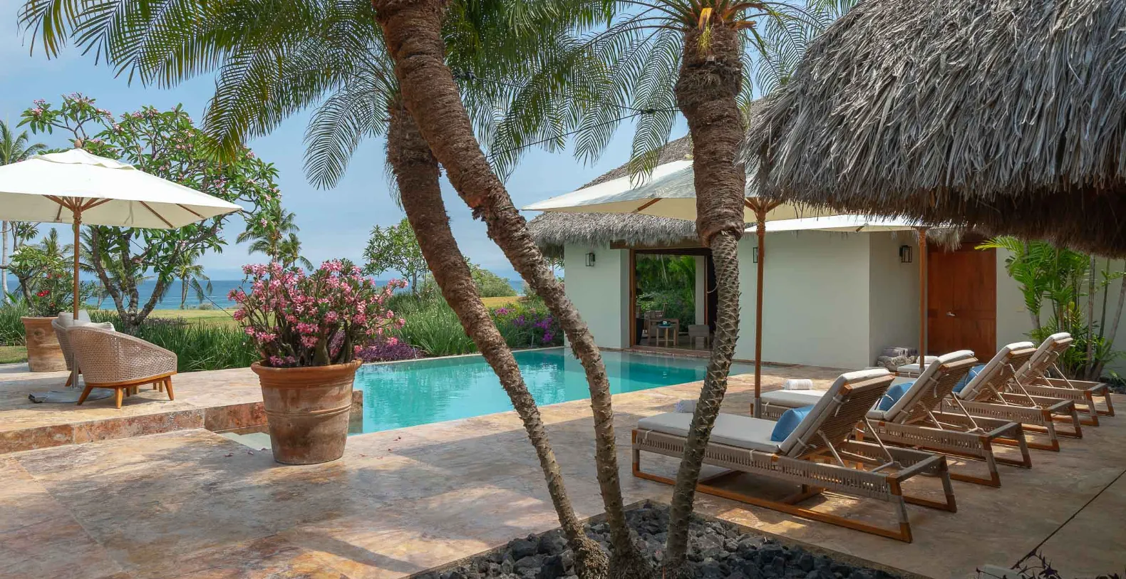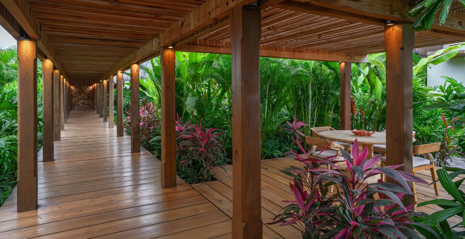 El Jardín offers four bedrooms and accommodates up to 10 guests. Each of the four bedrooms has been thoughtfully designed as a private sanctuary. All rooms include ensuite bathrooms, outdoor seating areas, and lush tropical or ocean views. The primary suite opens directly onto the garden terrace, where morning breezes and ocean sounds create the perfect start to the day.