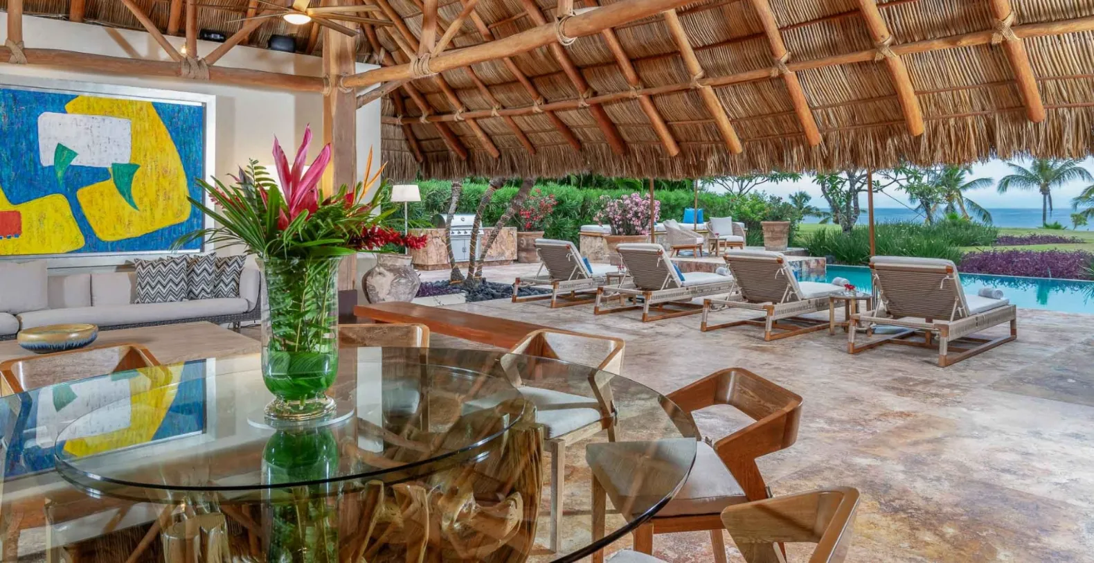 From the moment you arrive, Villa El Jardín welcomes you with its tranquil atmosphere and tropical design. Floor-to-ceiling glass doors open to lush gardens, an expansive terrace, and a spectacular infinity pool that appears to spill directly into the ocean. The villa’s architecture celebrates open-air living, featuring natural stone, tropical wood accents, and warm tones that echo the beauty of its surroundings. The villa boasts spacious living, dining areas and a fully equipped gourmet kitchen that connects effortlessly to the outdoor spaces.
