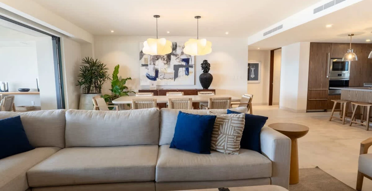 Encanto 1021 features four beautifully appointed bedrooms and four full bathrooms, comfortably accommodating up to 8 guests. Two master suites offer king beds, en-suite baths, and terraces overlooking the ocean, while the other two guest room contains two queen beds designed with modern finishes, soothing palettes, and thoughtful touches. The open-concept living and dining areas accented by clean lines and expansive windows flowing naturally into the outdoor world. Step onto the private terrace, where a plunge pool, lounge chairs, and al outdoor dining set the stage for tranquil mornings, sunset cocktails, or intimate dinners under the stars.