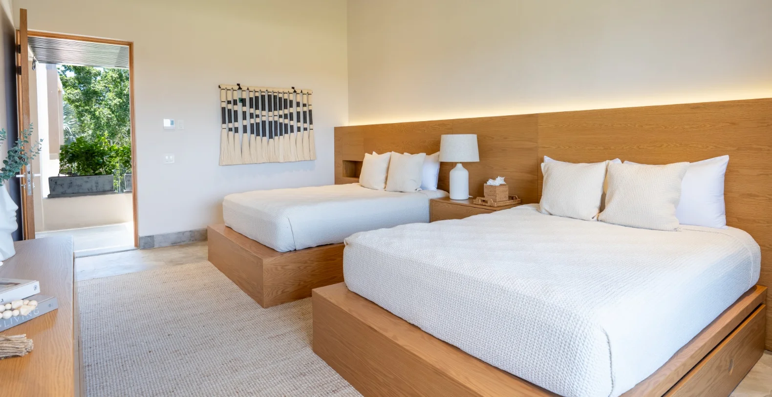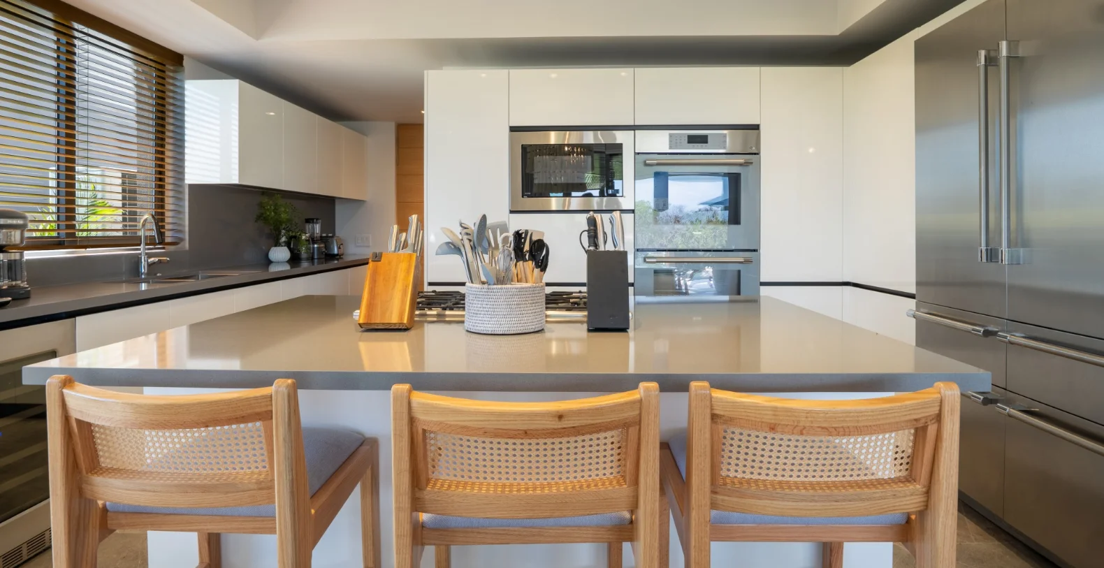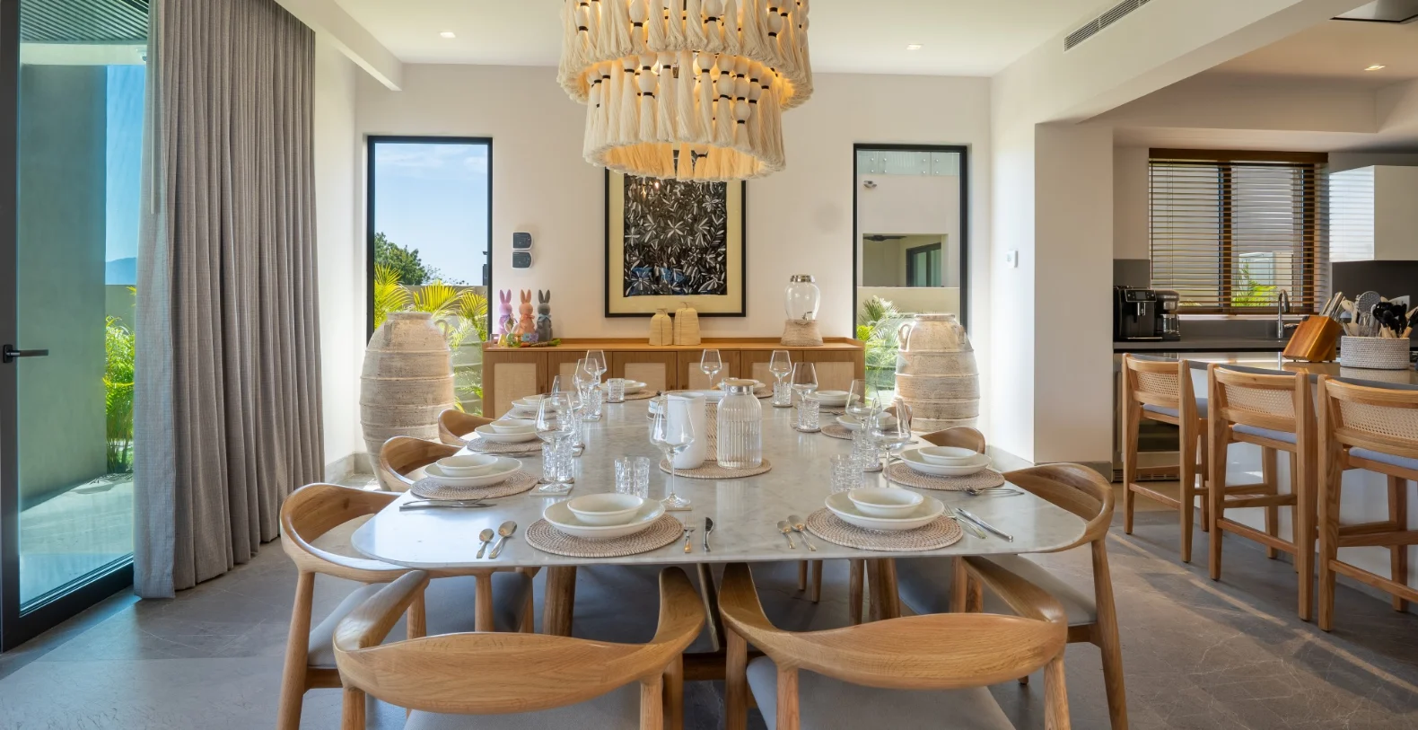 The residence features four beautifully appointed bedrooms and four-and-a-half bathrooms, offering comfort and versatility for families or groups of friends. The master suite includes a king-size bed, a luxurious en-suite bathroom, and serene garden views. From the moment you step through the doors, the villa welcomes you with a sense of warmth and serenity. Natural materials, soft neutral tones, and contemporary lines flow throughout, blending modern sophistication with the laid-back spirit of the coast. Every detail has been designed for comfort, from the spacious gathering areas to the gentle sounds of the garden just beyond the terrace. The vacation villa’s open-concept living and dining spaces open seamlessly to the outdoors, connecting the heart of the home with the lush tropical surroundings. A fully equipped kitchen with premium appliances makes cooking a joy, while breakfast preparation each morning (ingredients not included) adds a personalized touch of hospitality.