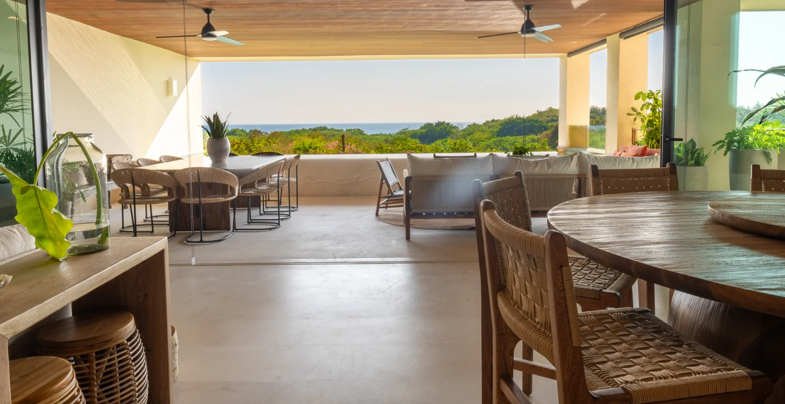 This single-level vacation residence offers modern indoor and outdoor living space, ideal for families or small groups seeking tranquility and style. Expansive glass doors open onto a private ocean-view terrace featuring a private infinity pool, shaded dining area, bar and loungers the perfect setting for morning coffee, long afternoons in the sun, or cocktails at sunset. The open-plan living and dining areas flow effortlessly into a modern, fully equipped kitchen with top-of-the-line appliances and a breakfast bar, creating a bright and social atmosphere.