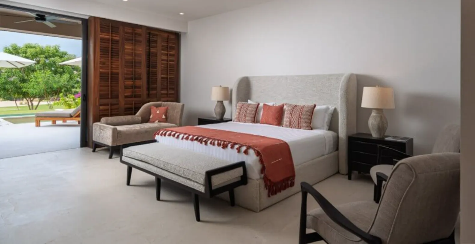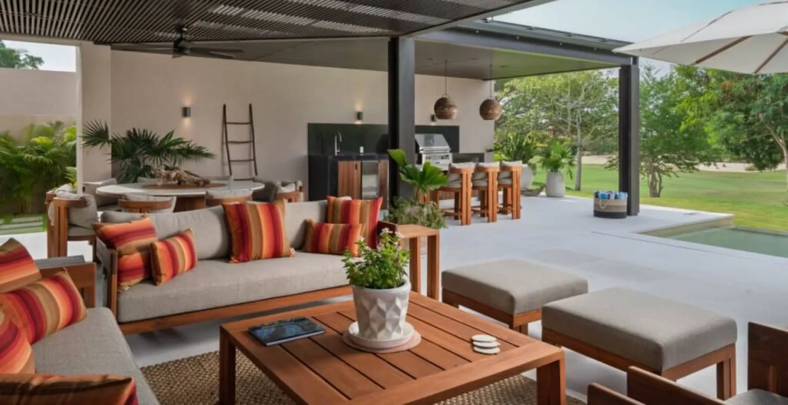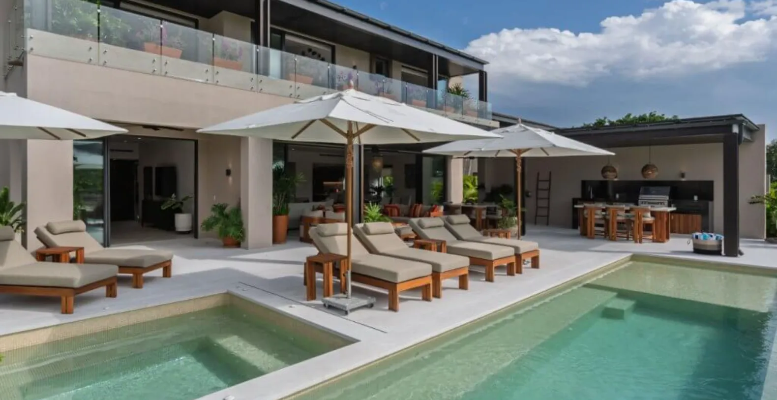 The outdoor spaces are a highlight of Villa Amada, offering everything needed for effortless entertaining and leisure. Guests can unwind beside the private plunge pool or soak in the jacuzzi while enjoying tranquil golf course views. The spacious terrace features multiple lounge areas, shaded seating, and an elegant outdoor dining space complemented by a built-in grill—perfect for alfresco meals and sunset gatherings. Whether enjoying a morning coffee or an evening under the stars, the setting is designed for pure relaxation.