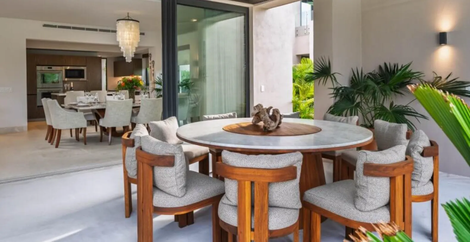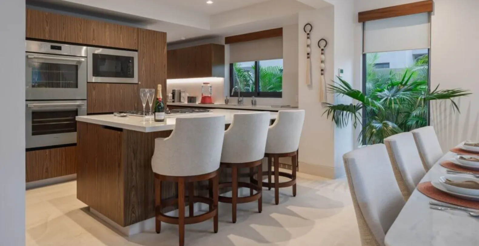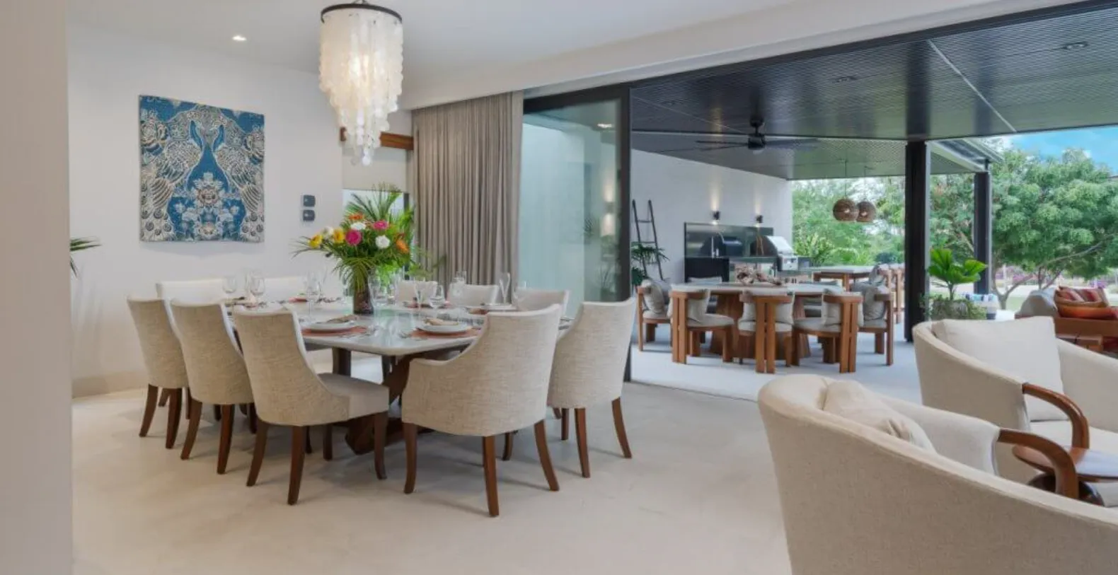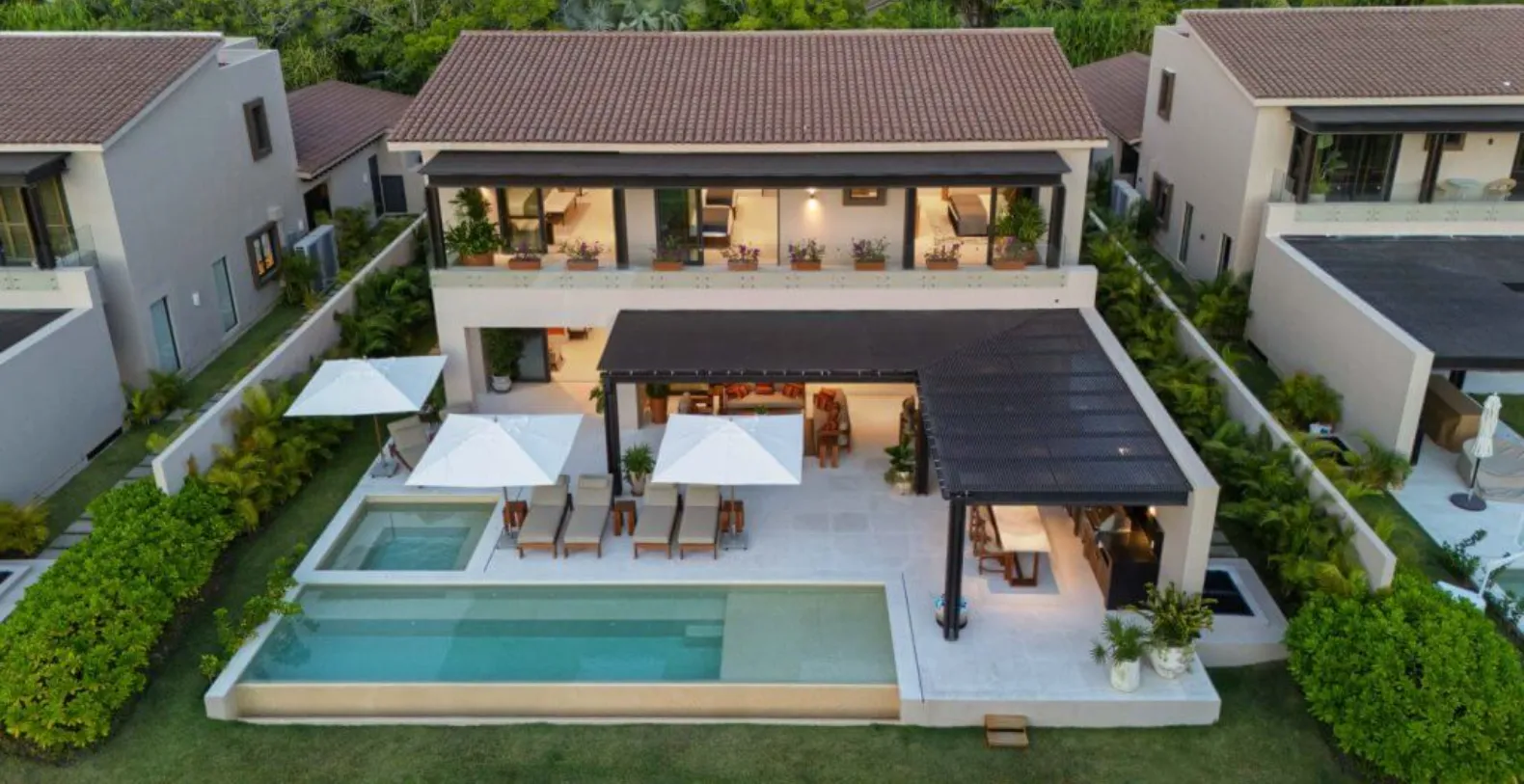 The outdoor spaces are a highlight of Villa Amada, offering everything needed for effortless entertaining and leisure. Guests can unwind beside the private plunge pool or soak in the jacuzzi while enjoying tranquil golf course views. The spacious terrace features multiple lounge areas, shaded seating, and an elegant outdoor dining space complemented by a built-in grill—perfect for alfresco meals and sunset gatherings. Whether enjoying a morning coffee or an evening under the stars, the setting is designed for pure relaxation.