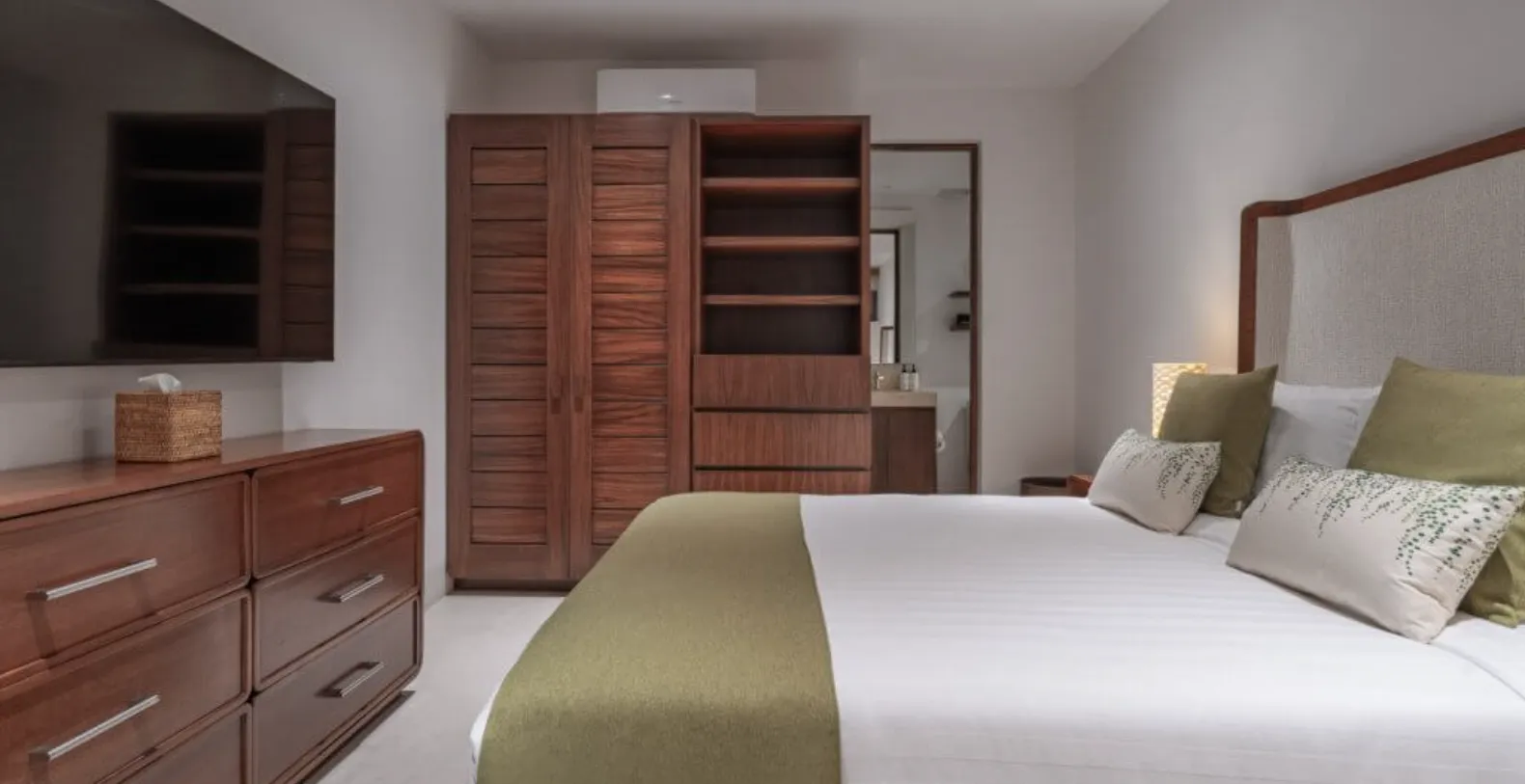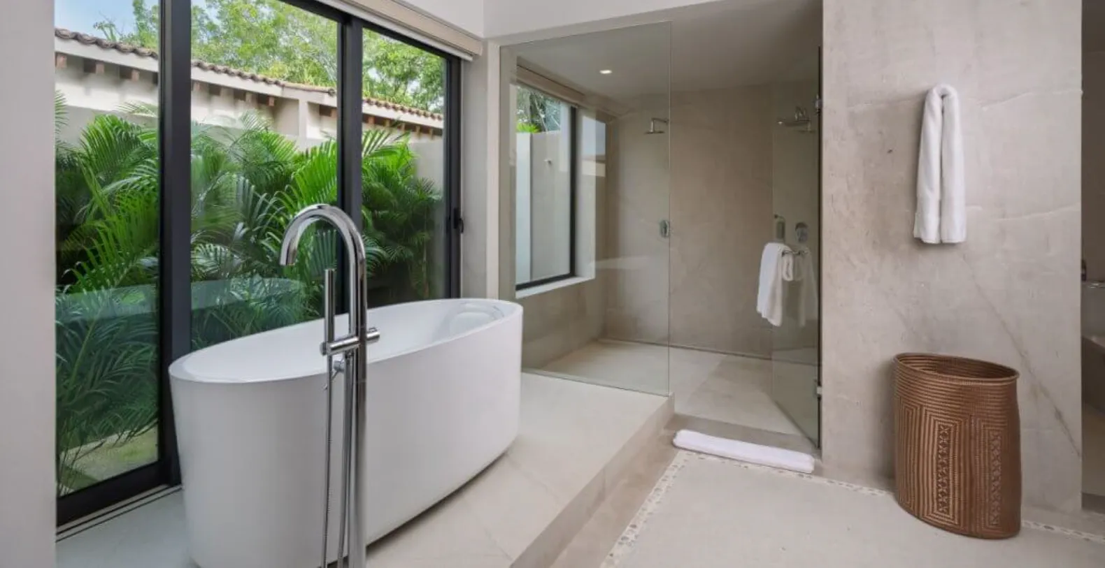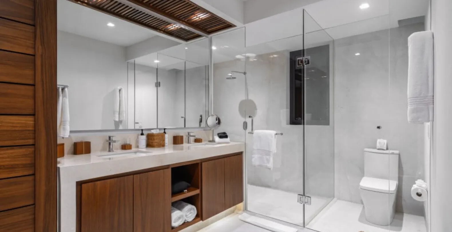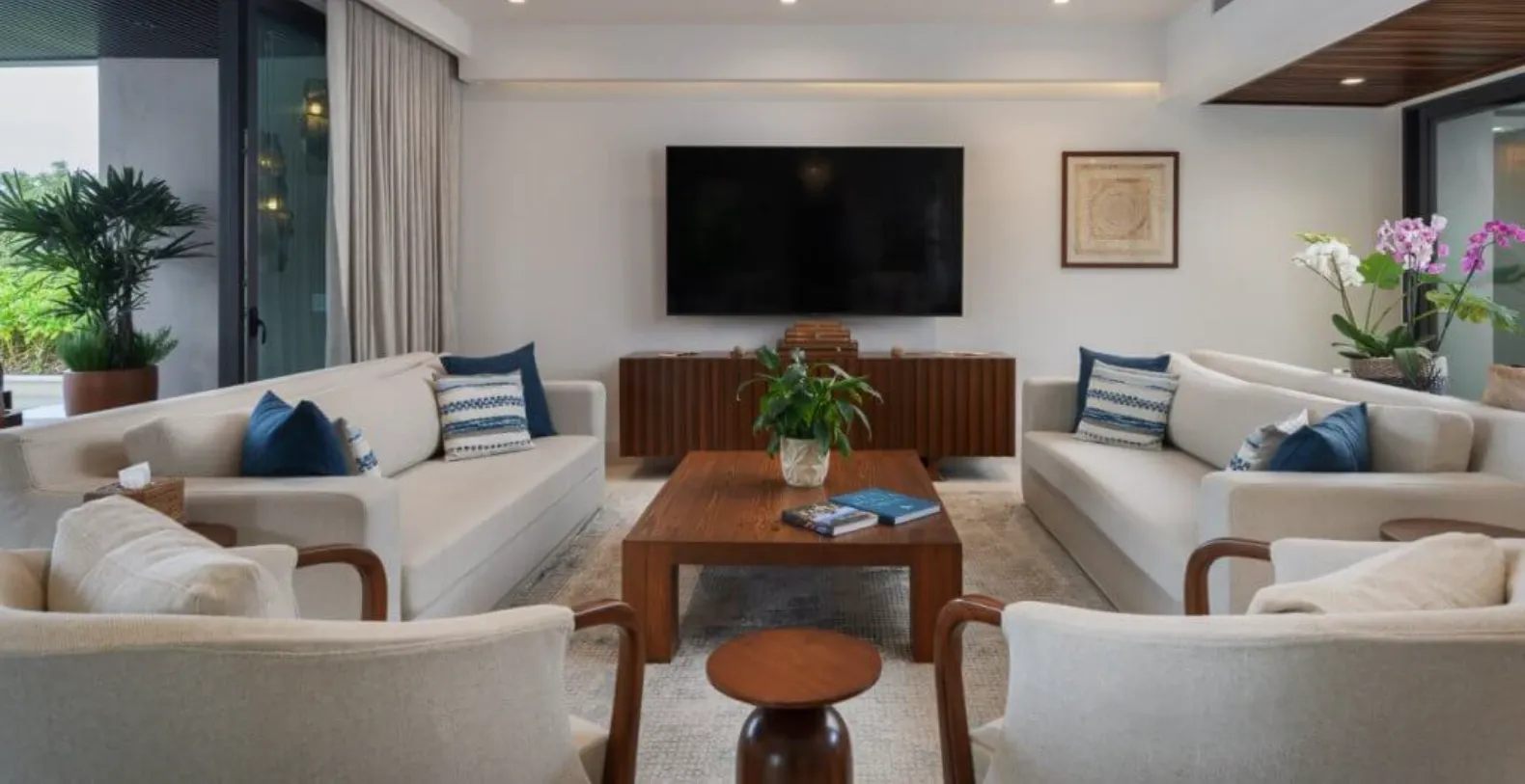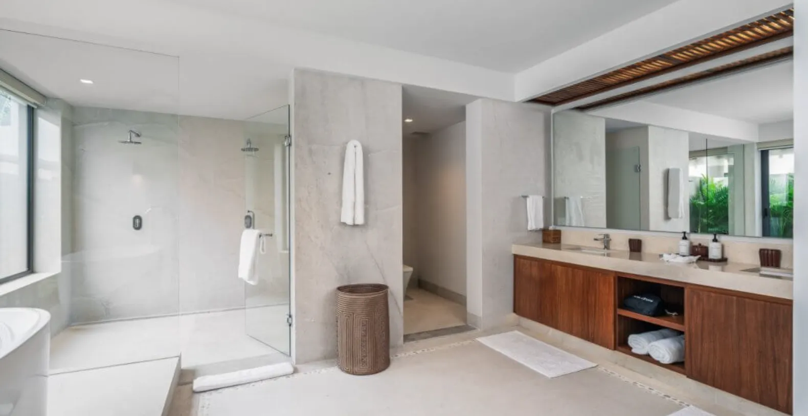 Inside, the villa offers five beautifully appointed bedrooms, each designed to provide privacy and restful comfort. High-quality linens, ample storage, and well-appointed en-suite bathrooms—with rain showers, bathtubs, and premium amenities such as body soap, conditioner, and luxury toiletries—ensure a refined stay for every guest. The villa is fully air-conditioned and equipped with modern conveniences including Wi-Fi, cable TV, and smart entertainment features.
