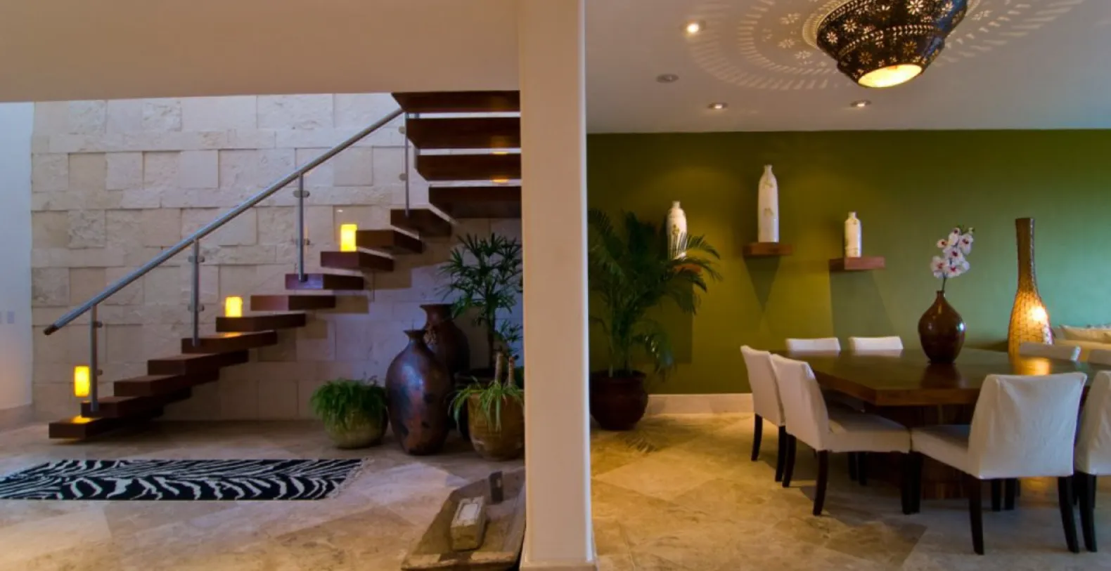 The main level welcomes guests with a spacious open-concept layout that connects the living and dining areas to the lush garden. Large sliding doors create a seamless transition to the outdoor terrace, shaded by a wooden pergola. Here you’ll find an outdoor grill, refrigerator, and a private pool finished with Venetian tiles — perfect for relaxing under the Mexican sun or hosting intimate dinners al fresco. Inside, the villa features marble floors, tropical wood decks, a large modern kitchen, and a powder room. A tranquil zen patio with a cascading water wall and outdoor shower adds a touch of serenity to the home’s design.