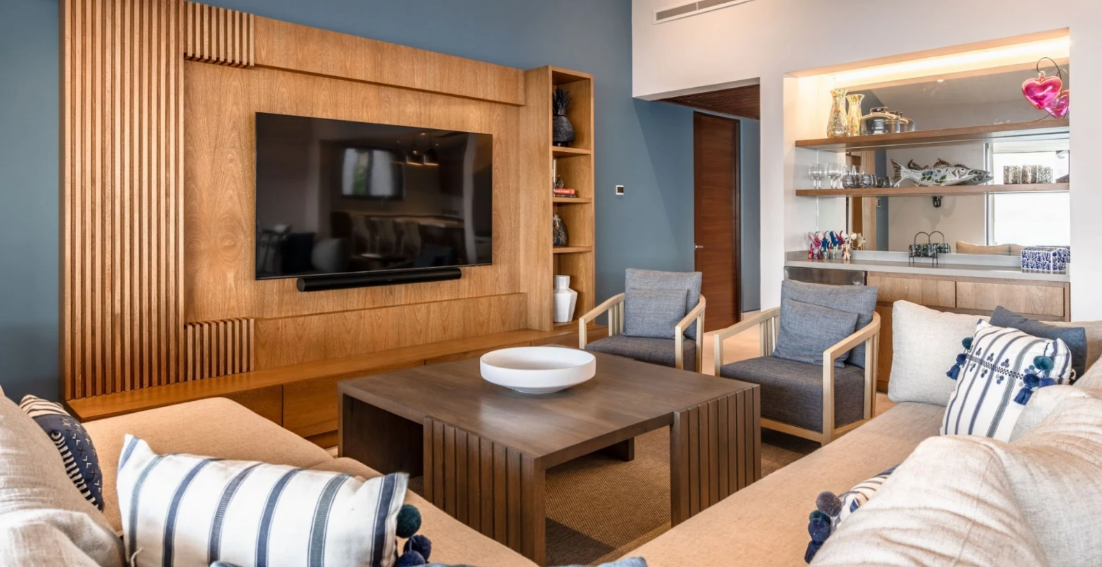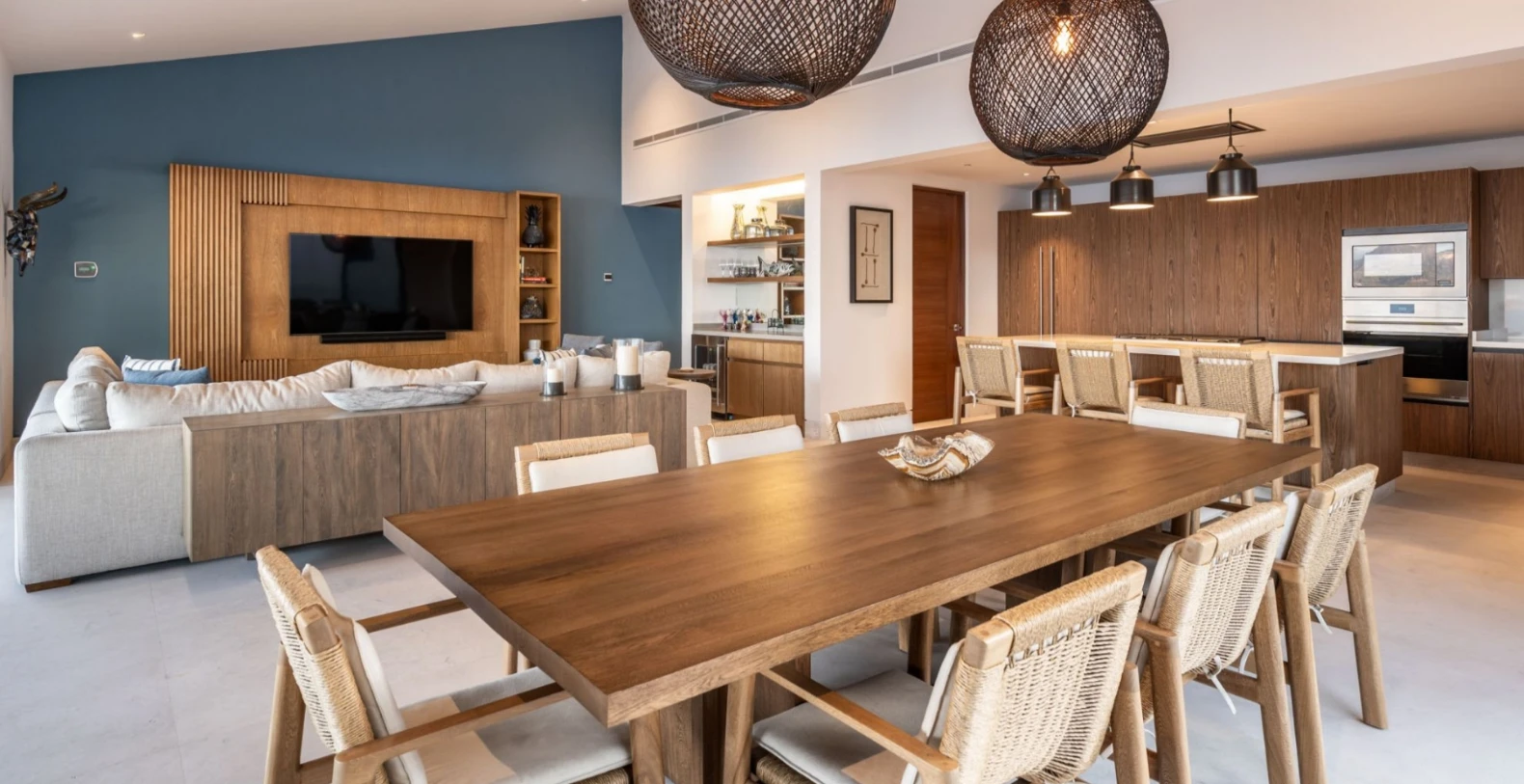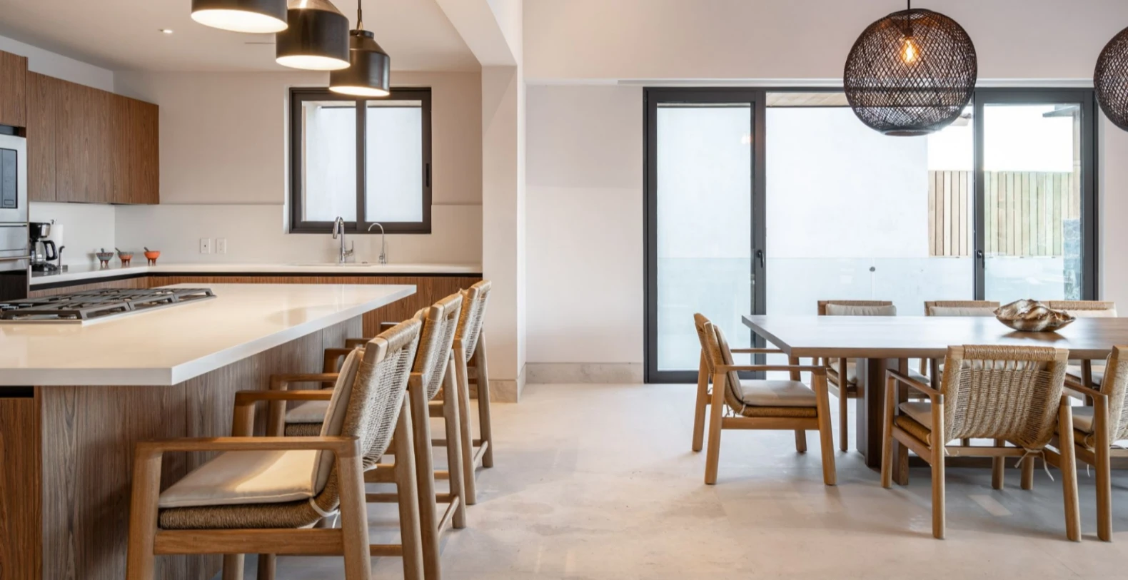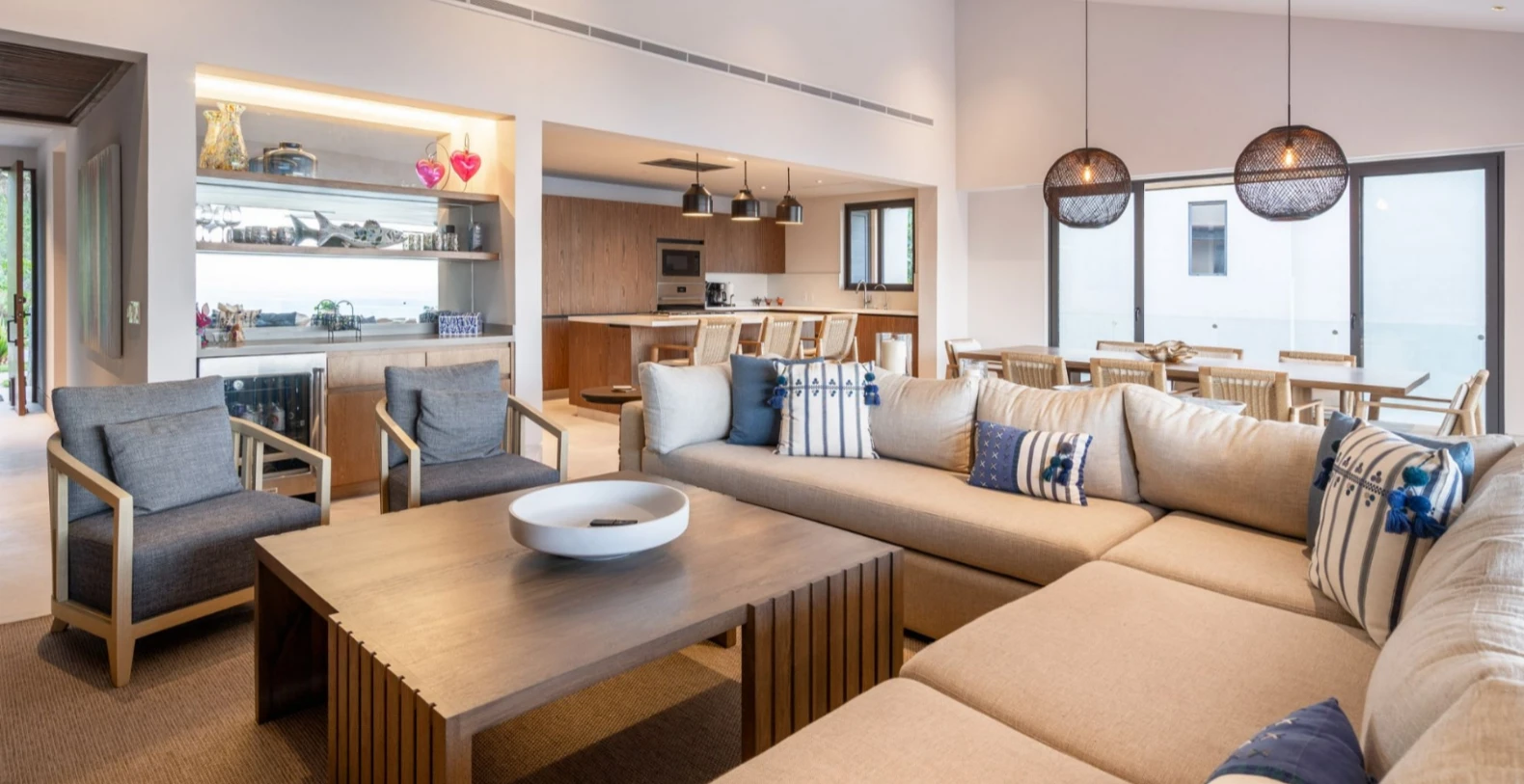 The open-concept living area flows seamlessly to the outdoor terrace, where floor-to-ceiling glass doors and windows fill the space with light and sea breezes. The fully equipped kitchen includes modern appliances and a breakfast bar, while the dining area and living room offer plenty of space for gathering and entertaining. Outside, enjoy your private infinity pool, surrounded by loungers, shaded seating, and an outdoor dining area. A BBQ grill and wet bar make it easy to host sunset dinners or casual afternoon gatherings or just casual alfresco dining dinners.