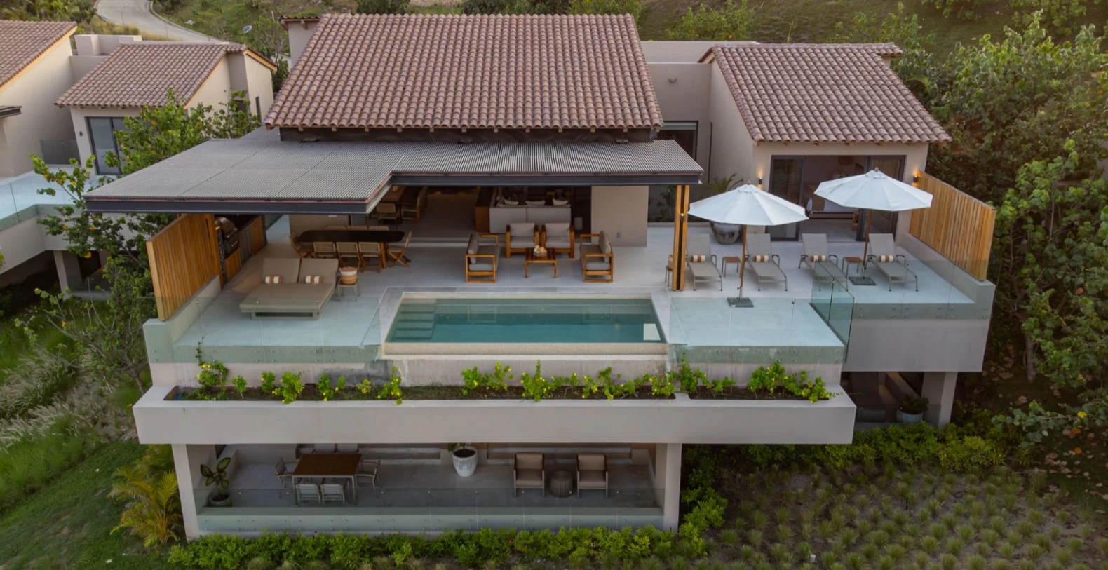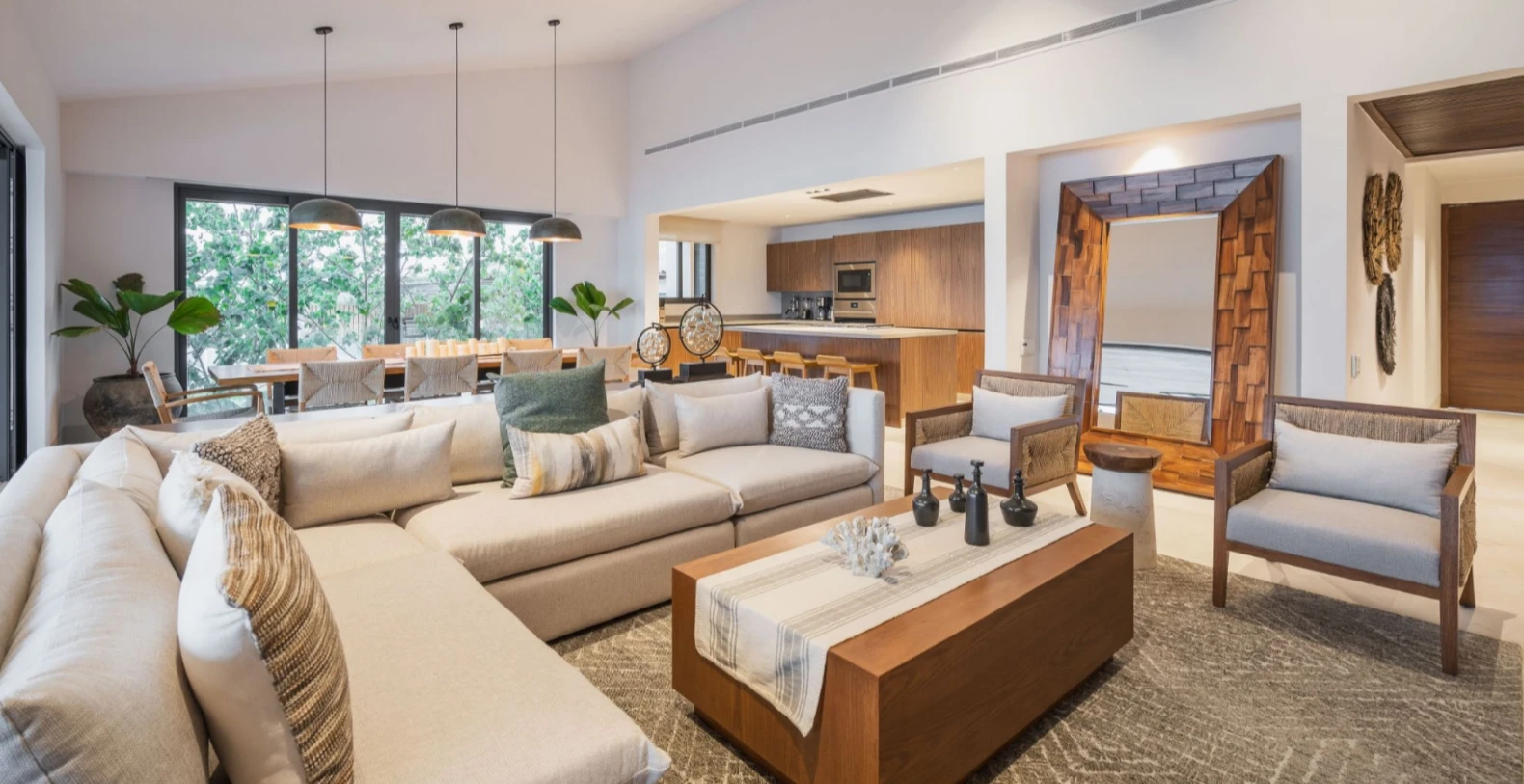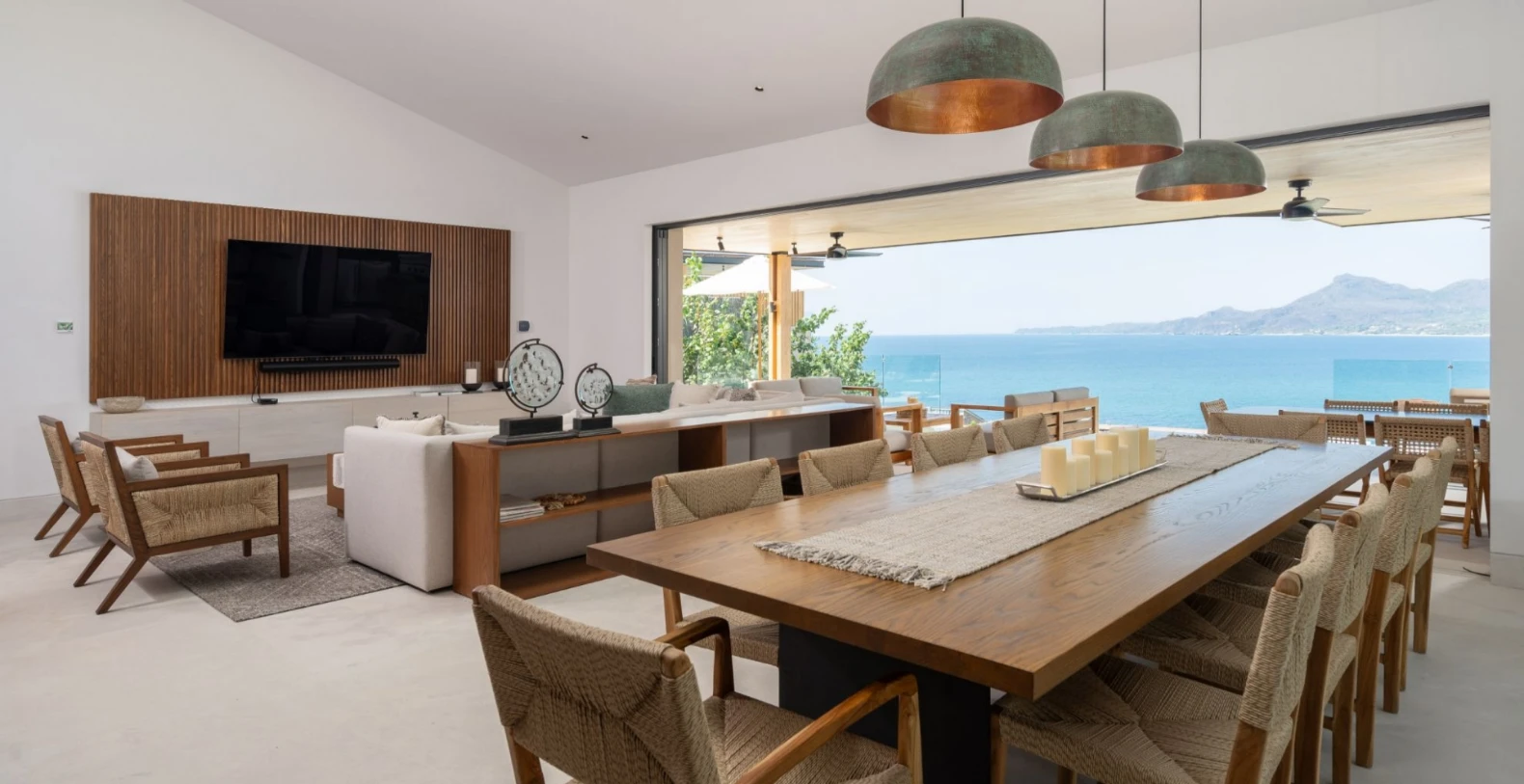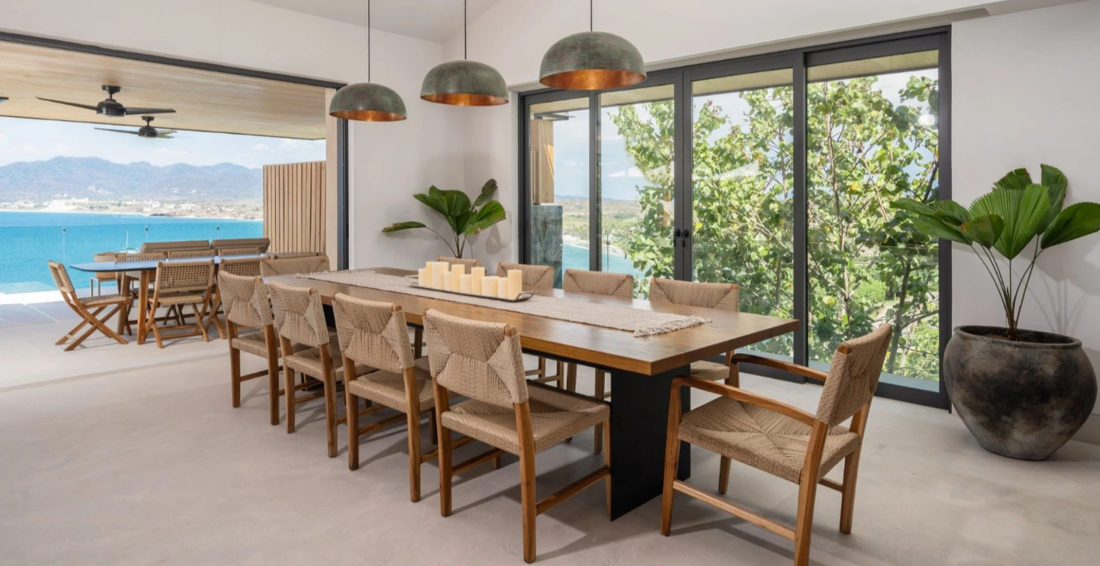 Perched above Litibú Bay, Villa Lupe enjoys panoramic views of the Pacific Ocean and the lush tropical landscape below. Its contemporary architecture blends perfectly with the hillside, featuring expansive terraces, floor-to-ceiling windows, and open living spaces designed to connect seamlessly with the outdoors. The bright, open-concept layout brings together the living, dining, and kitchen areas, perfect for gathering with family and friends. Large sliding glass doors open completely to create an effortless flow from indoor meals to sunset cocktails on the terrace.