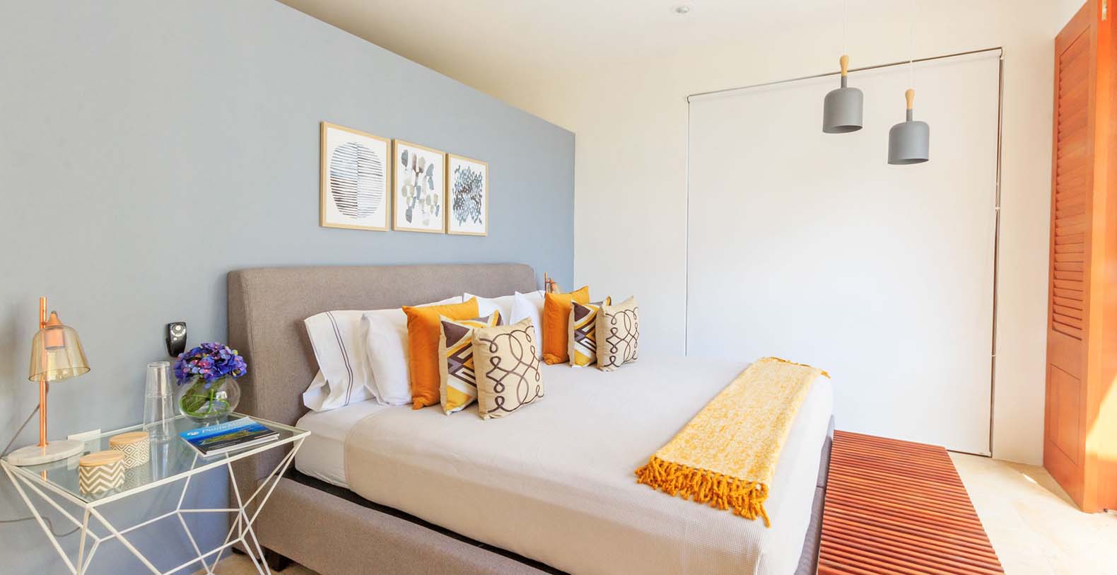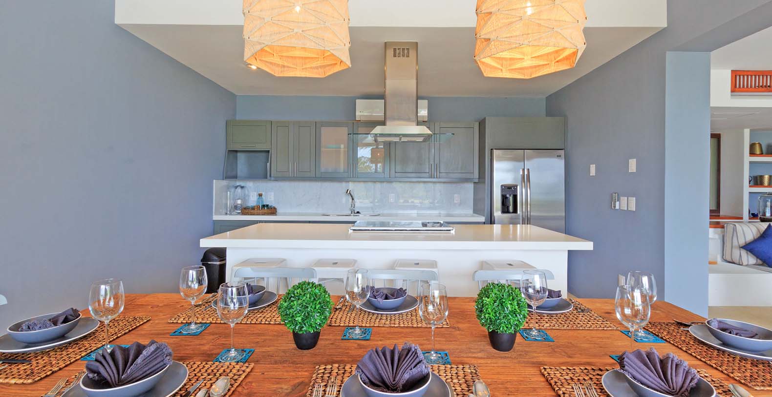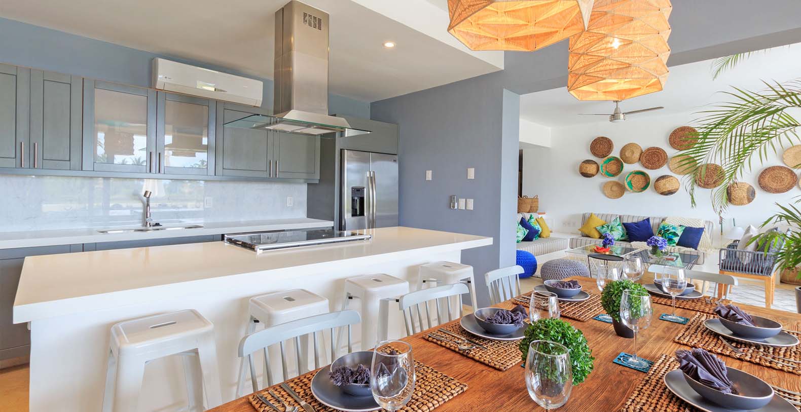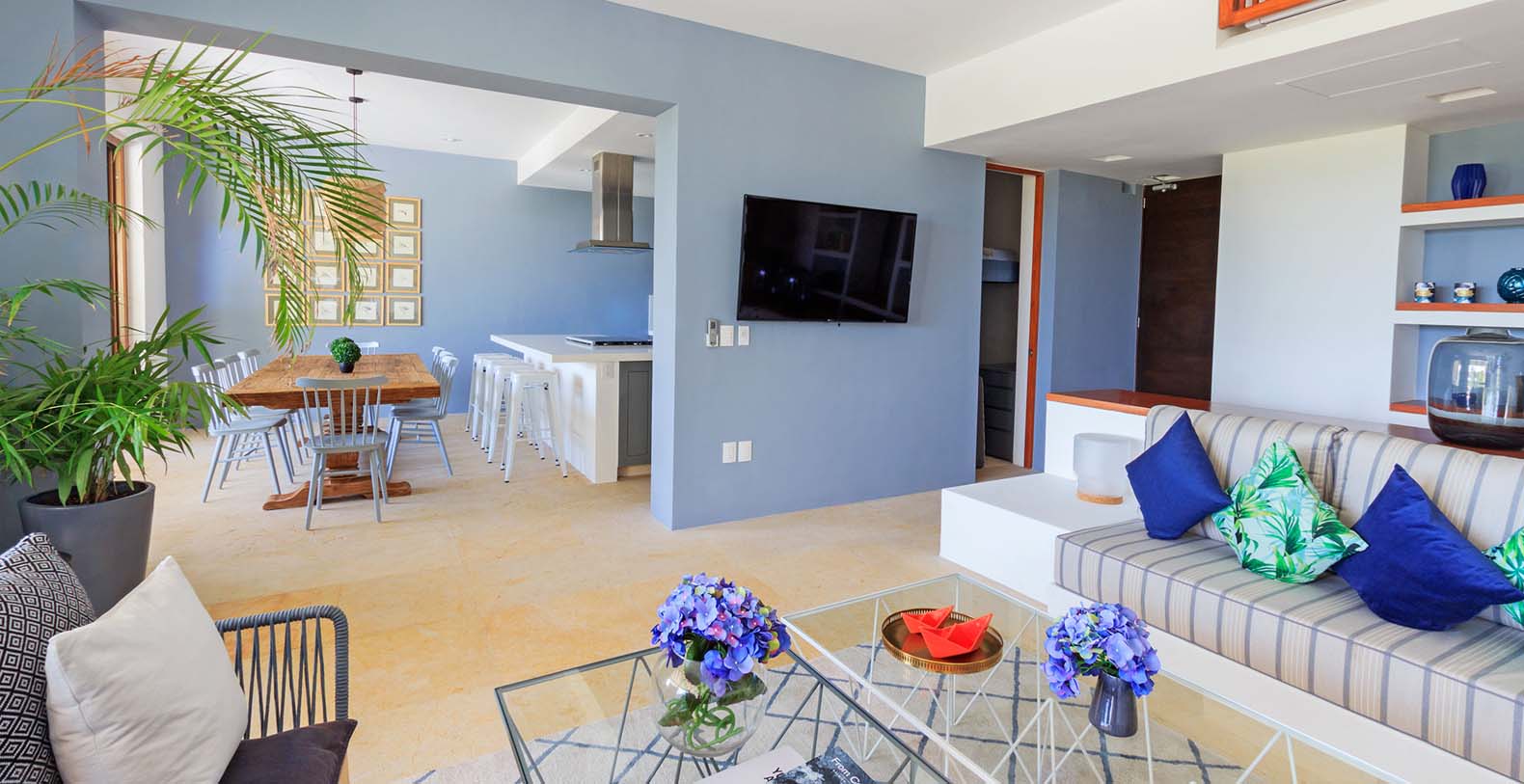 Condo Terramar itself offers 3,600 square feet of combined indoor and outdoor living space, accommodating up to 10 guests in style. The highlight is a 1,050 square-foot terrace with both shaded and open-air areas, ideal for alfresco dining, lounging under the sun, or enjoying evening cocktails with panoramic views. Indoors, the residence is thoughtfully decorated with modern, designer furnishings, bright living spaces, and large sliding glass doors that invite natural light and breezes throughout.