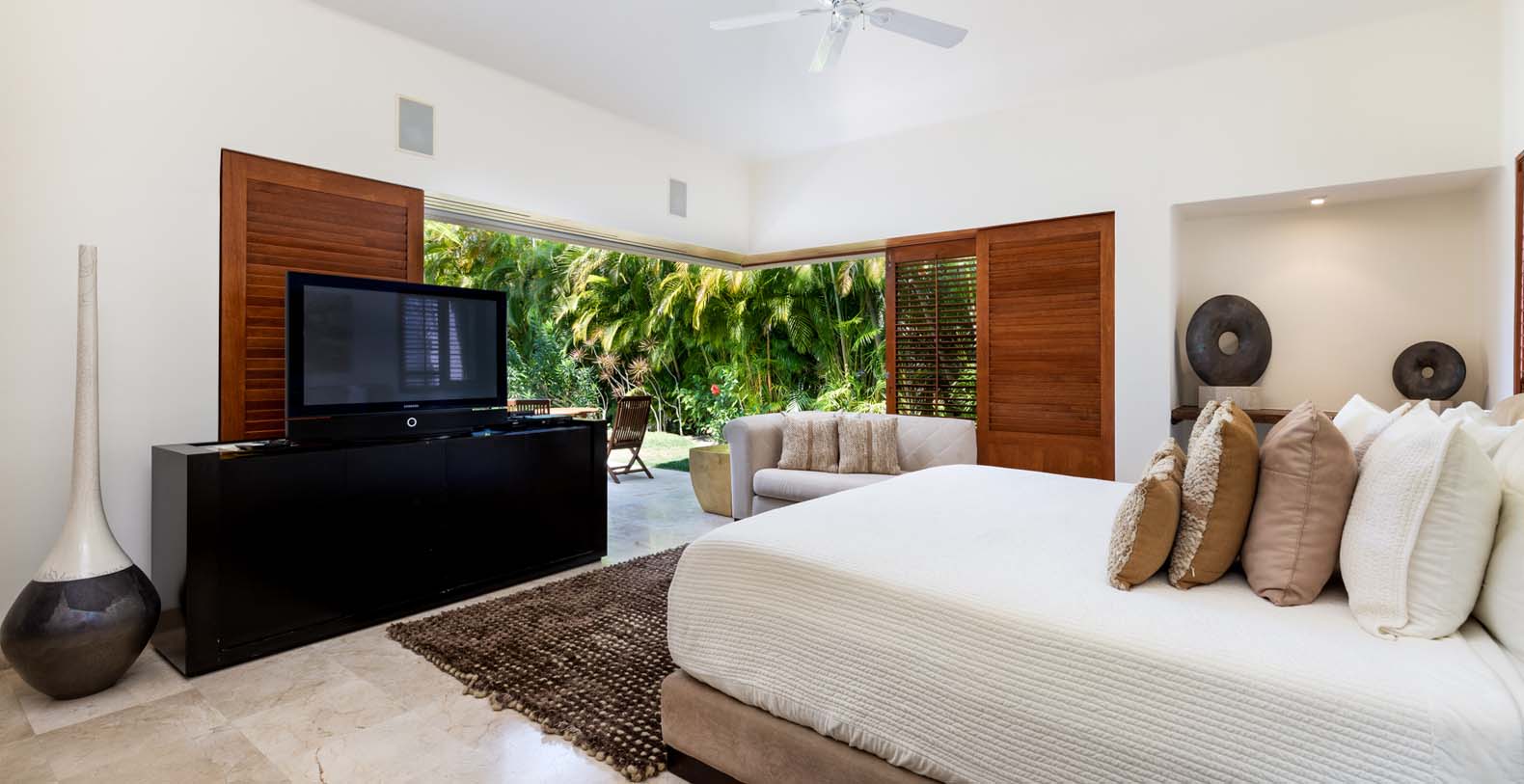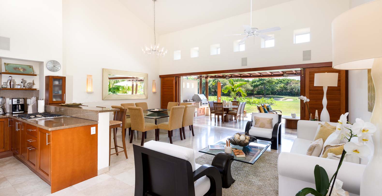 From the moment you step inside, the villa feels like a true sanctuary. A bright open-plan layout brings together a stylish living area, formal dining space, and a fully equipped kitchen with a breakfast bar. Sliding doors open to an expansive covered terrace where you can lounge on cushioned daybeds, gather around the alfresco dining table, or prepare fresh meals on the built-in outdoor grill. Ceiling fans and natural wood finishes create a relaxed tropical ambience throughout.