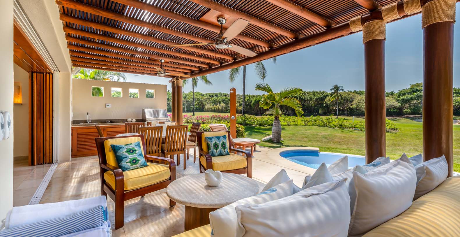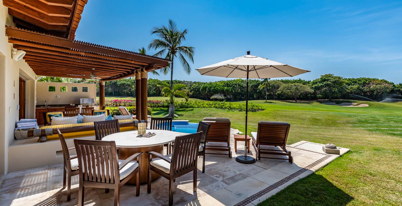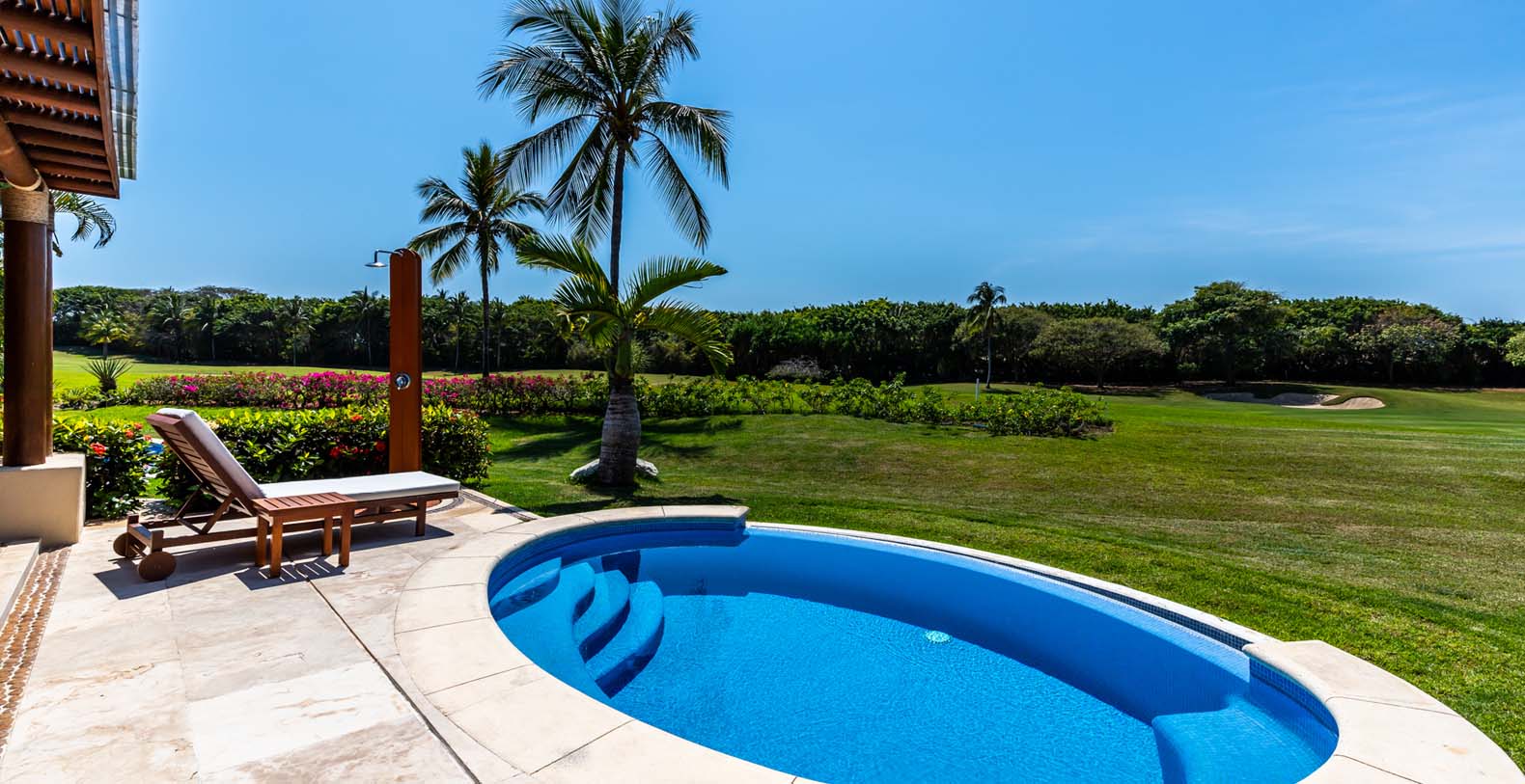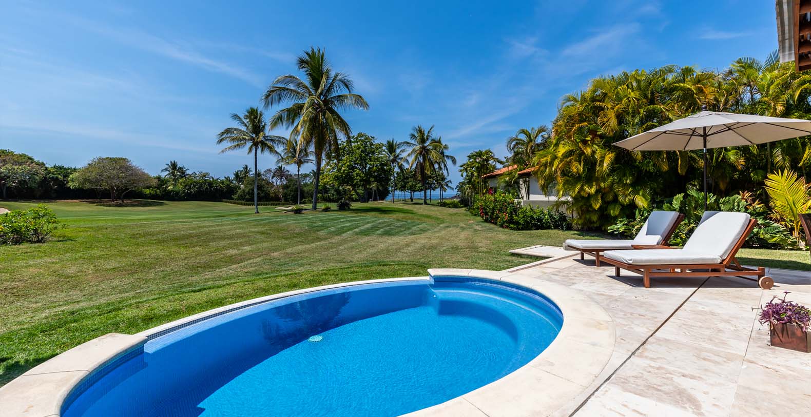 Las Palmas 5 is a private vacation oasis in the Heart of Punta Mita. Near the 4th fairway of the Jack Nicklaus Signature Pacifico Golf course, where you can see the famous ‘Tail of the Whale’ island green, this amazing vacation villa embodies Punta Mita’s open-air lifestyle. Crafted as a single level, three bedroom, three bath villa, it features golf course and partial ocean view and living/dining room that opens onto an expansive terrace with outdoor dining and your own plunge pool. Guests are just a 5 minute walk to the Residents’ Beach Club, which is only accessible by members and guests of Punta Mita. Las Palmas 5 is in-between Four Seasons Resort and the St. Regis, two of the finest spots to enjoy lunch or dinner.