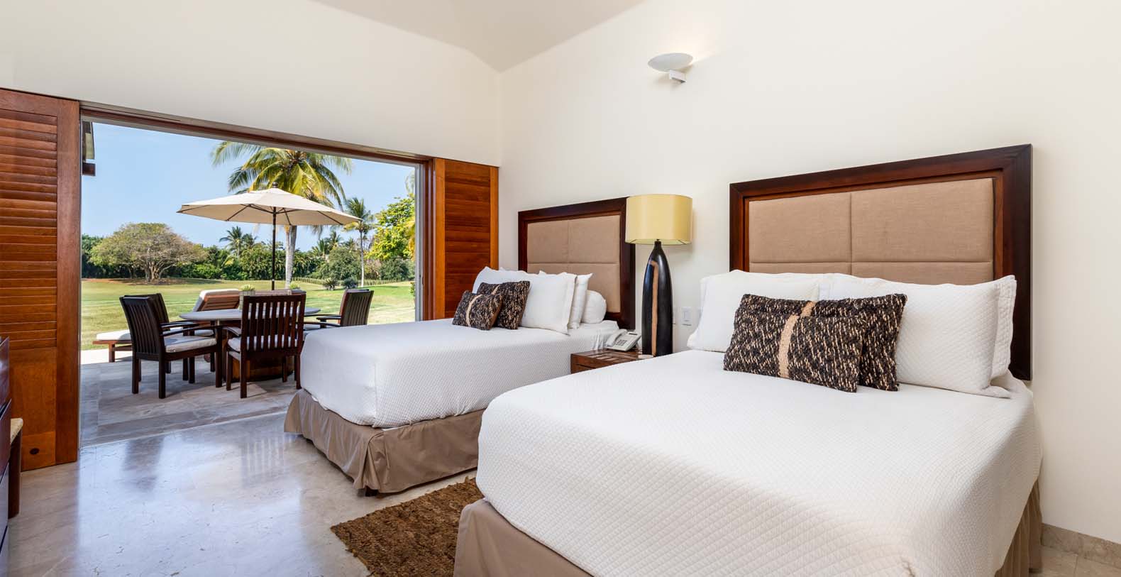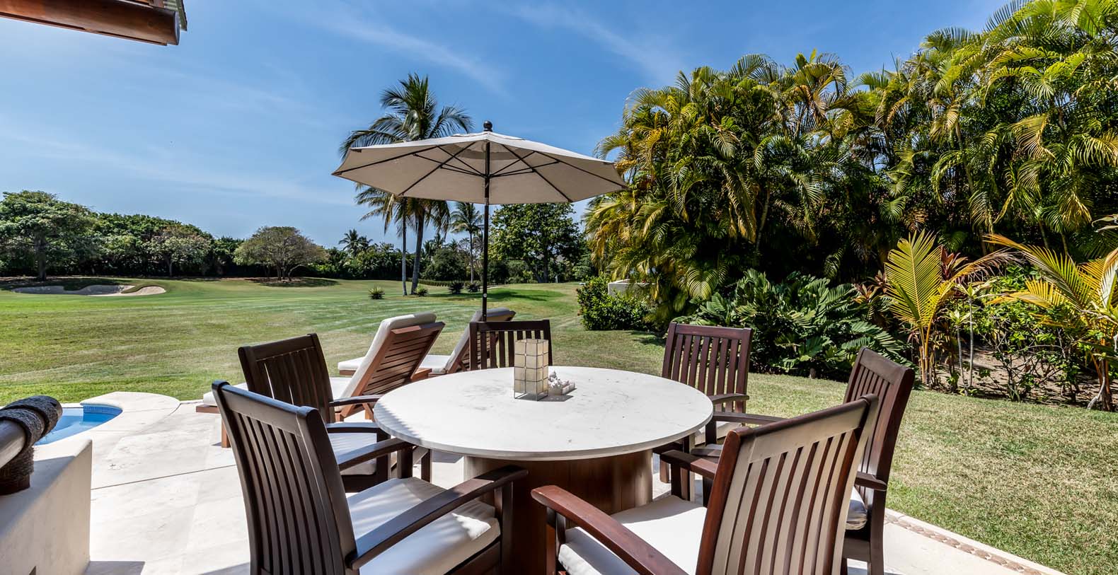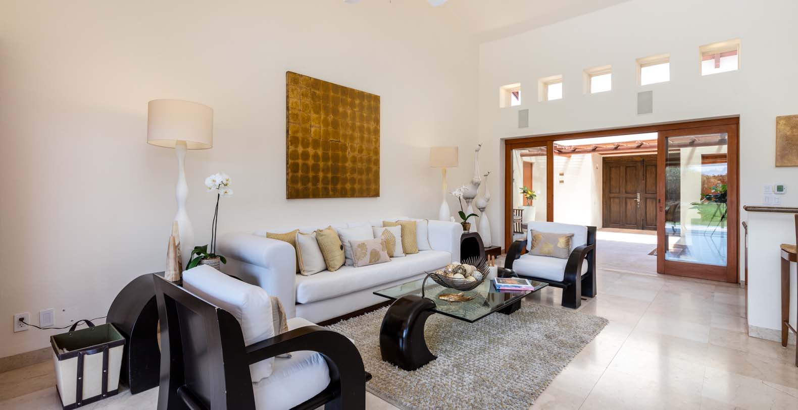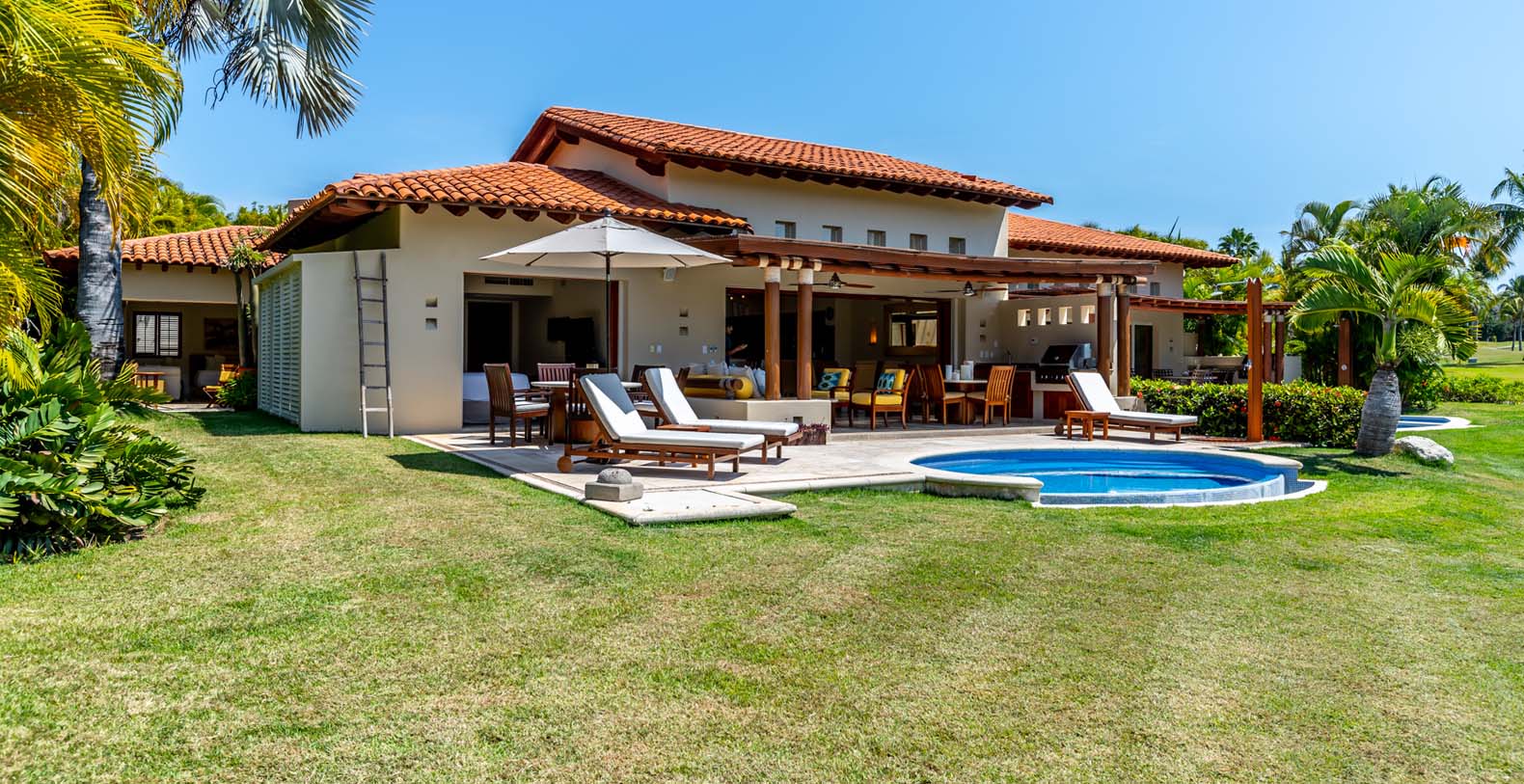 Las Palmas 5 is a private vacation oasis in the Heart of Punta Mita. Near the 4th fairway of the Jack Nicklaus Signature Pacifico Golf course, where you can see the famous ‘Tail of the Whale’ island green, this amazing vacation villa embodies Punta Mita’s open-air lifestyle. Crafted as a single level, three bedroom, three bath villa, it features golf course and partial ocean view and living/dining room that opens onto an expansive terrace with outdoor dining and your own plunge pool. Guests are just a 5 minute walk to the Residents’ Beach Club, which is only accessible by members and guests of Punta Mita. Las Palmas 5 is in-between Four Seasons Resort and the St. Regis, two of the finest spots to enjoy lunch or dinner.