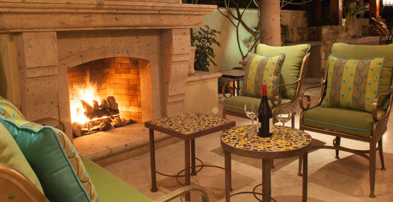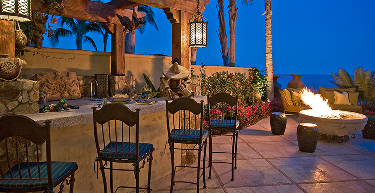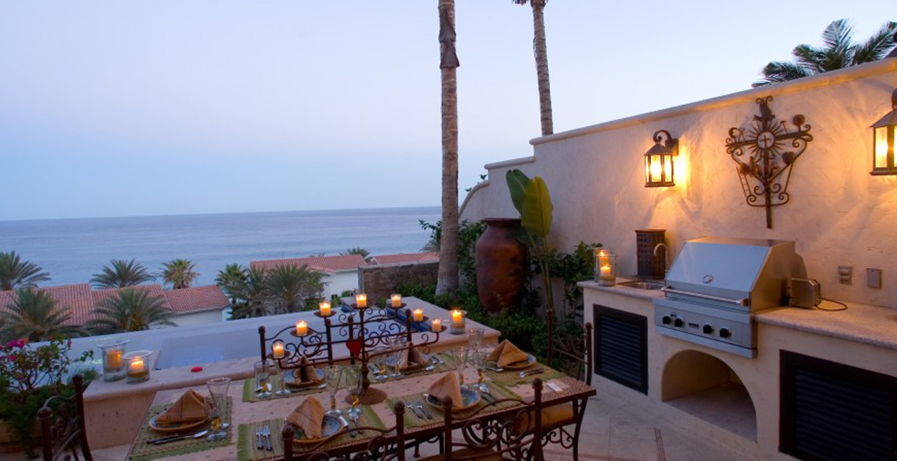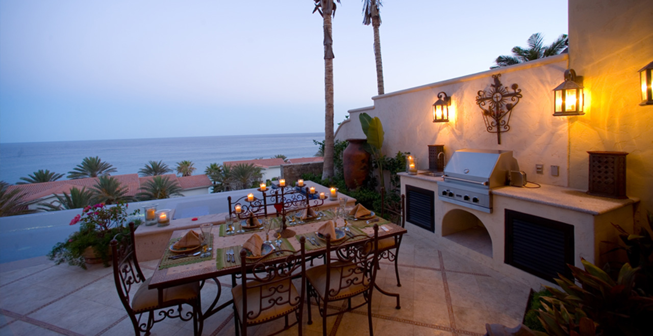 Dining Areas: Two dining areas provide plenty of opportunities for shared meals in paradise. The interior dining area can seat eight for dinner in view of the Sea of Cortez through one set of French doors, and through the other, enjoy a view of the interior courtyard with its stone fountain and palms. To accent this dining area, the design team undertook a multi-town search throughout Mexico for authentic art and uncovered several gorgeous pieces. With its hand-carved side table, hand-forged iron chandelier, and caramel leather chairs, this indoor dining space also makes for a stately yet tranquil place for a business meeting, as well. Meanwhile, the outdoor dining area showcases Sea of Cortez views and evening breezes. Put a flame to the candelabra, sear some steaks at the nearby gas grill, uncork a bottle of wine, and revel in life!