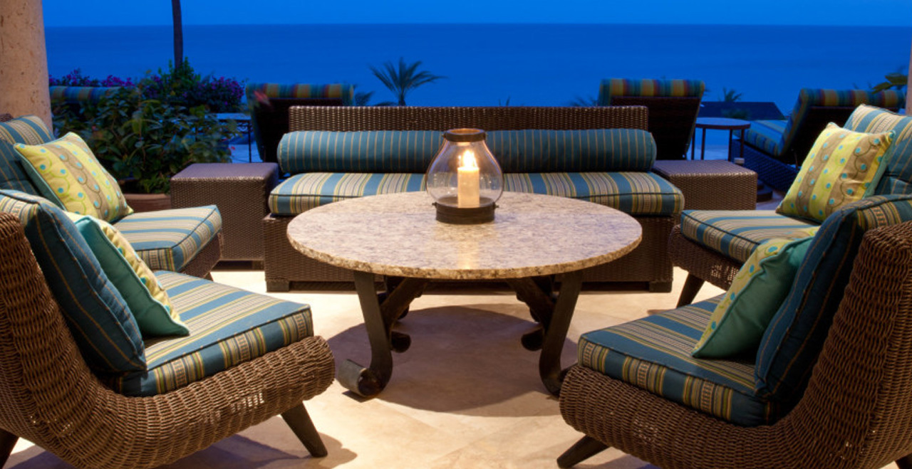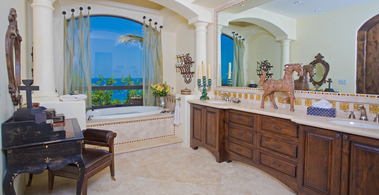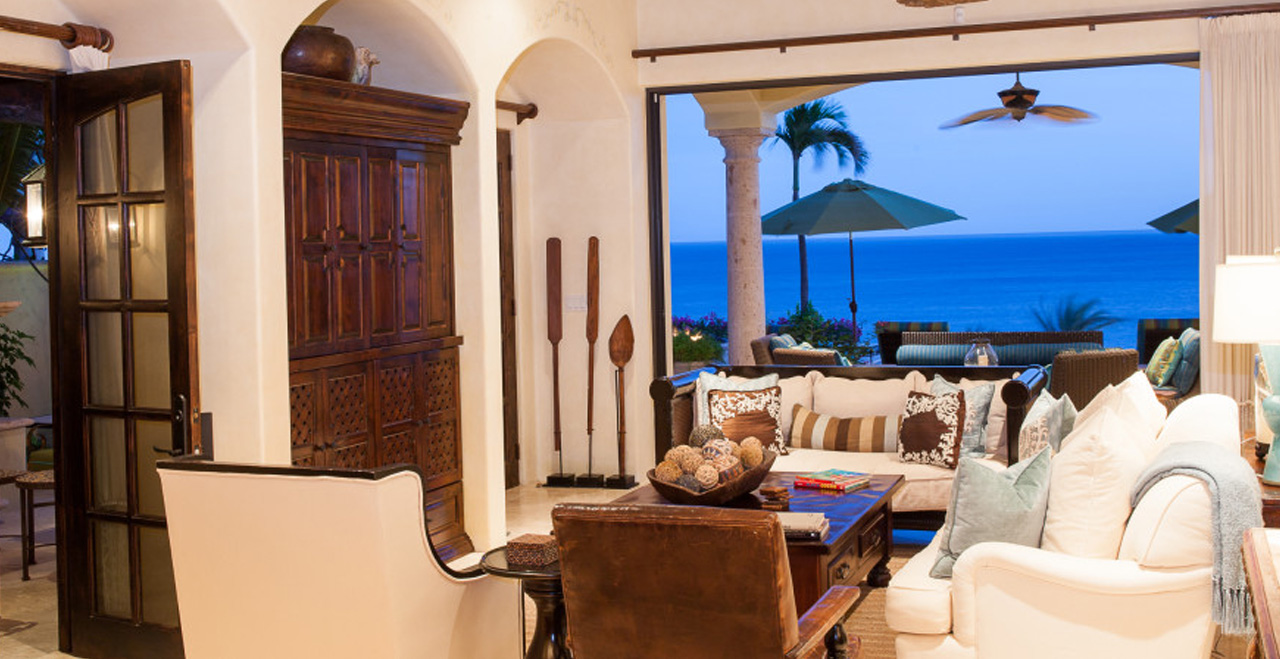 Speaking of small pleasures: when you arrive at Suenos del Mar, a work-of-art entryway welcomes you. Iron hanging baskets overflow with flowers against the circular stone portico, and overhead, an iron dome creates an intricate latticework accent against the sky. Just inside the entry, find the courtyard with its bistro table and fountain a transition space to the residence proper, with entrances for both the villa and the guest villa. Push through the wood doors of the villa, and you’ll find a second stunning entrance a two-story circular foyer crowned with a dramatic iron chandelier, and beyond it, through the living area, a sweeping view of endless blue sky and sea.