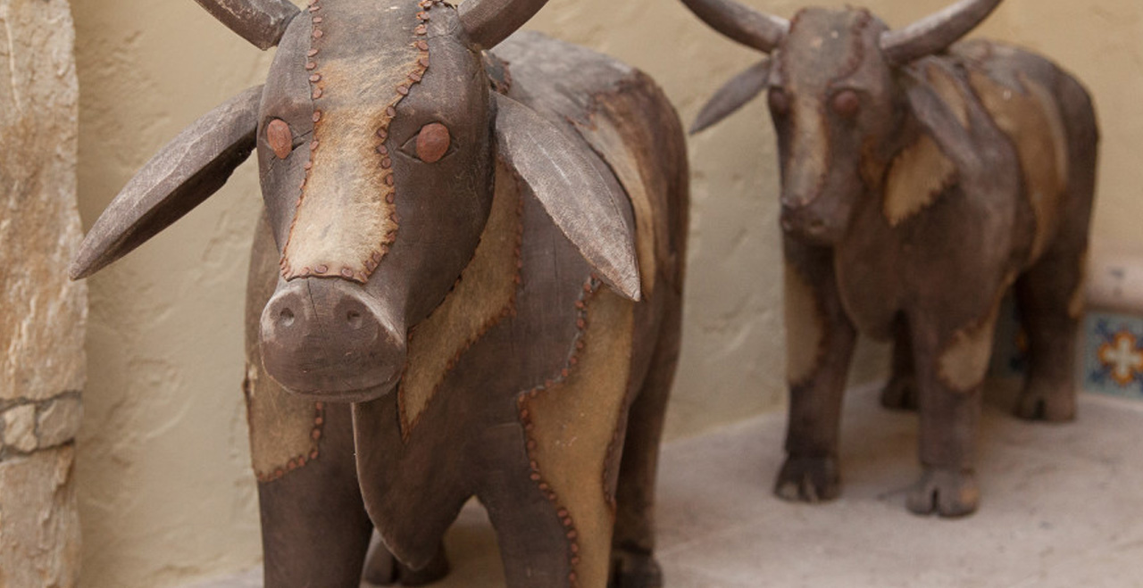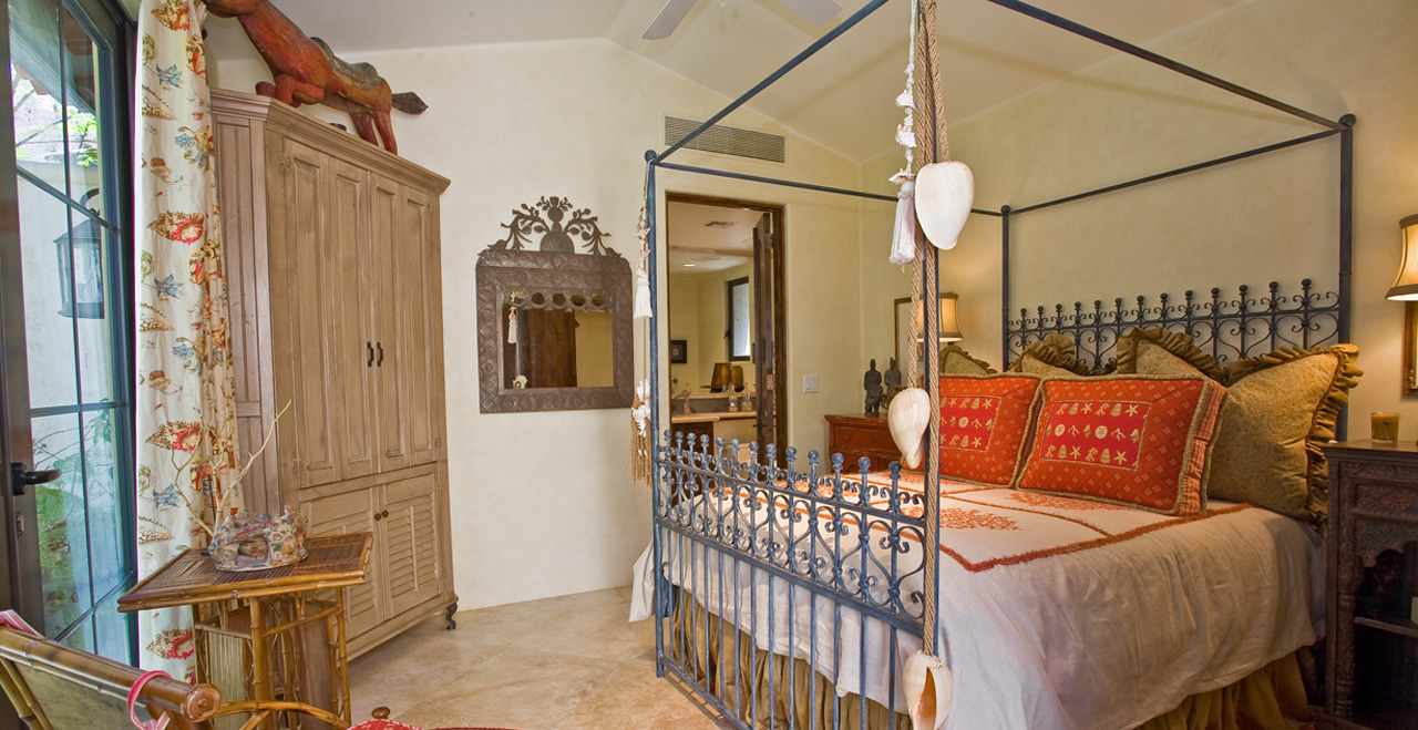 The Seashell Suite: This suite boasts a queen-sized bed with an iron canopy and custom fabrics. A sliding glass door leads to the courtyard, which is shared with the Courtyard Suite. An en-suite bathroom provides a large walk-in shower that opens to outdoors. Guests are welcomed to this suite with two antique, hand-painted bulls from Mexico – representing the rich and celebrated bull-fighting culture of Spain.
